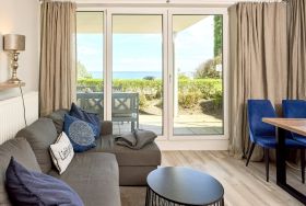 Diese gemütliche 3-Zimmer-Ferienwohnung bietet Ihnen neben dem traumhaften Blick auf die Lübecker Bucht und die Ostsee alles, was Ihr Urlaubsherz begehrt. Der Wohn-Essbereich ist geschmackvoll eingerichtet und verfügt über SAT/Kabel-TV und einen kostenlosen WLAN-Anschluss. Aus dem Wohnzimmer gelangen Sie auf die erste Terrasse Richtung Osten und können den Blick über die Ostsee schweifen lassen. Das gemütliche Schlafzimmer ist mit einem geräumigen Kleiderschrank, einem Boxspringbett