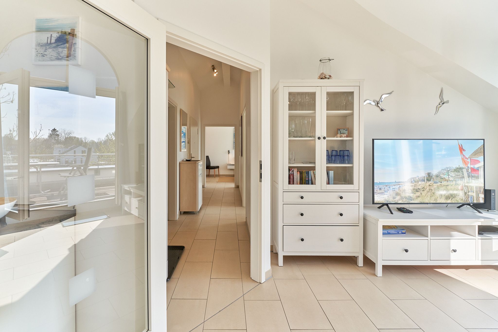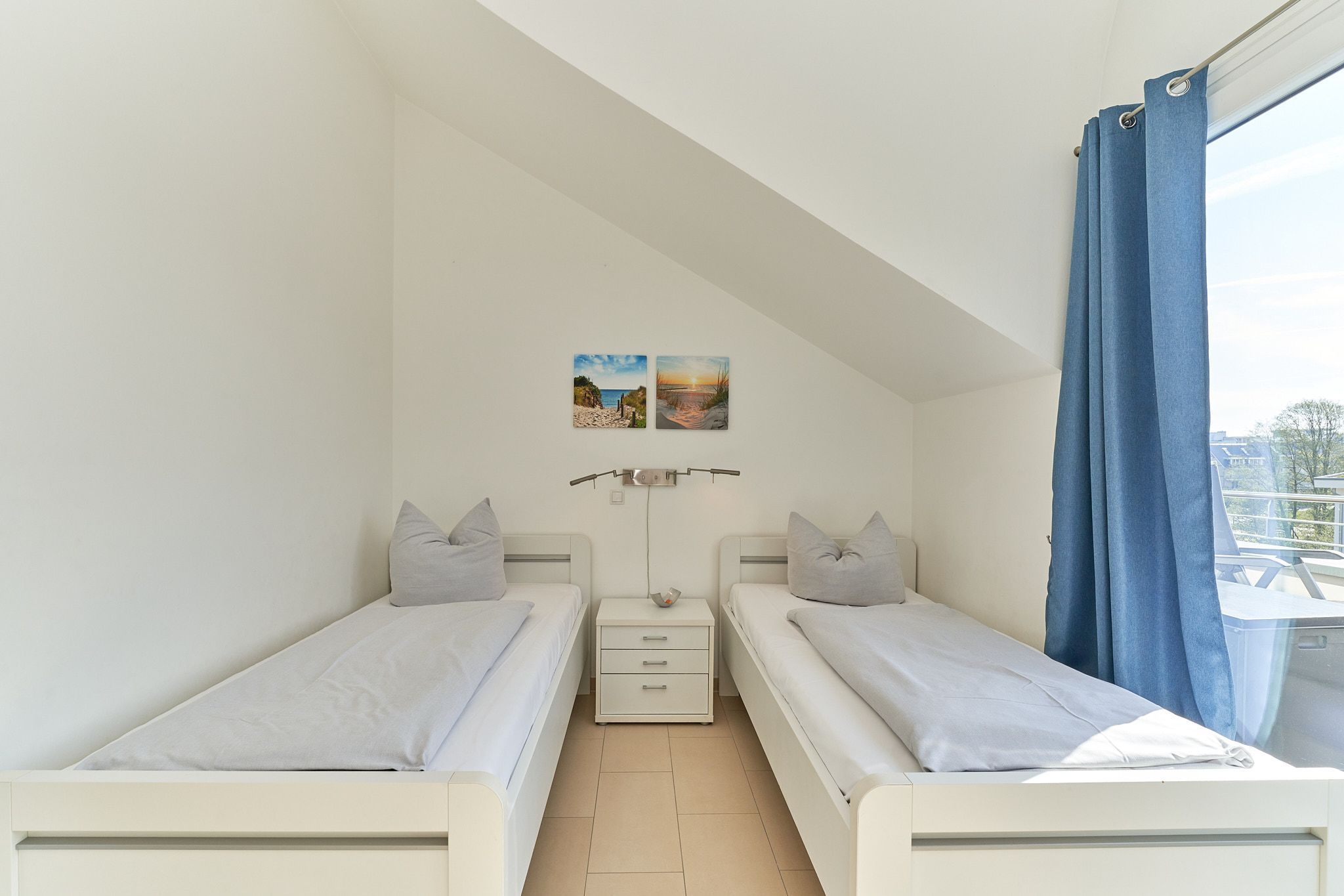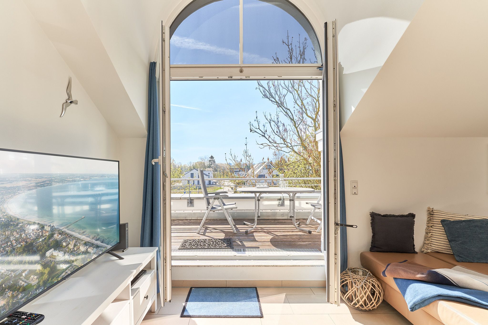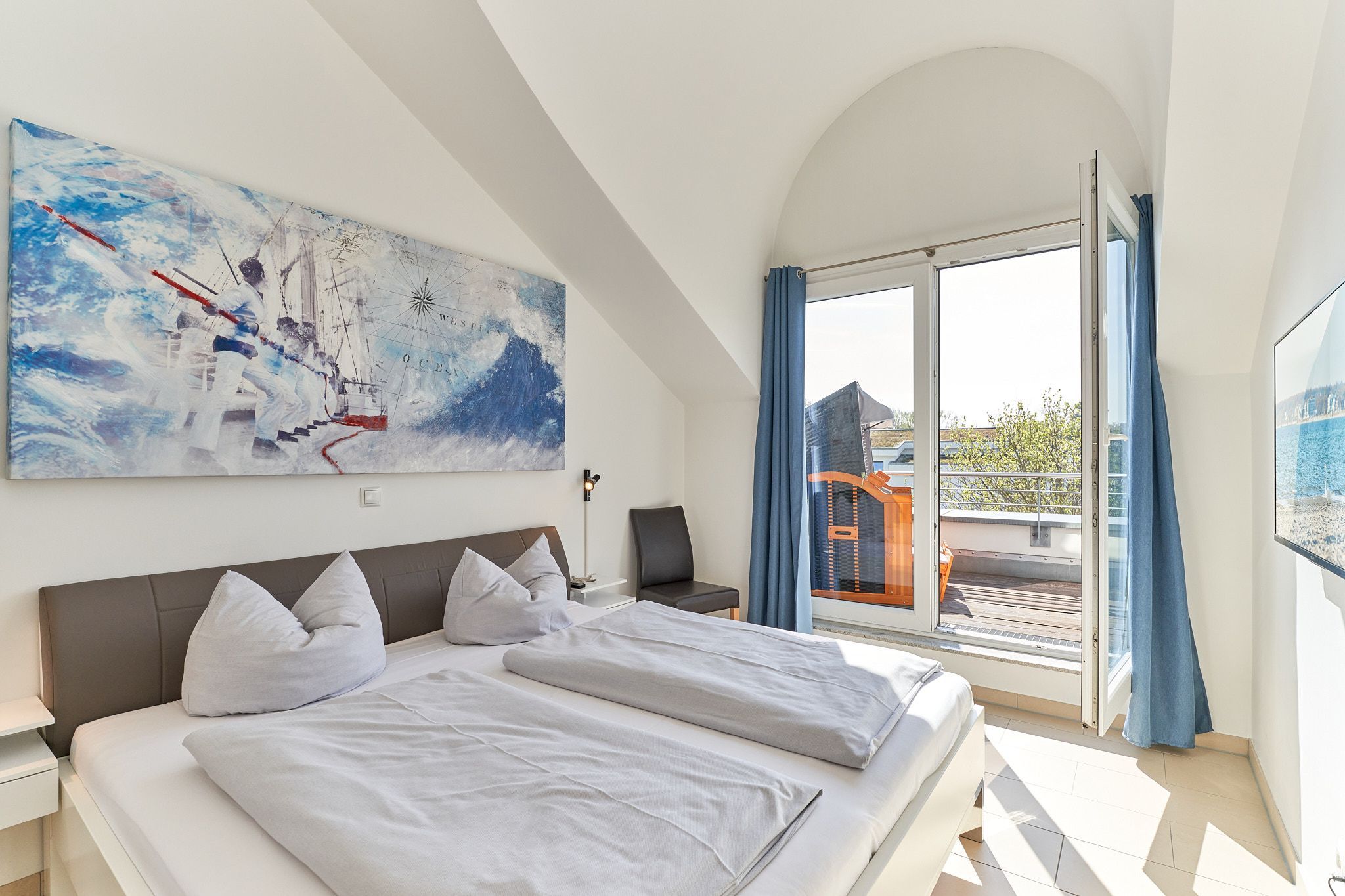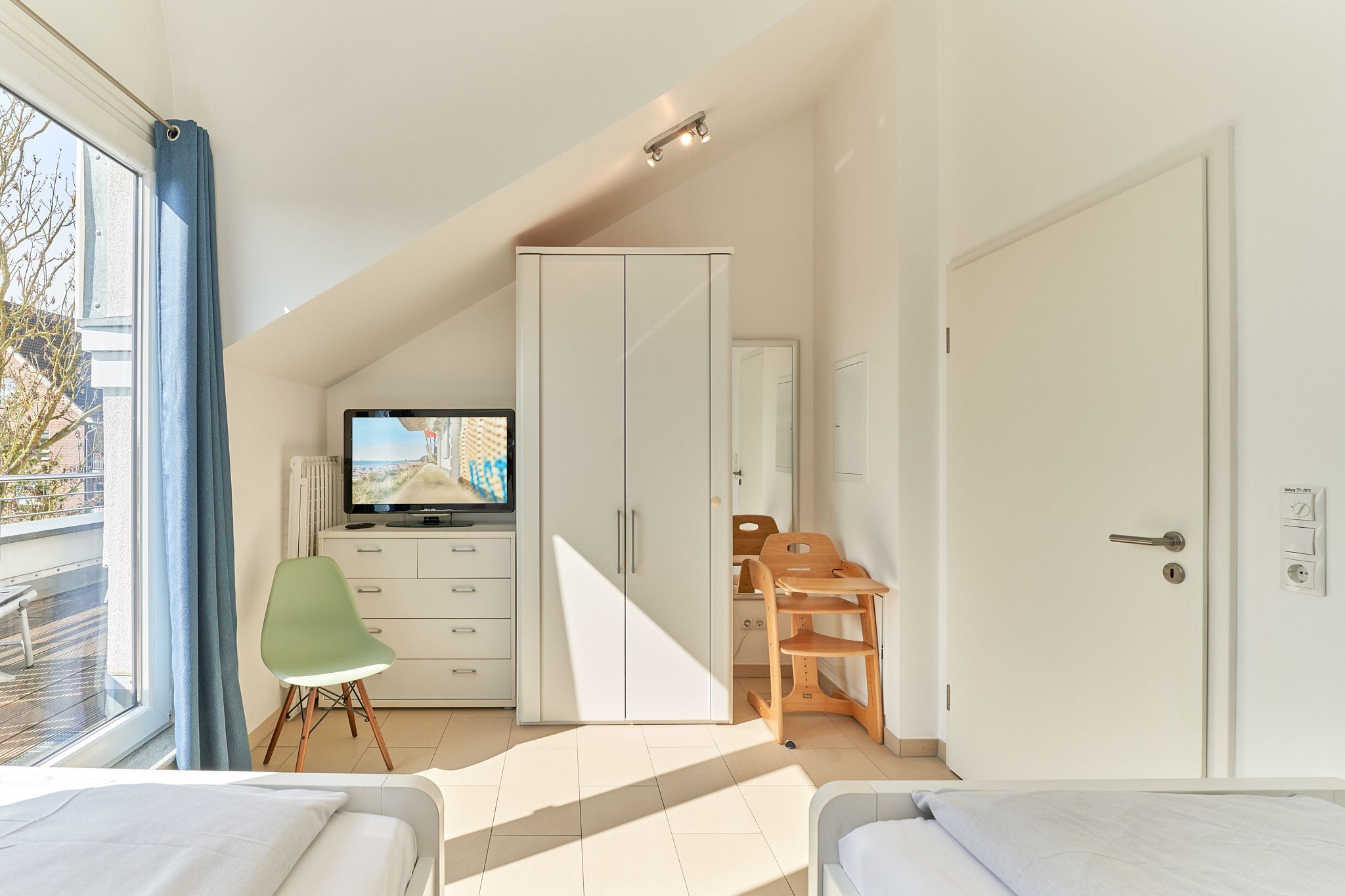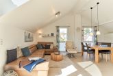 Genießen Sie Ihren Urlaub in dieser lichtdurchfluteten Ferienwohnung, die Ihnen mit ihren zwei Schlafzimmern und dem großen Wohnzimmer mit integrierter Küche, großem Esstisch, Relaxsessel und gemütlicher Fernsehecke, inklusive Musikanlage und Blu-ray-Player, viel Raum zum Entspannen bietet. WLAN steht Ihnen kostenlos zur Verfügung. Die nach Süden ausgerichtete, großzügige Sonnenterrasse ist vom Wohnzimmer und von beiden Schlafzimmern aus zu betreten. Hier stehen Tisch, Stühle, Liegen und ein Strandkorb für Sie bereit. Die Schlafzimmer sind mit Verdunklungsvorhängen und Flachbildfernsehern ausgestattet (Bettenbreite Einzelbetten 1,00 x 2,00m, Doppelbett 1,80x2,00m). Das helle Badezimmer mit Tageslicht verfügt über eine bodentiefe Dusche, Fußbodenheizung, Handtuchheizkörper, Waschmaschine und Wandwickeltisch.