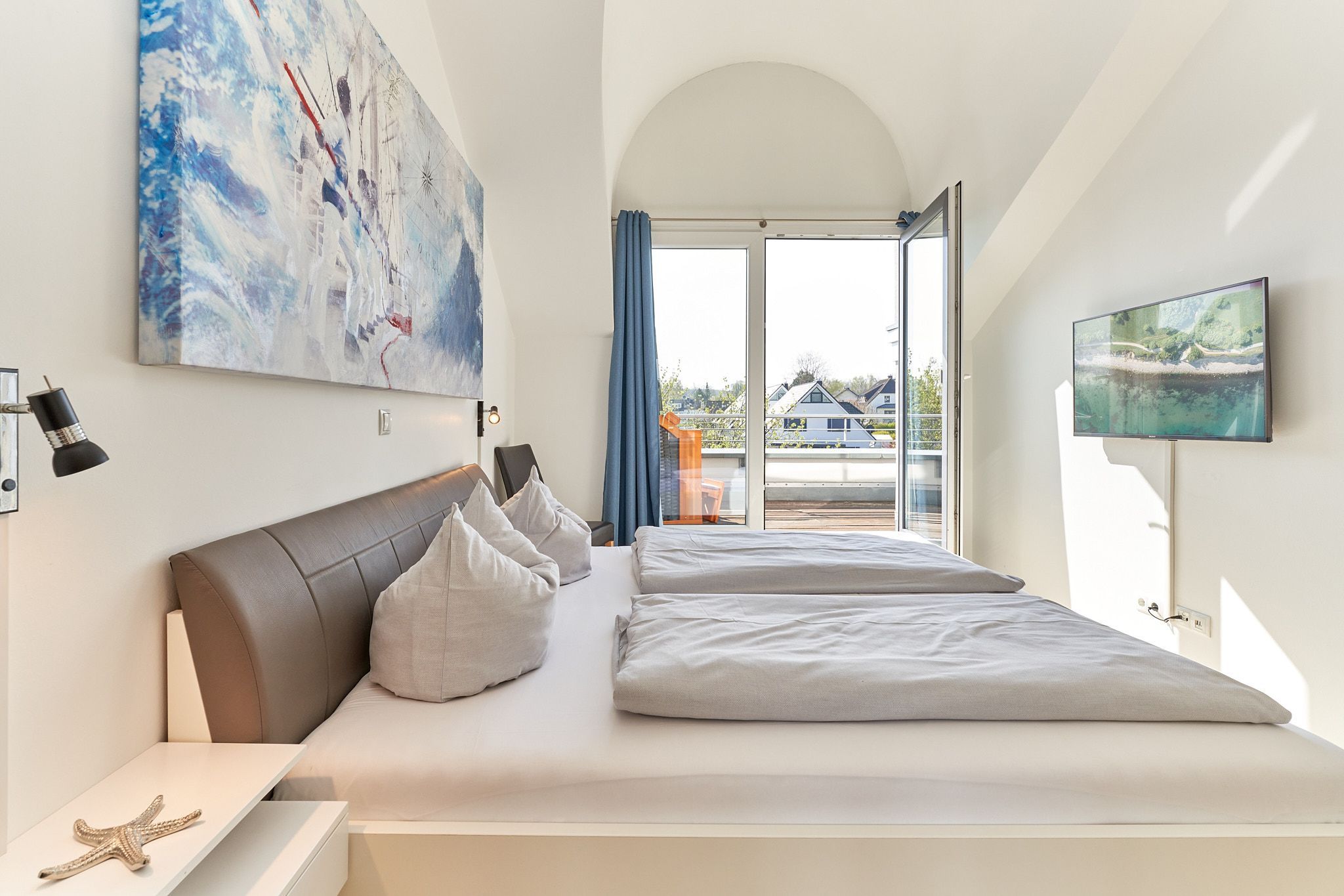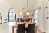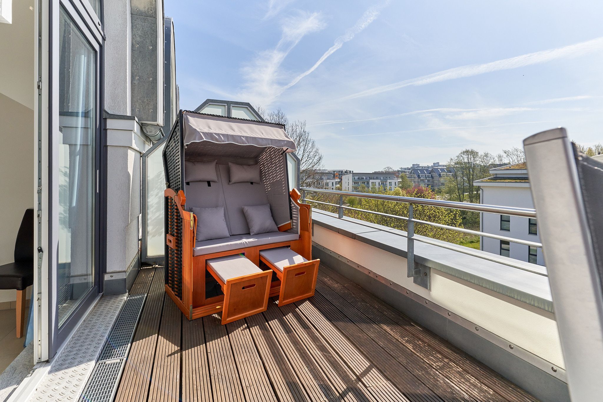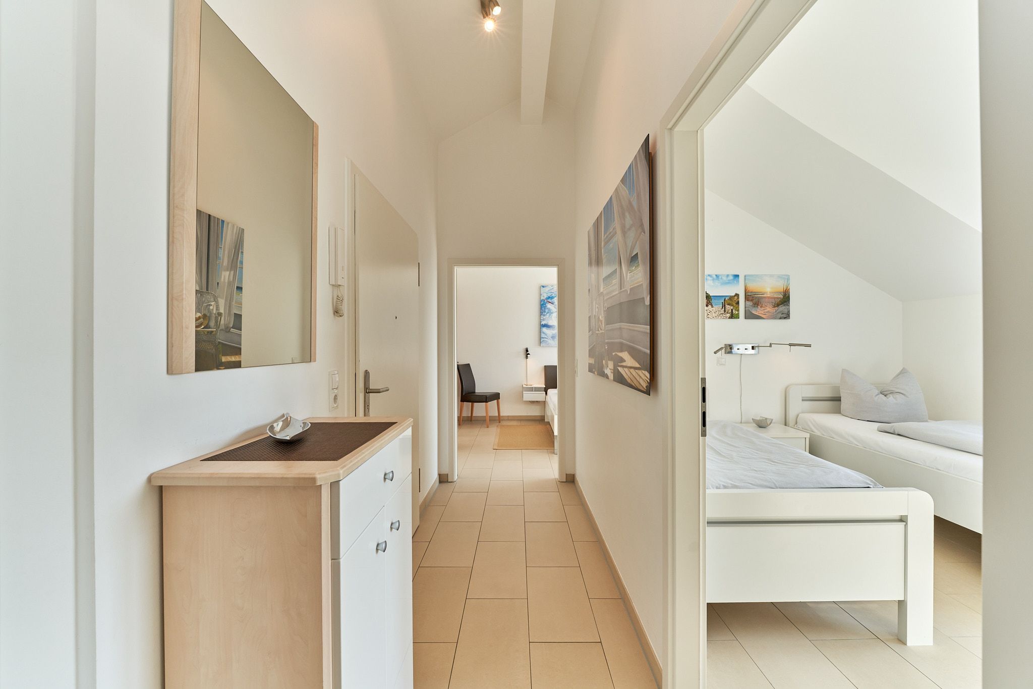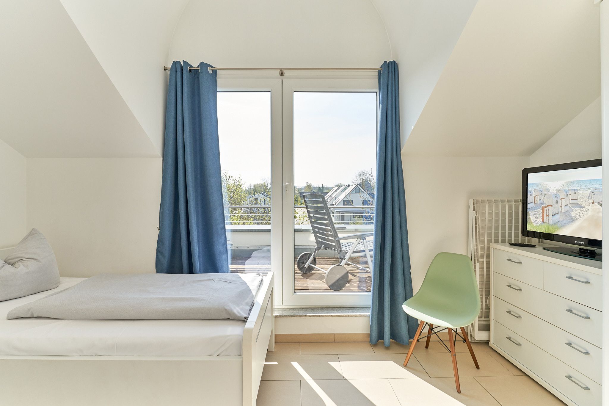 Genießen Sie Ihren Urlaub in dieser lichtdurchfluteten Ferienwohnung, die Ihnen mit ihren zwei Schlafzimmern und dem großen Wohnzimmer mit integrierter Küche, großem Esstisch, Relaxsessel und gemütlicher Fernsehecke, inklusive Musikanlage und Blu-ray-Player, viel Raum zum Entspannen bietet. WLAN steht Ihnen kostenlos zur Verfügung. Die nach Süden ausgerichtete, großzügige Sonnenterrasse ist vom Wohnzimmer und von beiden Schlafzimmern aus zu betreten. Hier stehen Tisch, Stühle, Liegen und ein Strandkorb für Sie bereit. Die Schlafzimmer sind mit Verdunklungsvorhängen und Flachbildfernsehern ausgestattet (Bettenbreite Einzelbetten 1,00 x 2,00m, Doppelbett 1,80x2,00m). Das helle Badezimmer mit Tageslicht verfügt über eine bodentiefe Dusche, Fußbodenheizung, Handtuchheizkörper, Waschmaschine und Wandwickeltisch.