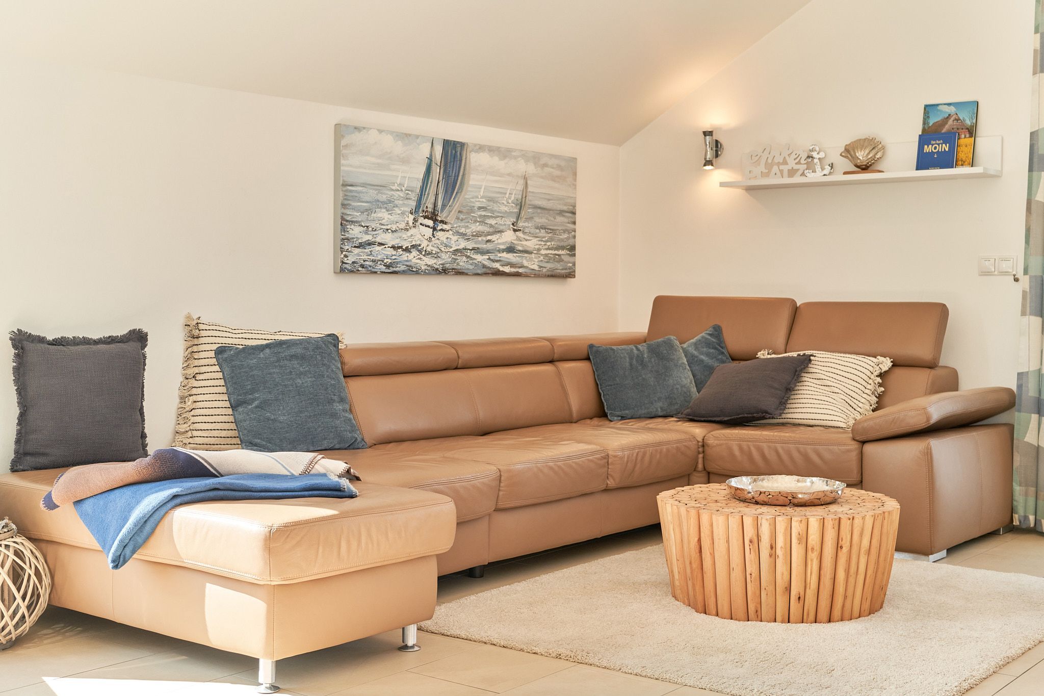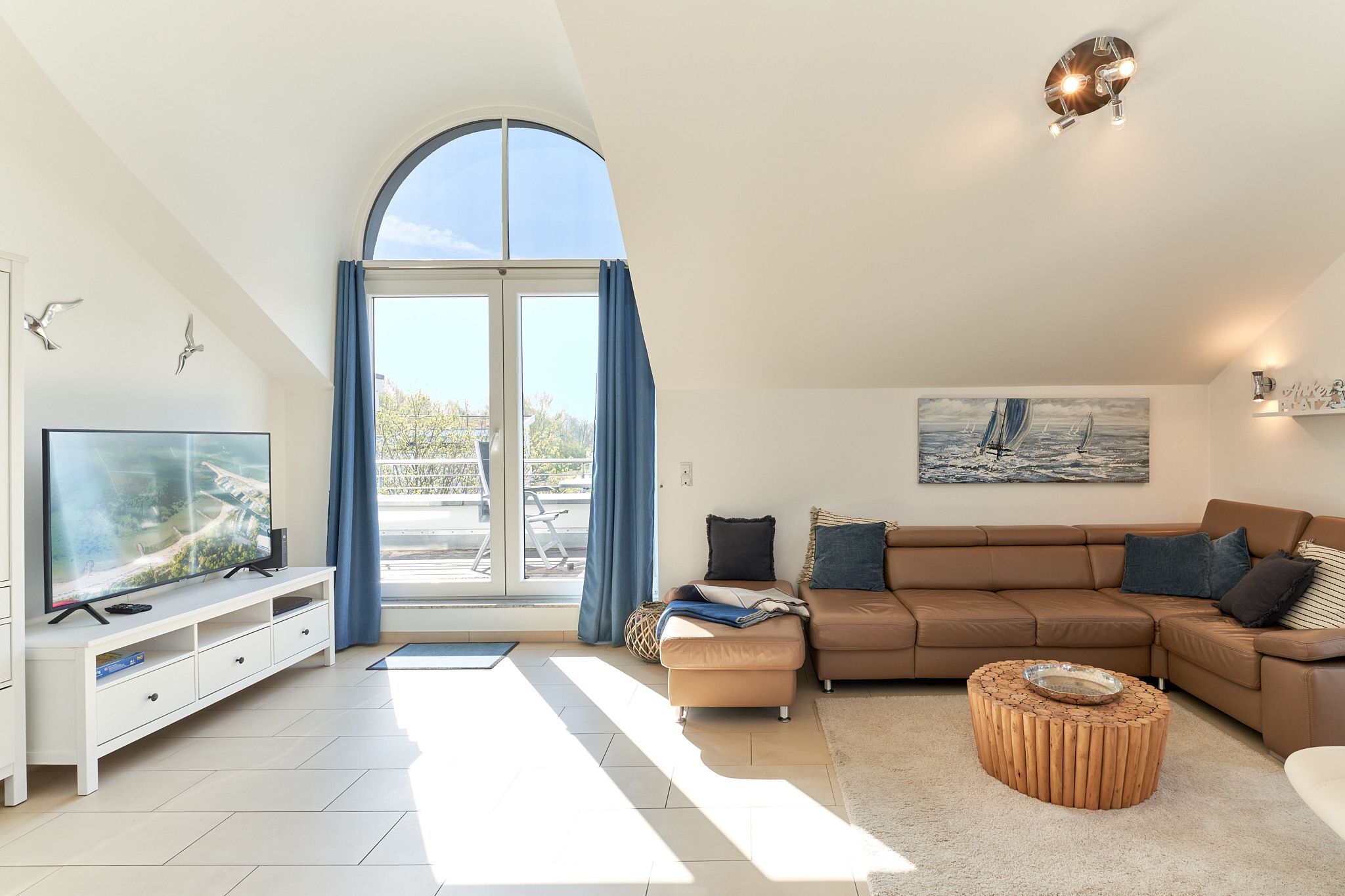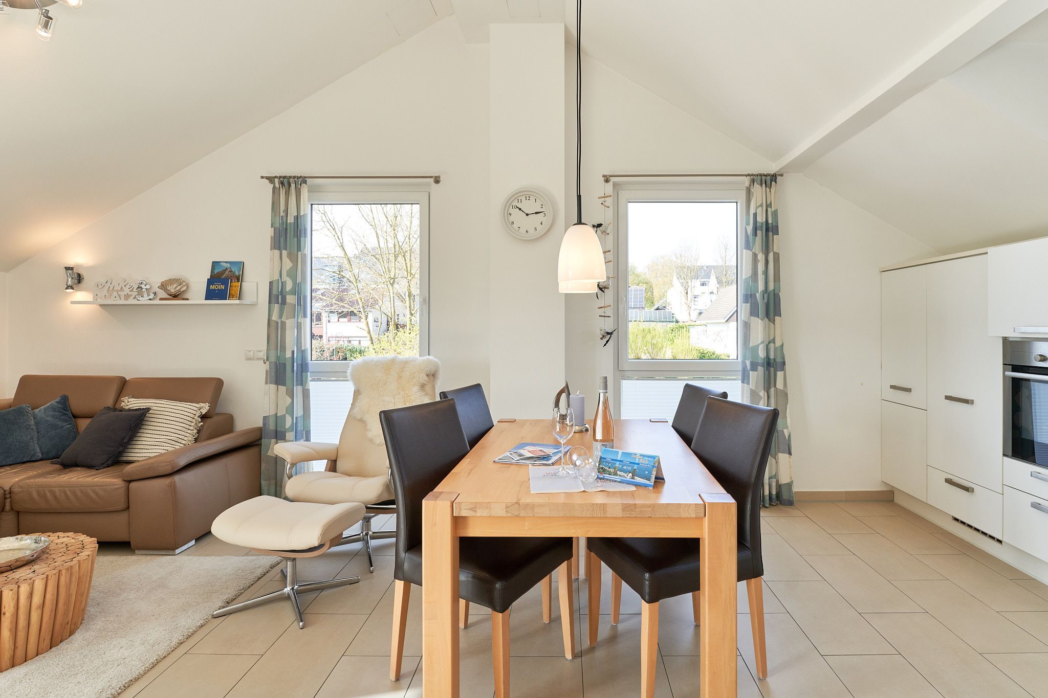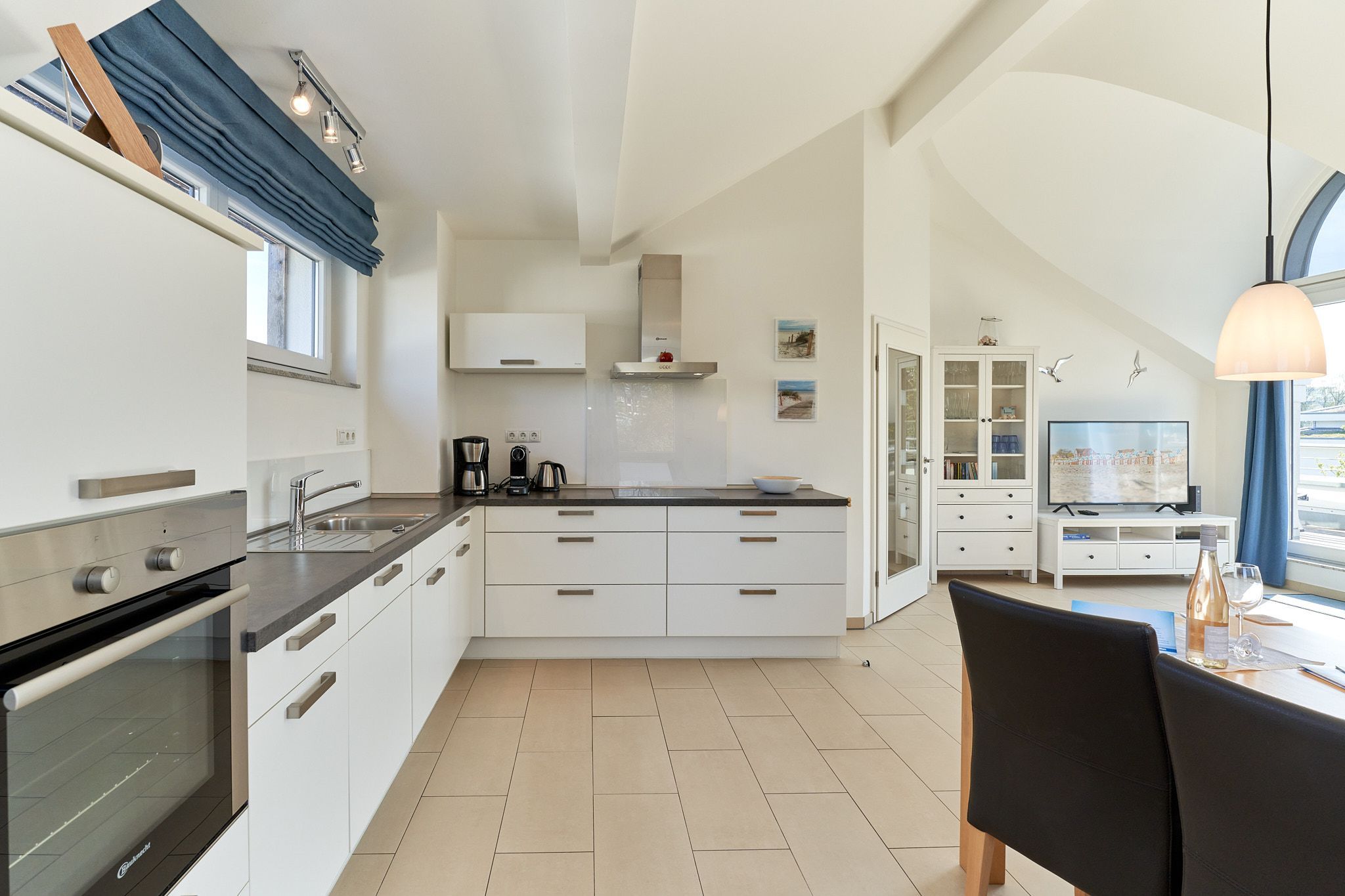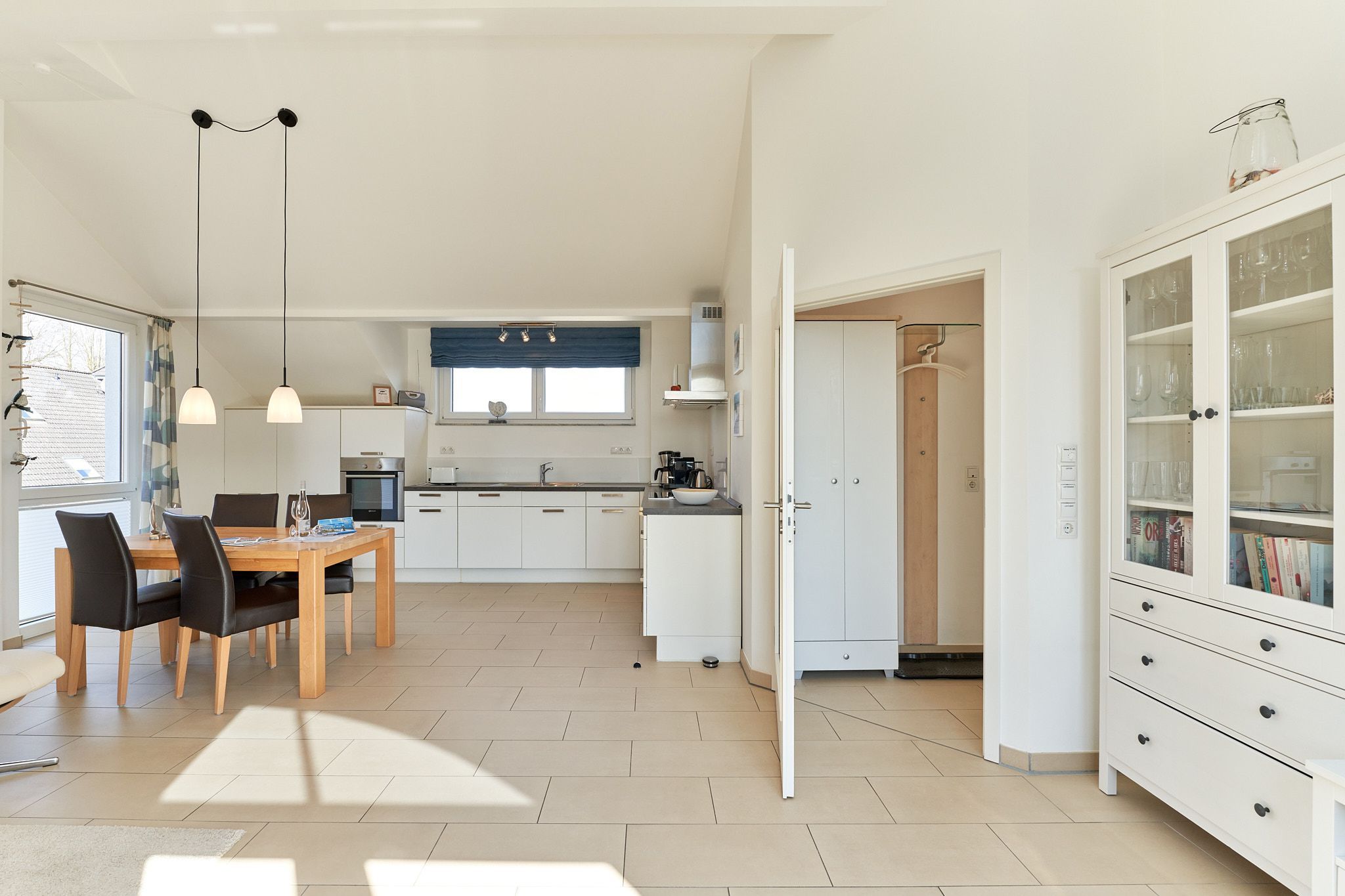 Genießen Sie Ihren Urlaub in dieser lichtdurchfluteten Ferienwohnung, die Ihnen mit ihren zwei Schlafzimmern und dem großen Wohnzimmer mit integrierter Küche, großem Esstisch, Relaxsessel und gemütlicher Fernsehecke, inklusive Musikanlage und Blu-ray-Player, viel Raum zum Entspannen bietet. WLAN steht Ihnen kostenlos zur Verfügung. Die nach Süden ausgerichtete, großzügige Sonnenterrasse ist vom Wohnzimmer und von beiden Schlafzimmern aus zu betreten. Hier stehen Tisch, Stühle, Liegen und ein Strandkorb für Sie bereit. Die Schlafzimmer sind mit Verdunklungsvorhängen und Flachbildfernsehern ausgestattet (Bettenbreite Einzelbetten 1,00 x 2,00m, Doppelbett 1,80x2,00m). Das helle Badezimmer mit Tageslicht verfügt über eine bodentiefe Dusche, Fußbodenheizung, Handtuchheizkörper, Waschmaschine und Wandwickeltisch.