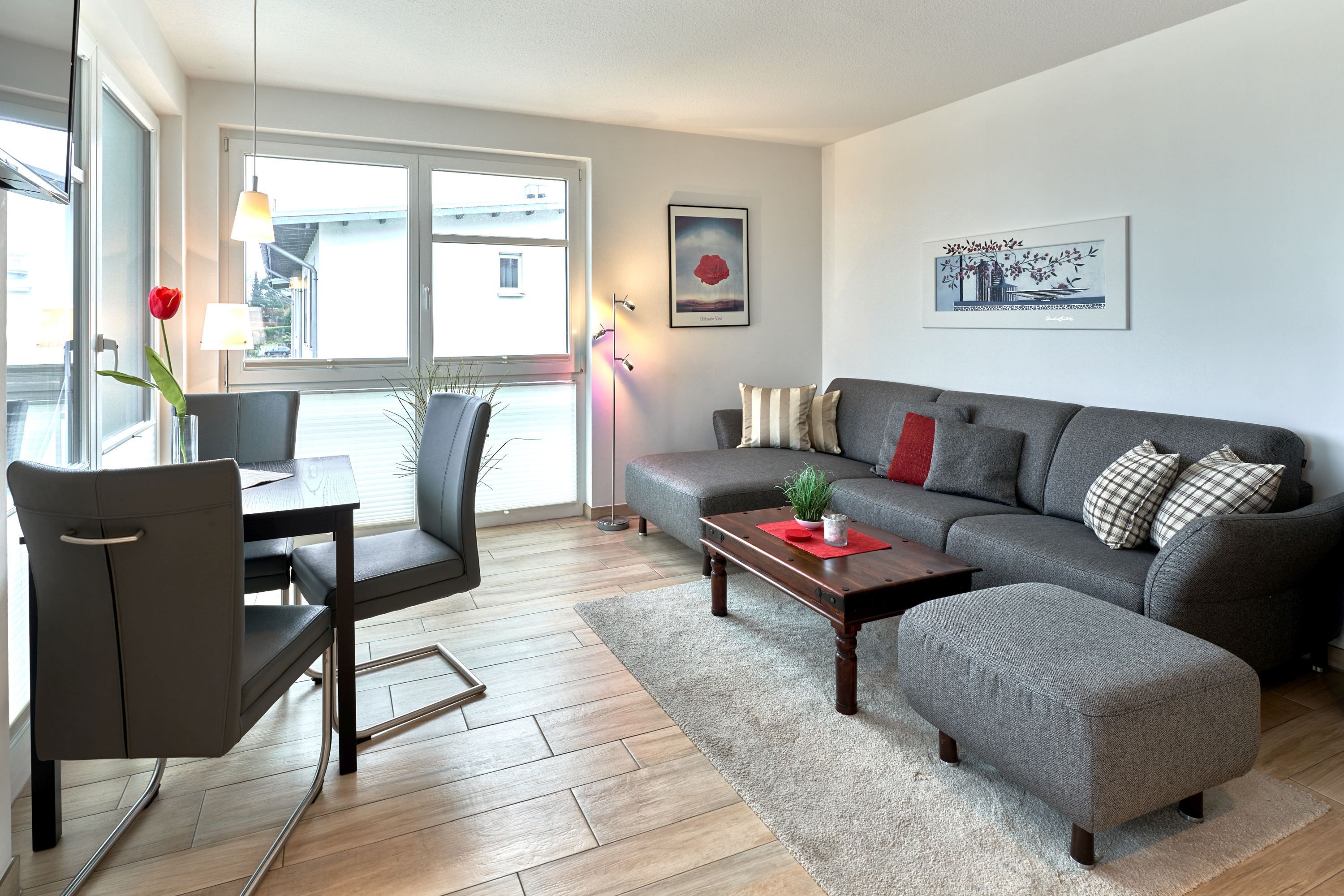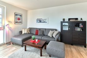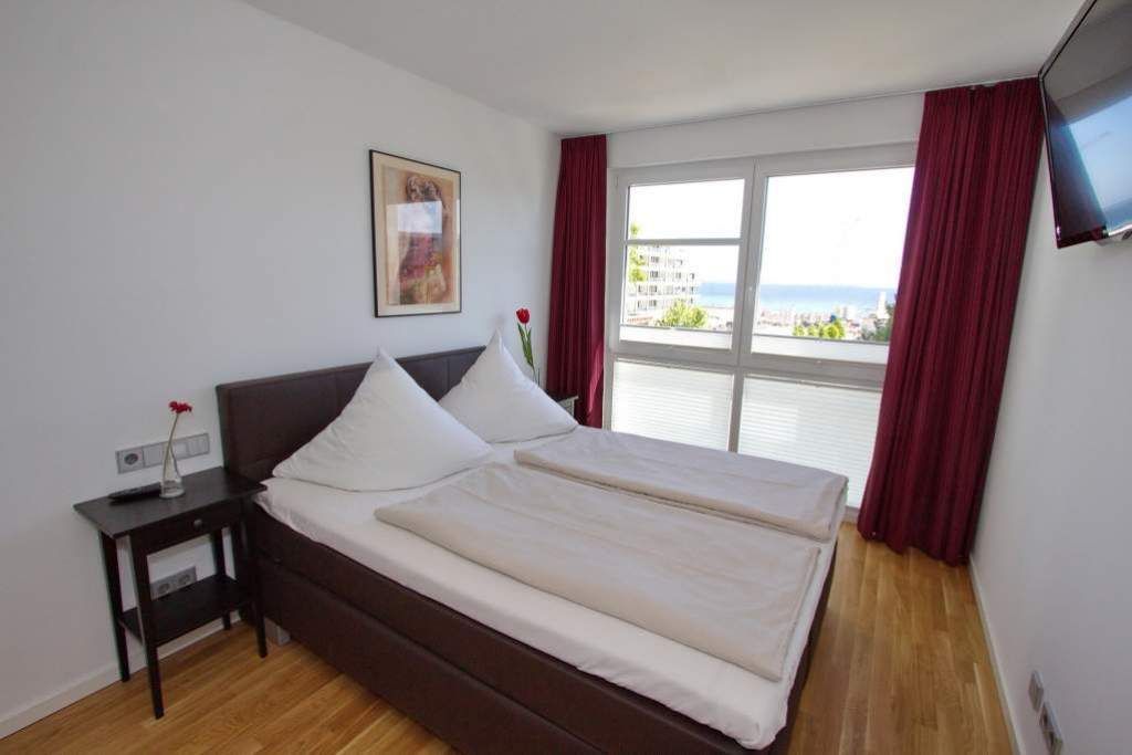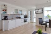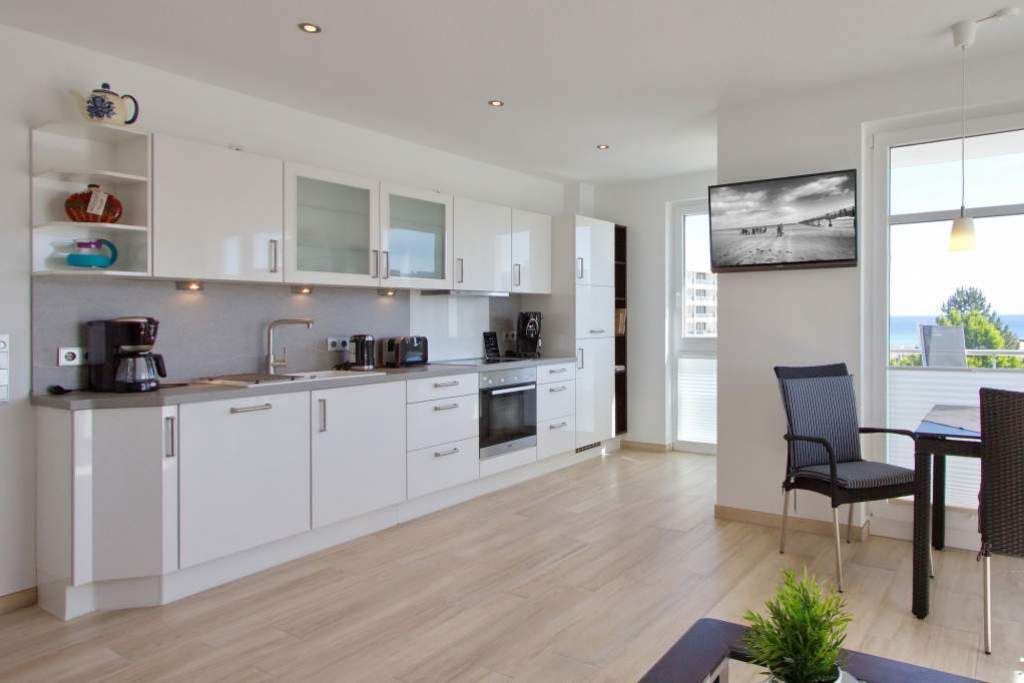 Der Wohn-Essbereich mit bodentiefen Fenstern ist mit einem Esstisch und einer gemütlichen Couch ausgestattet. Neben einem Flachbildfernseher und einem CD-Player steht Ihnen selbstverständlich kostenloses WLAN zur Verfügung. Der überdachte Balkon mit Blick auf die Ostsee ist mit einem Tisch und Stühlen ausgestattet. Die moderne Küche ist komplett ausgestattet und lässt keine Wünsche offen. Im Schlafzimmer stehen ein bequemes Boxspringbett (1,80 x 2,00m) sowie ein geräumiger Schrank. Auch im Schlafzimmer ist ein Flachbildfernseher für Sie angebracht. Das Badezimmer verfügt über eine bodentiefe Dusche und ein Radio. Neben der Fußbodenheizung ist hier ein zusätzlicher Handtuchheizkörper angebracht.