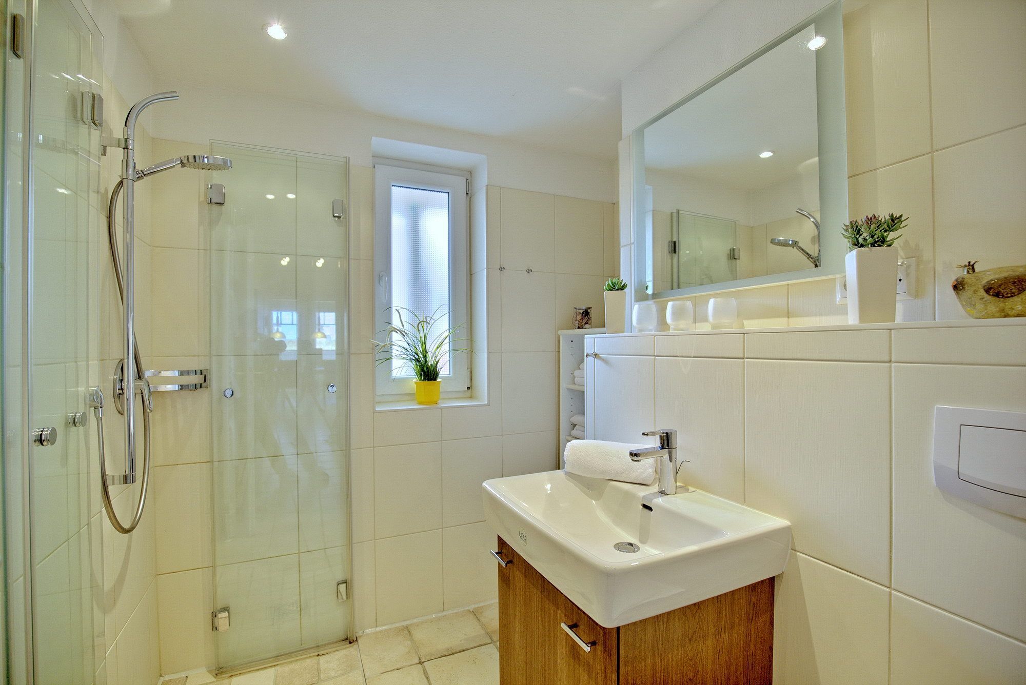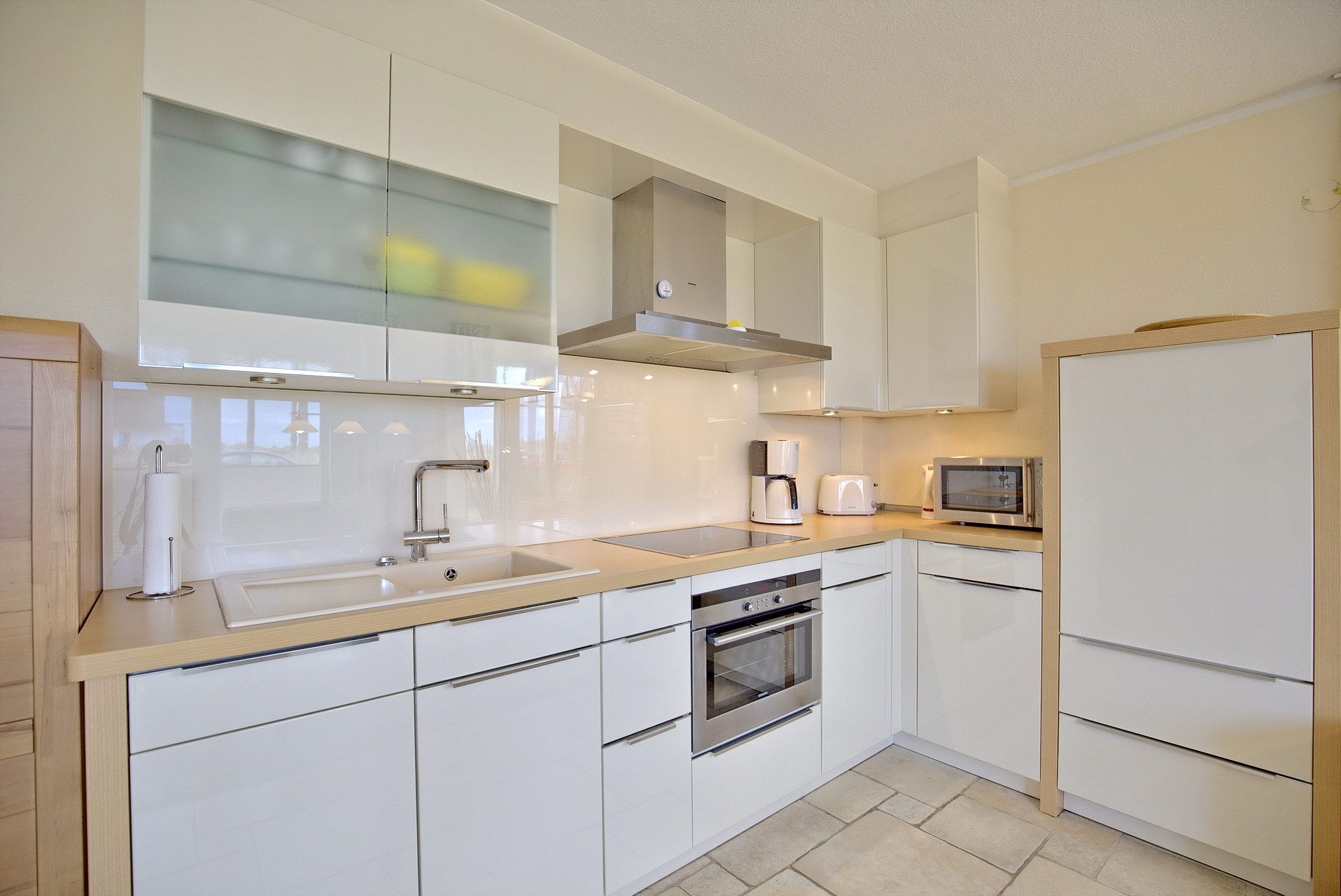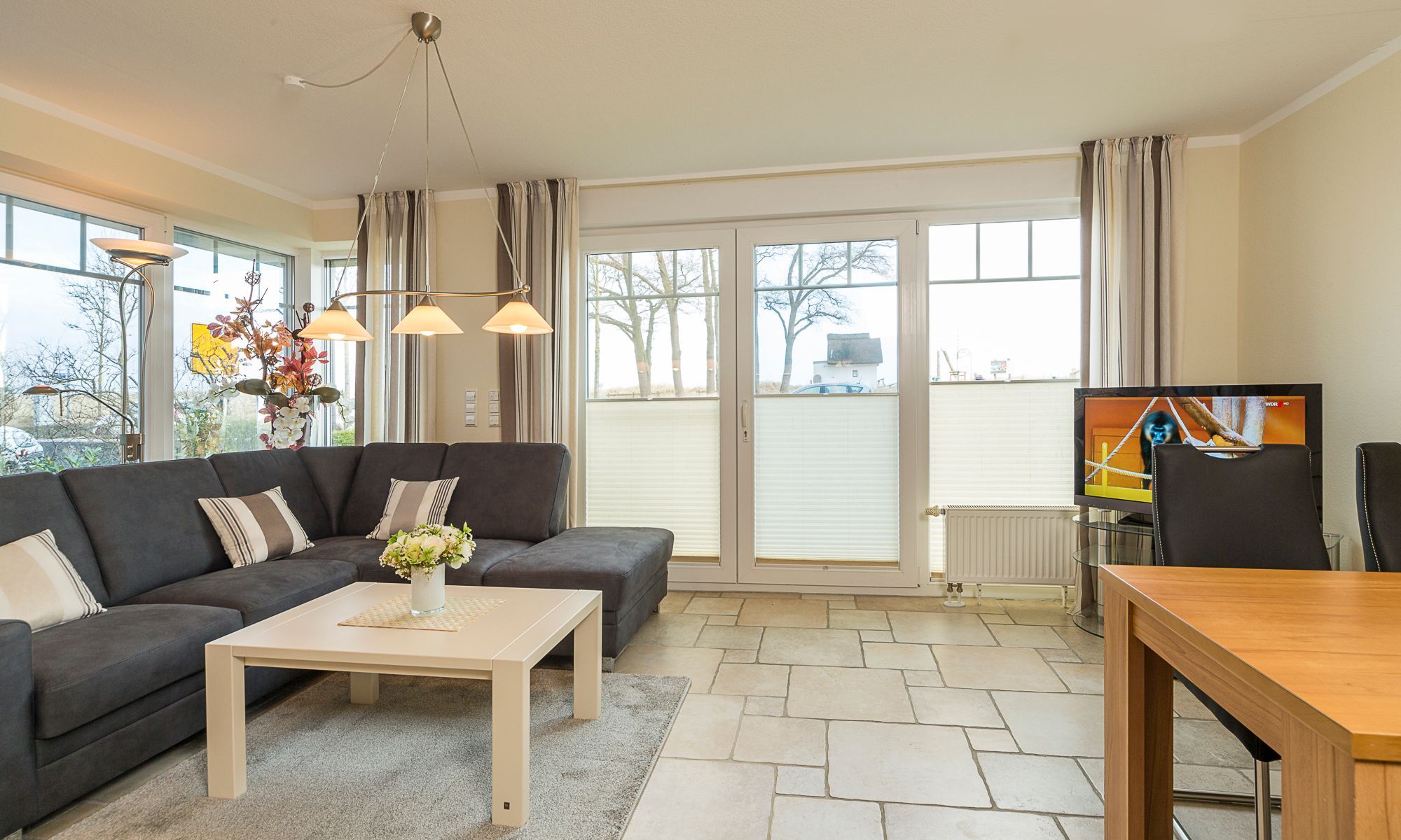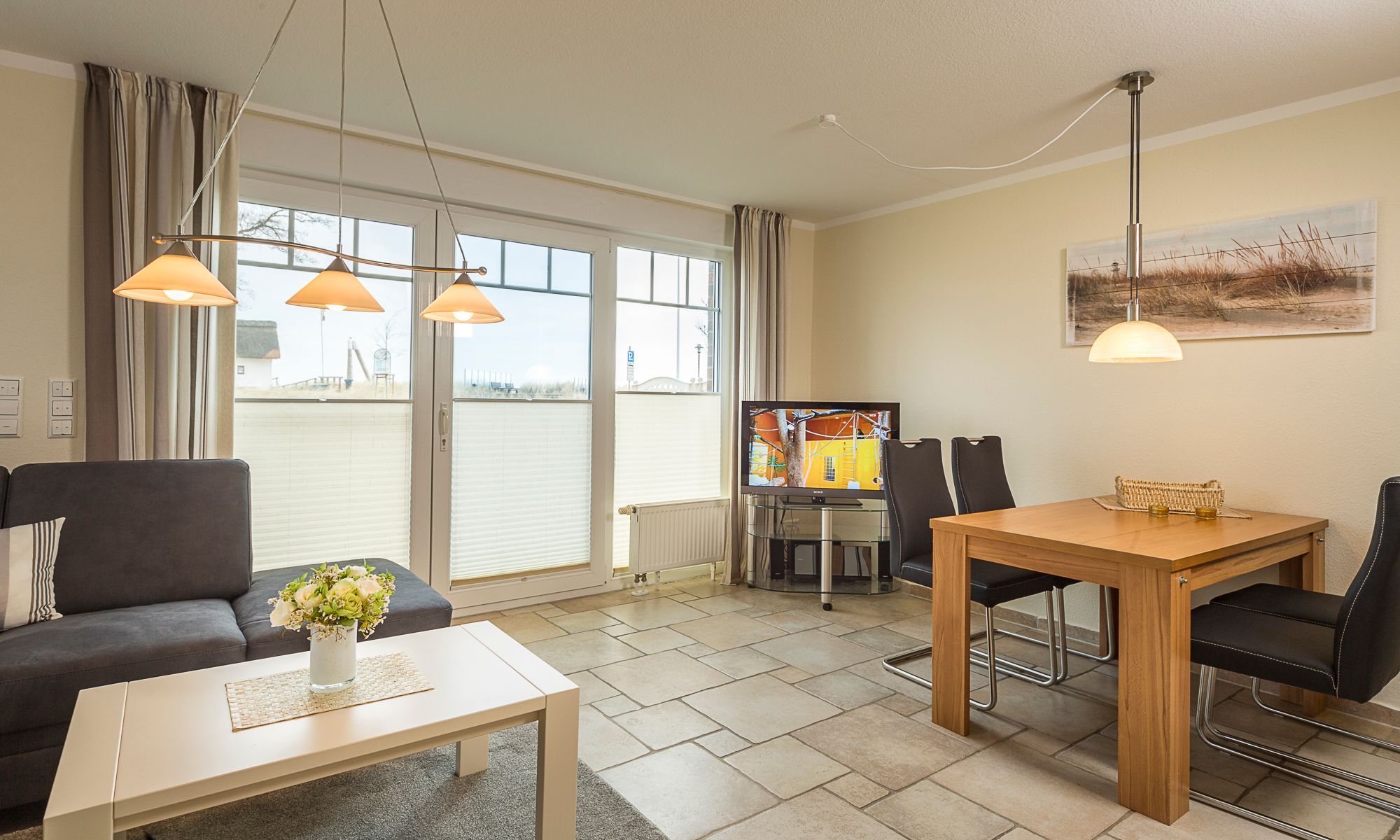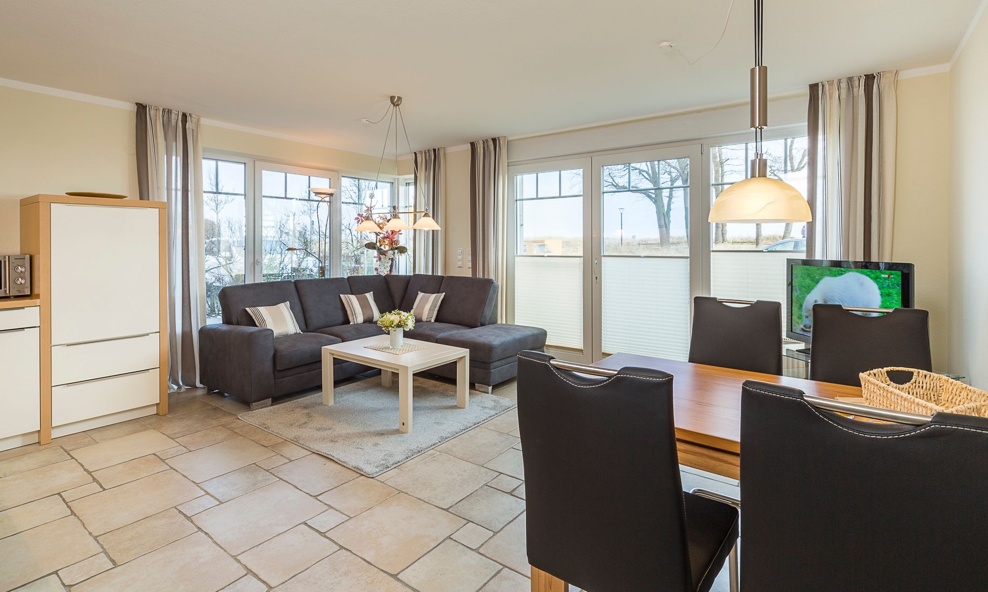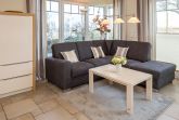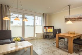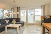 Der Wohn-Essbereich ist mit einem Esstisch und zwei Zweisitzern ausgestattet. Neben einem Flachbildfernseher, einem DVD-Player und einem CD-Player steht Ihnen selbstverständlich kostenloses WLAN zur Verfügung. Die Terrasse Richtung Osten ist mit einem Tisch, Stühlen und einem Strandkorb ausgestattet. Die helle Küche ist komplett ausgestattet und lässt keine Wünsche offen. Beide Schlafzimmer verfügen über bequeme Doppelbetten (1,80 x 2,00m) und geräumige Schränke sowie je einen zusätzlichen Flachbildfernseher. Zur Verdunkelung sind elektrische Rollläden angebracht. Das Tageslichtbad verfügt über eine bodengleiche Dusche.