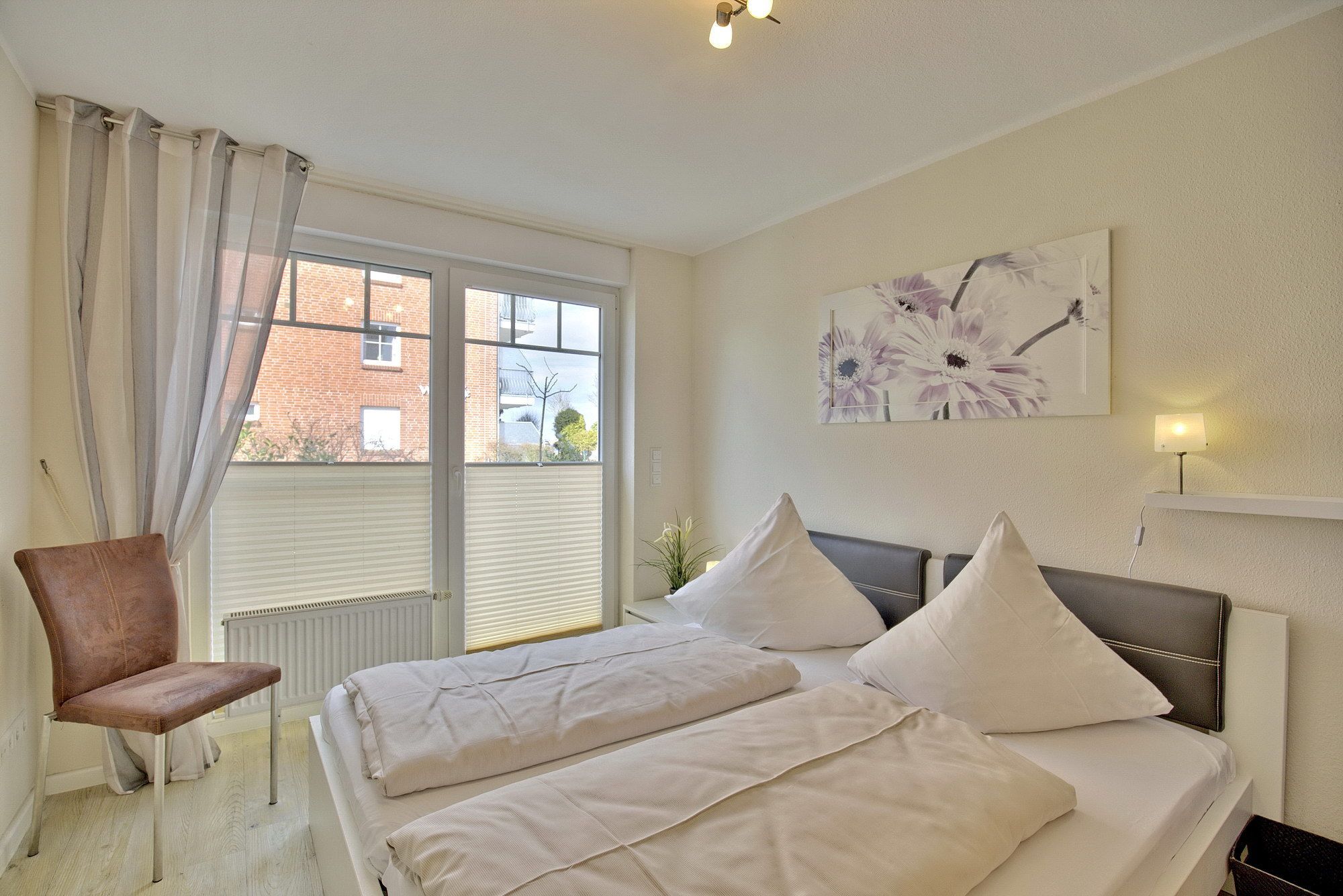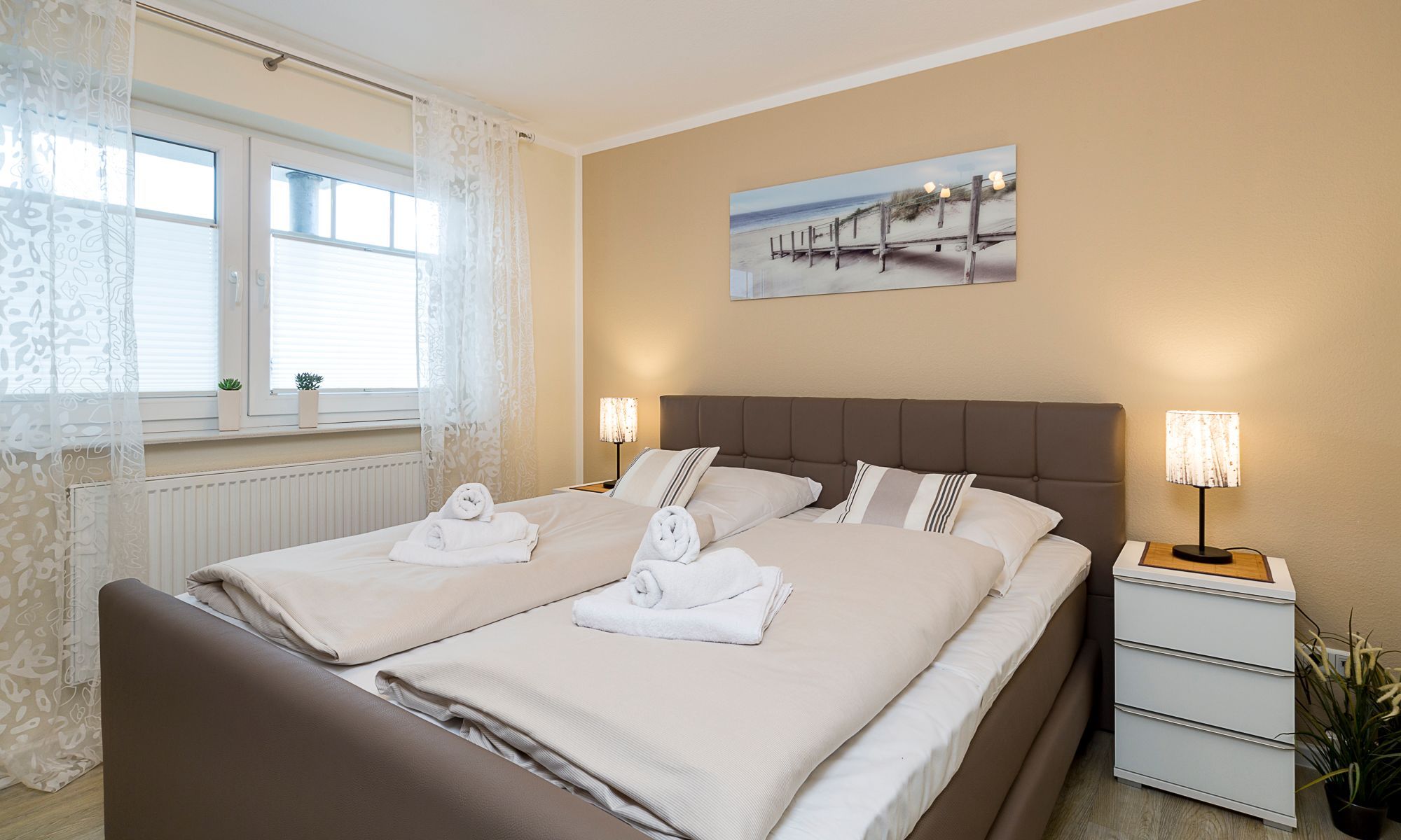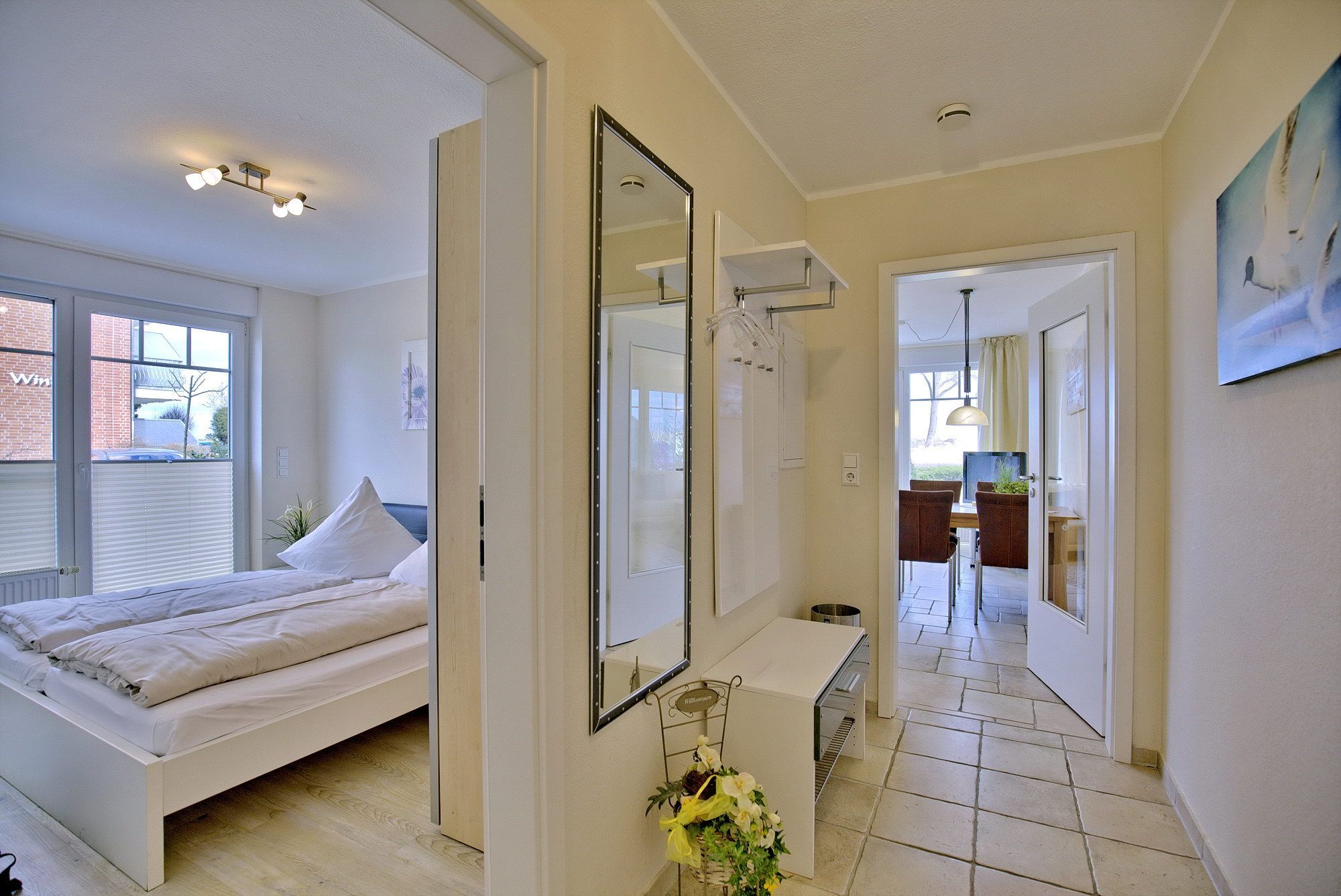 3-Zimmer-Ferienwohnung, ca. 70 m², zwei Schlafzimmer, Terrasse, Duschbad und ein PKW-Stellplatz für bis zu 4 Personen.