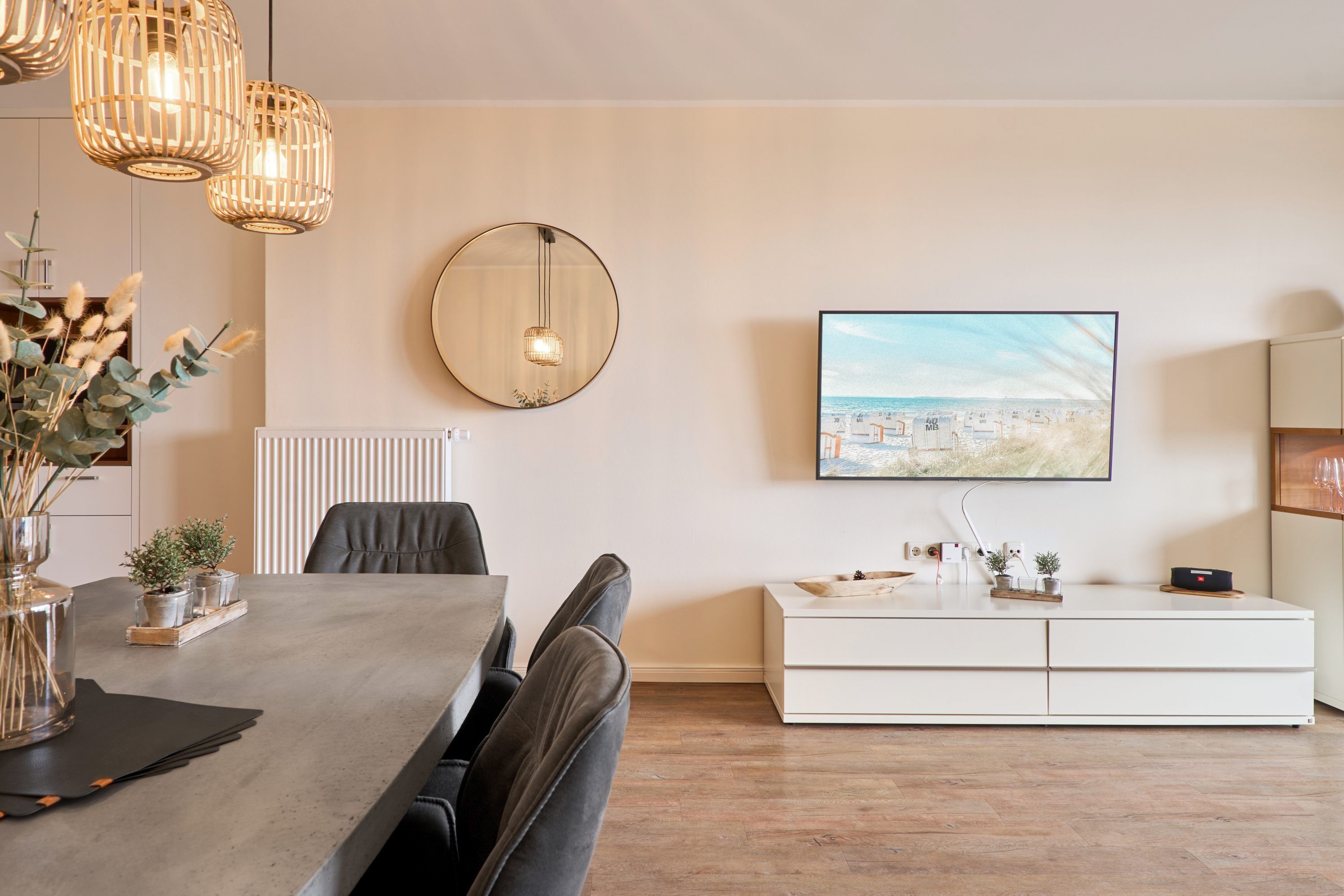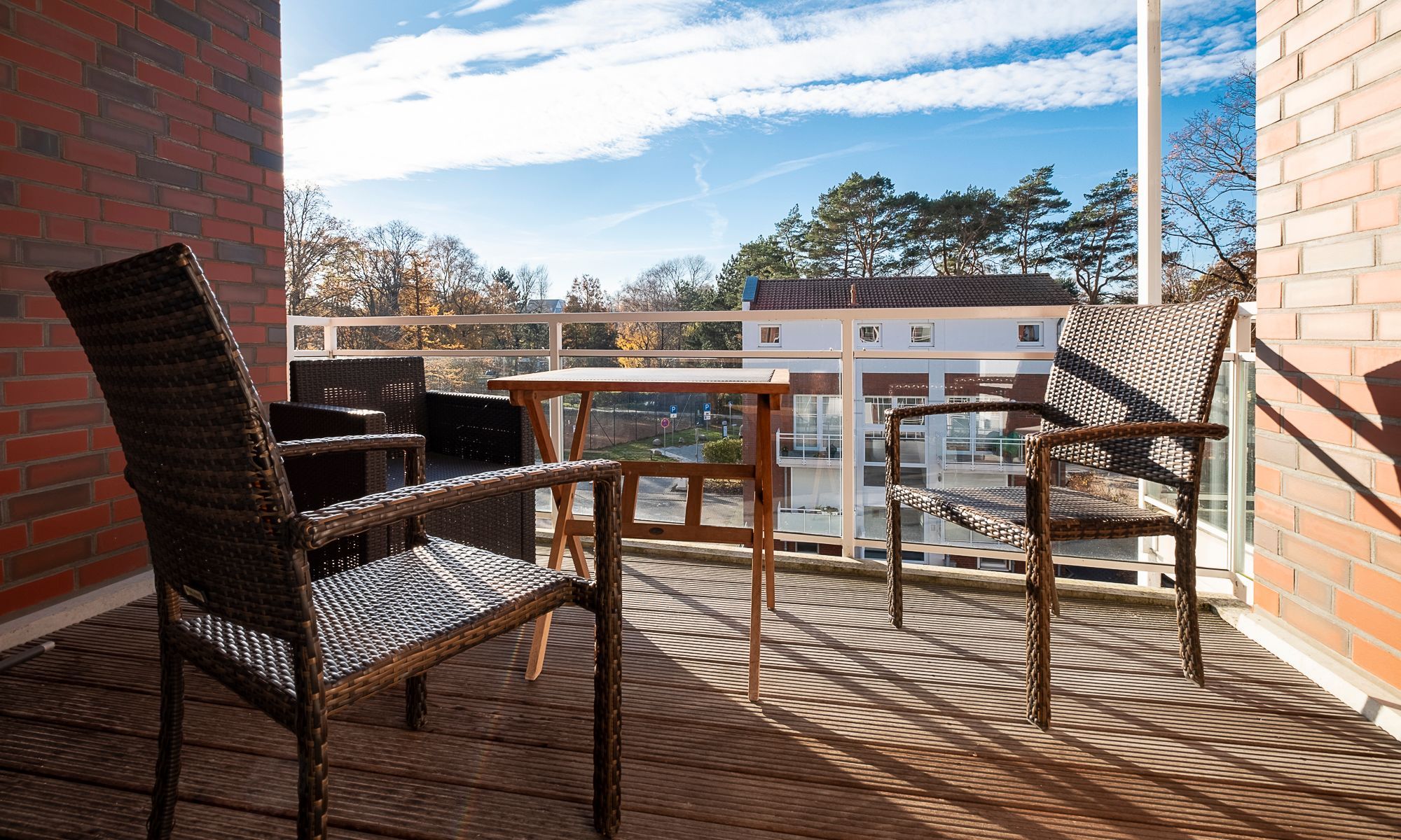 Der helle Wohn-Essbereich ist mit einer großen Sofaecke eingerichtet. Mit wenigen Handgriffen lässt diese sich in ein Schlafsofa umfunktionieren. Neben dem Flachbildfernseher (HD+) mit Smart-Funktion und der Bluetooth-Box steht Ihnen selbstverständlich kostenloses WLAN zur Verfügung. Die moderne Küche ist komplett ausgestattet, unter anderem steht Ihnen ein Kaffeevollautomat zur Verfügung und der Esstisch lädt zu geselligen Stunden ein. Der großzügige Balkon (10 m²) mit Blick auf die Ostsee ist windgeschützt. In beiden Schlafzimmern stehen bequeme Doppelbetten (1,80 x 2,00m) und geräumige Kleiderschränke. Zusätzlich verfügen sie über Smart-Flachbildfernseher und einen eigenen kleinen Balkon Richtung Kurpark. Die Badezimmer verfügen über große Duschen und unterfahrbare Waschbecken. Diese Wohnung ist daher auch für Rollstuhlfahrer geeignet.