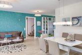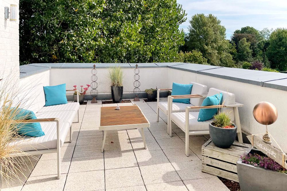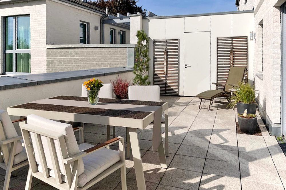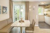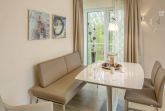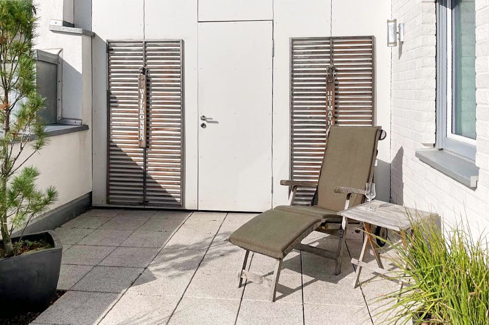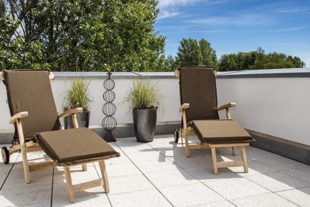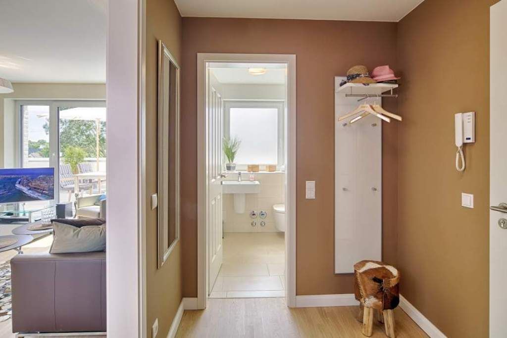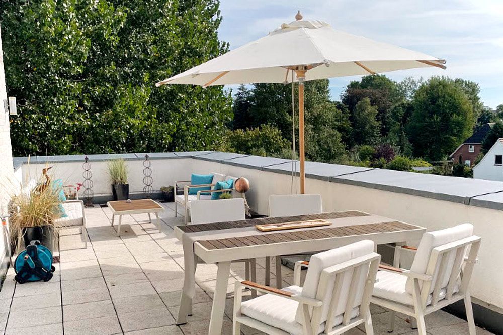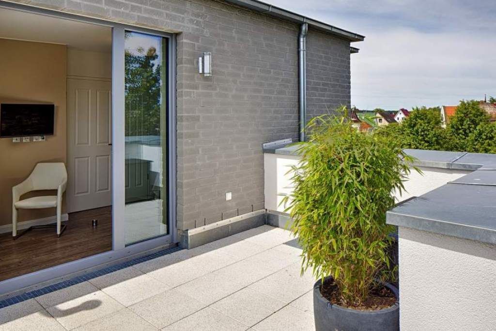 Der moderne Wohn-Essbereich bietet Ihnen ein Sofa, einen Sessel und einen großen Esstisch mit Bank und Stühlen für gesellige Stunden. Für Ihre Lesestunde steht für Sie ein Relaxsessel bereit. Neben dem Flachbildfernseher, einer Stereoanlage und einem Blu-ray-Player steht Ihnen selbstverständlich kostenloses WLAN zur Verfügung. Die helle Küche mit einem tollen Ausblick lässt keine Wünsche offen. Die 1. Terrasse, die vom Wohnbereich zu betreten ist, ist mit einem Tisch, Stühlen, Liegen und einem Sonnenschutz ausgestattet. Der Blick über den Kurpark und die freundliche Gestaltung der Terrasse lassen Sie entspannen und Ihren Urlaub genießen. Im 1. Badezimmer befinden sich eine bodentiefe Dusche und ein großer Spiegel. Über eine Treppe gelangen Sie in die zweite Ebene. Hier erwartet Sie ein helles Badewannenbad mit Handtuchheizkörper, viel Ablagefläche und einer Waschmaschine. Das erste Schlafzimmer verfügt über ein Boxspringbett, einen Kleiderschrank, einen Flachbildfernseher und den Zugang zur oberen Terrasse. Sie ist mit Lounge-Möbeln ausgestattet. Im 2. Schlafzimmer stehen Ihnen ein Boxspringbett, ein Flachbildfernseher, ein Schminktisch und, das Highlight dieser Wohnung, eine eigene Sauna zur Verfügung. Saunieren Sie mit Blick über die Dächer von Scharbeutz. Das angrenzende Ankleidezimmer bietet ausreichend Platz.