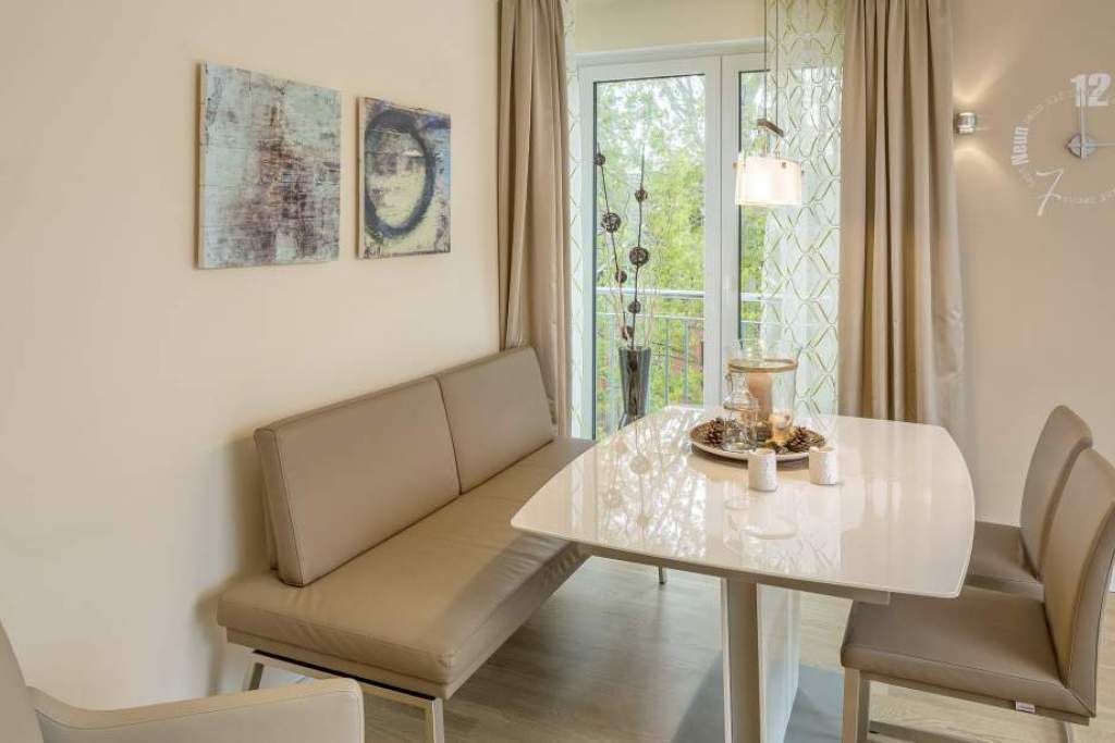 Lichtblick in der Kurparkresidenz ist eine 120 qm große 3-Zimmer-Maisonette-Ferienwohnung mit zwei Schlafzimmern (elektrische Außenrollläden), Ankleidezimmer, zwei Terrassen, eigener Sauna, zwei Bädern und einem Tiefgaragenstellplatz ( Durchfahrtshöhe 2,11 m), für bis zu 4 Personen.