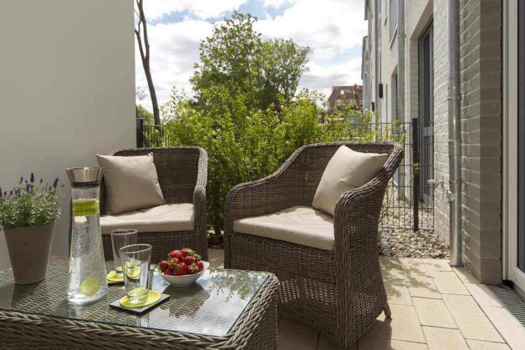 Schlafräume und Küche sowie die zweite Terrasse sind zum Kurpark ausgerichtet.