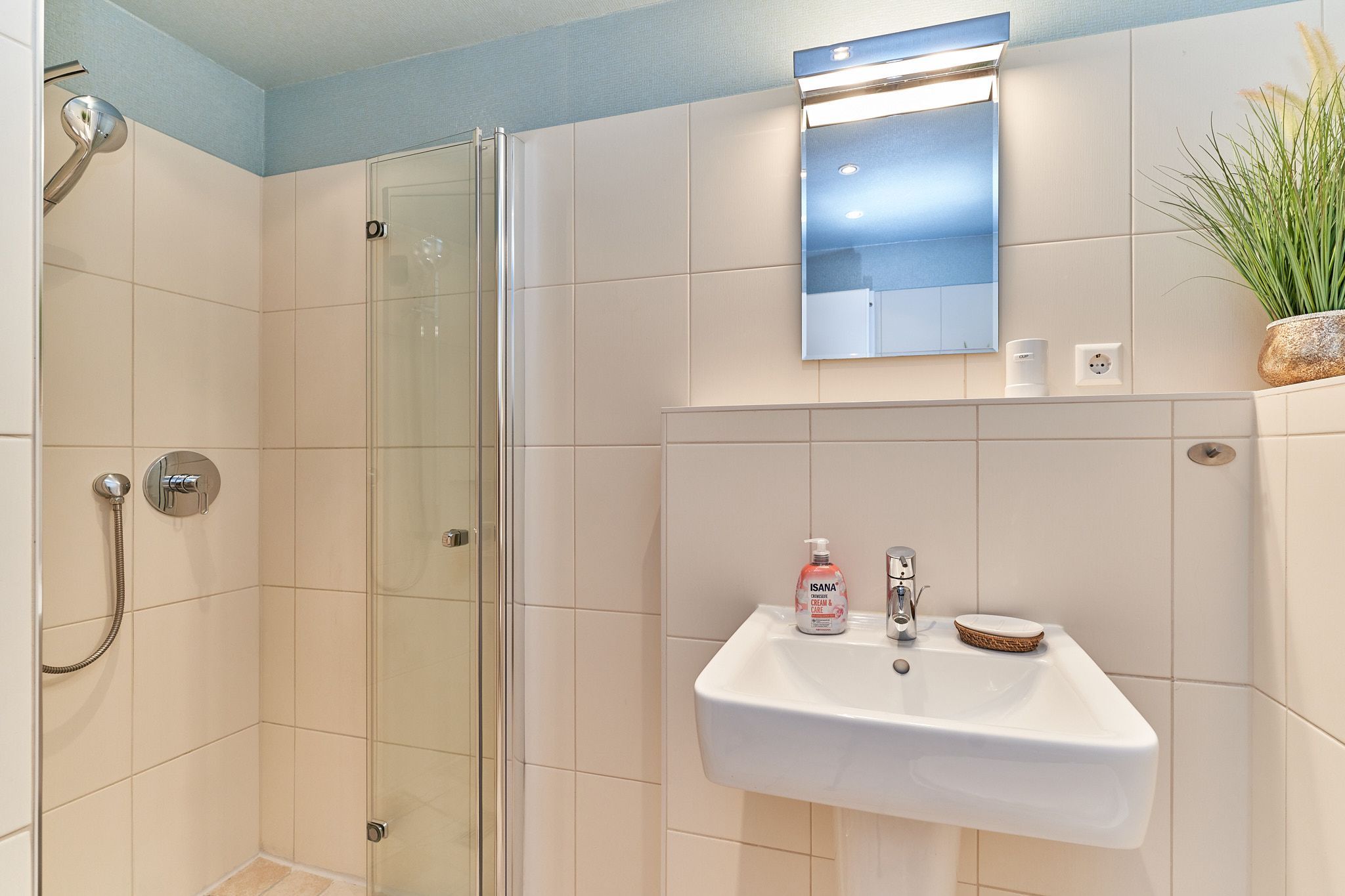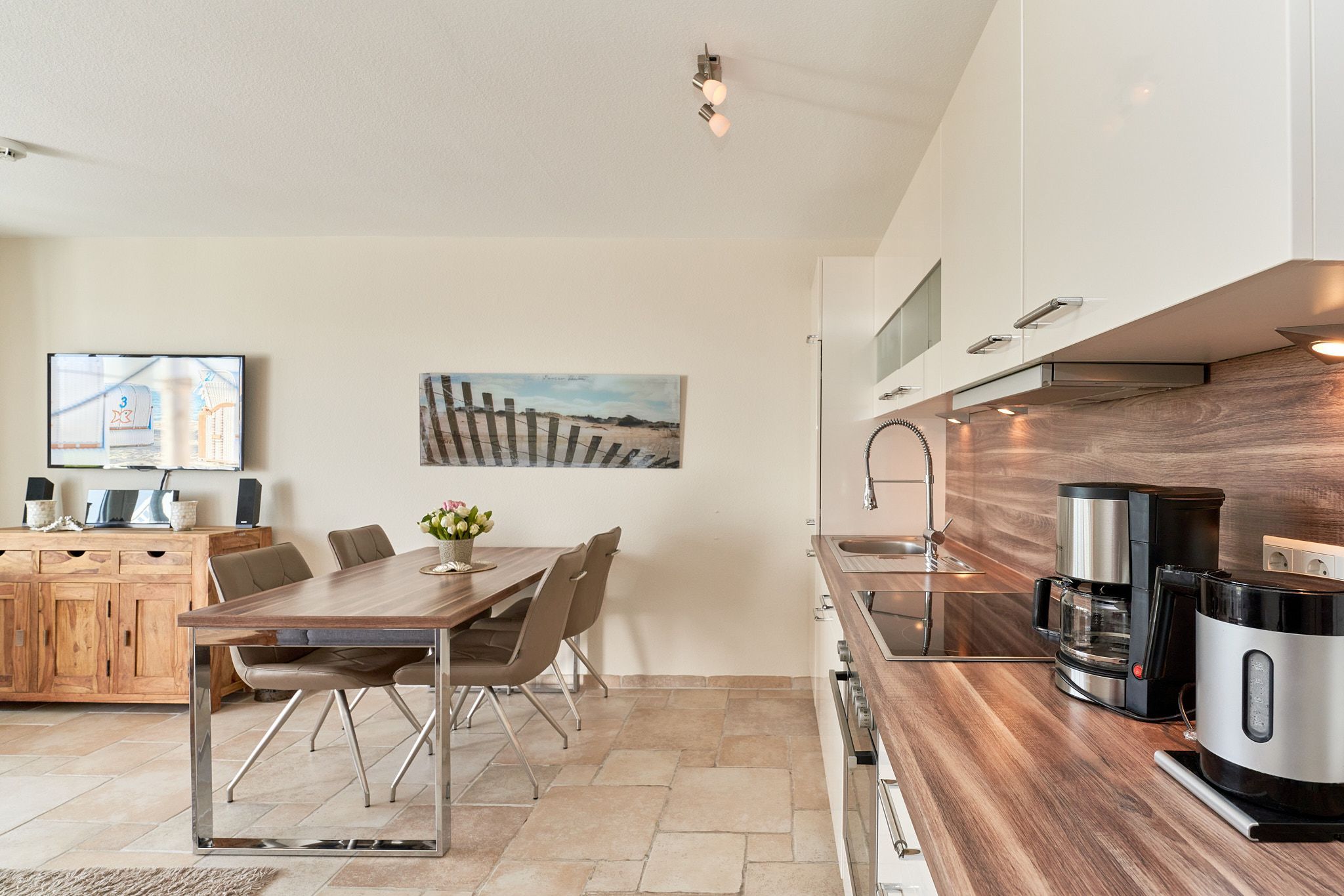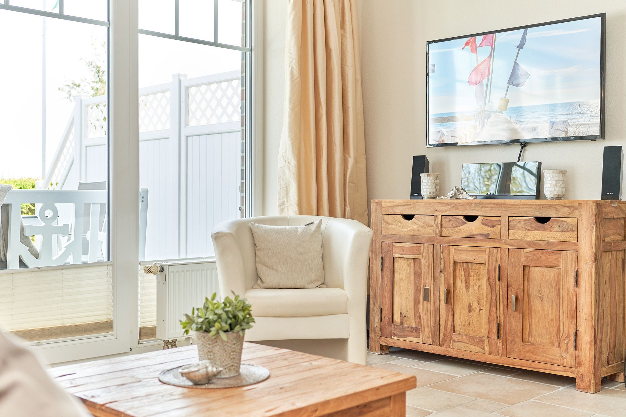 Der Wohn-Essbereich ist mit einem Esstisch und einer Couch ausgestattet, die sich mit nur wenigen Handgriffen in eine Schlafcouch umwandeln lässt. Neben einem Flachbildfernseher, einem DVD-Player und einer Stereoanlage steht Ihnen selbstverständlich kostenloses WLAN zur Verfügung. Die Terrasse Richtung Osten ist mit einem Tisch, Stühlen, einer Bank und einem Sonnenschutz ausgestattet. Die helle Küche lässt keine Wünsche offen. Im Schlafzimmer stehen ein Flachbildfernseher, ein bequemes Doppelbett (1,80 x 2,00m) und ein geräumiger Kleiderschrank. Zur Verdunkelung sind elektrische Rollläden angebracht. Das helle Bad verfügt über eine bodentiefe Dusche und ausreichend Ablageflächen. Neben der Fußbodenheizung befindet sich hier ein zusätzlicher Handtuchheizkörper.