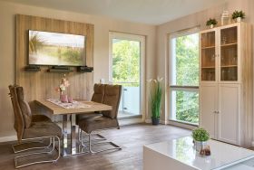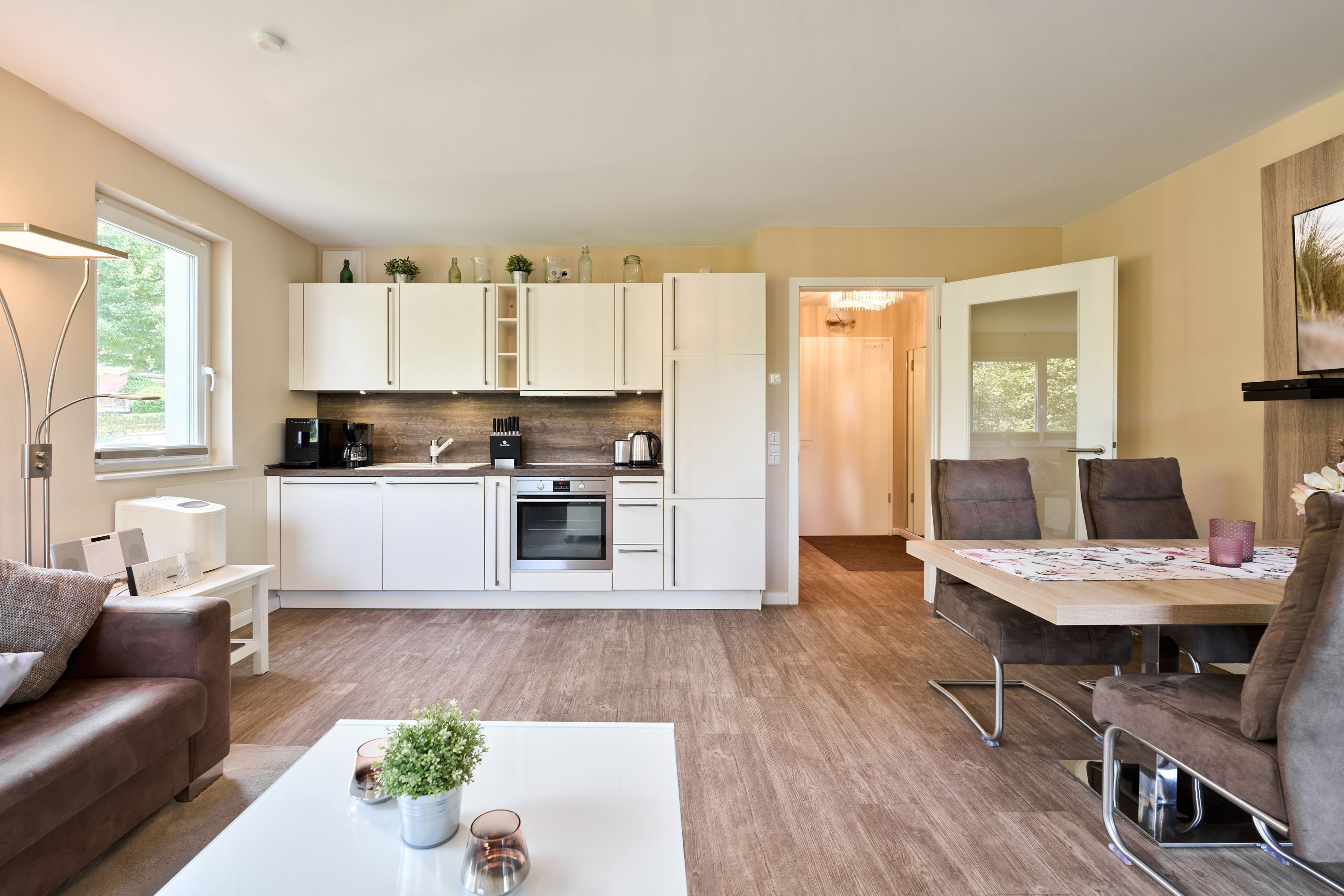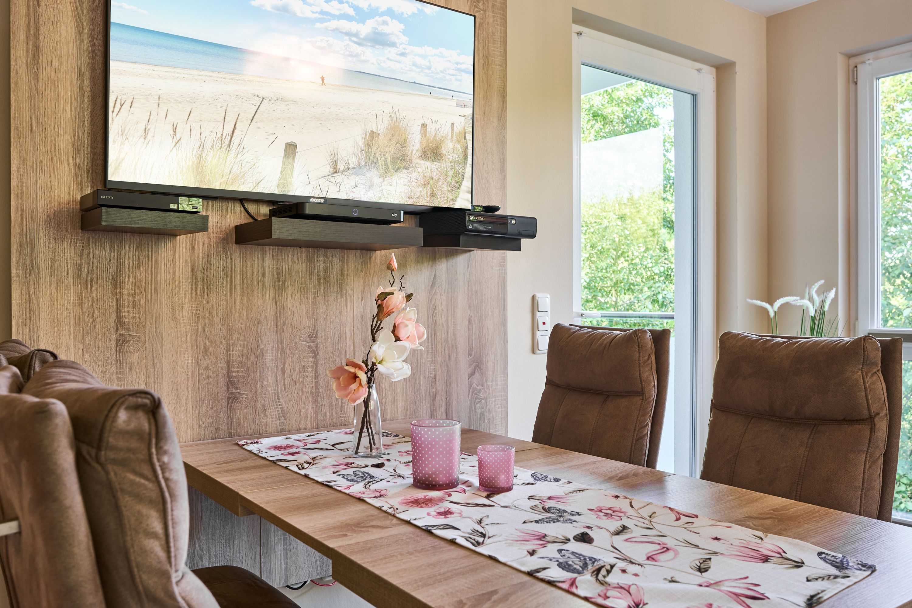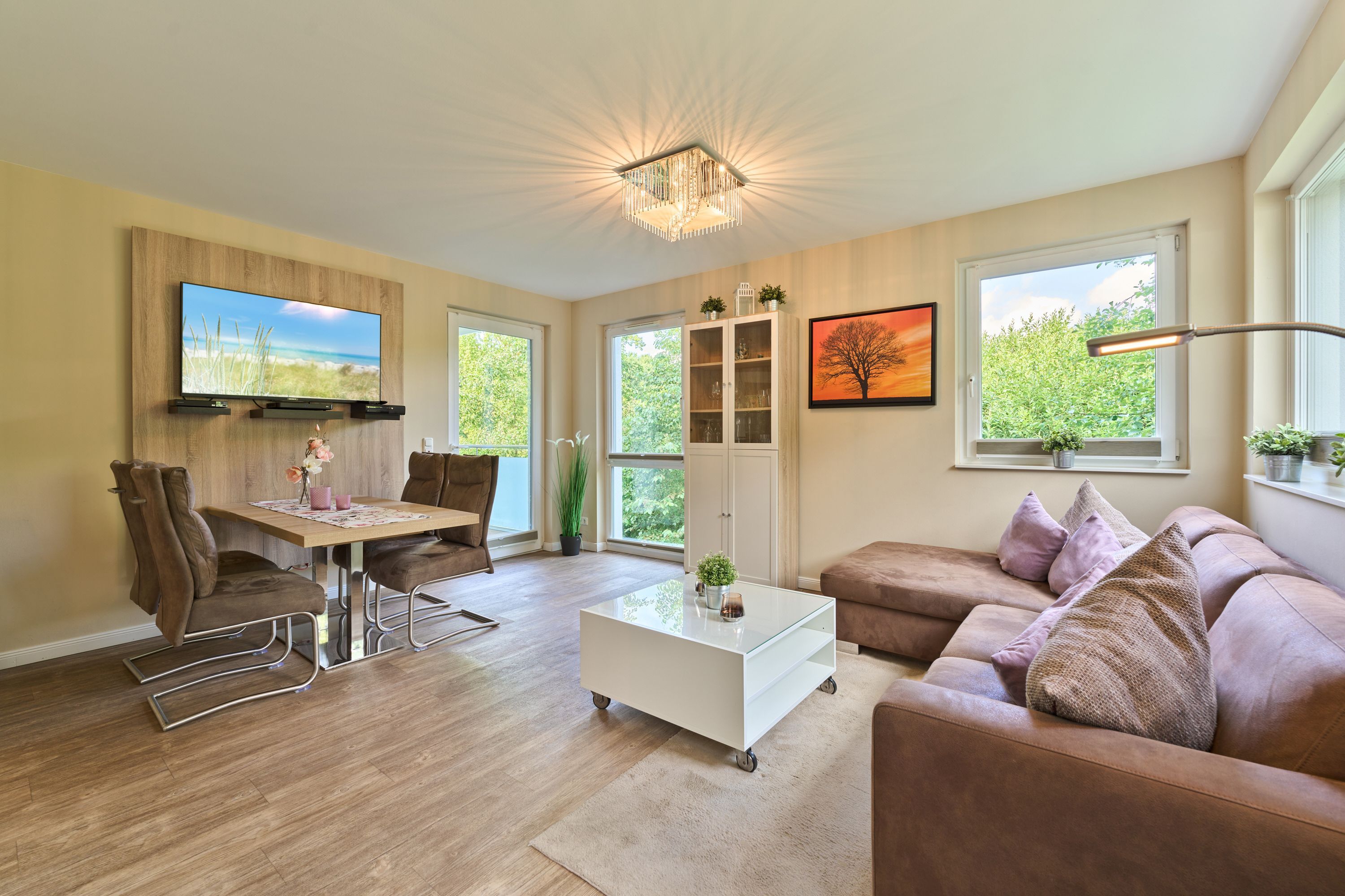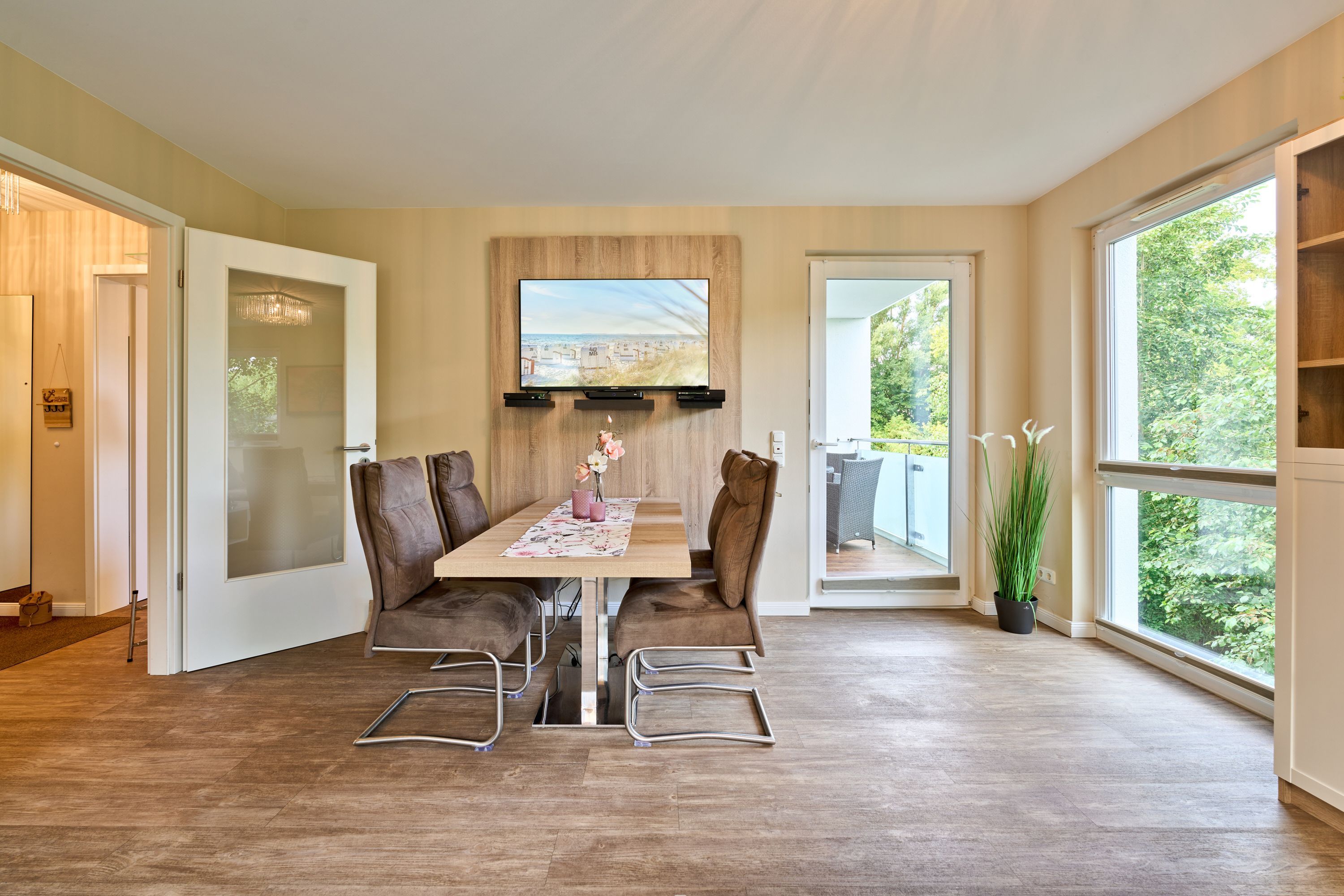 Diese Ferienwohnung bietet Ihnen einen gemütlichen Wohn-Essbereich mit einer Couch, die sich mit nur wenigen Handgriffen in ein bequemes Bett mit Kaltschaummatratze umwandeln lässt. Neben dem Flachbildfernseher und dem Blu-ray-Player steht Ihnen eine Stereoanlage zur Verfügung sowie Streaming Dienste wie Netflix und Amazon Prime (Anmeldung mit eigenem Account). Kostenloses WLAN ist selbstverständlich. Der Balkon ist mit Tisch und Stühlen ausgestattet. Die moderne Küche ist komplett ausgestattet. Es steht ein Kaffeeautomat mit Milchaufschäumer zur Verfügung. Ein besonderes Extra ist hier eine Eiswürfelmaschine. Das Schlafzimmer ist mit einem geräumigen Schrank, einem Boxspringbett (1,80 x 2,00m, durchgehender Topper) und einem großen Flachbildfernseher ausgestattet. Zur Verdunkelung sind Plissees angebracht. Das helle Tageslichtbad verfügt über eine bodentiefe Dusche, einen großen Spiegel und eine Waschmaschine. Neben der Fußbodenheizung ist hier ein zusätzlicher Handtuchheizkörper angebracht.