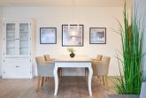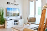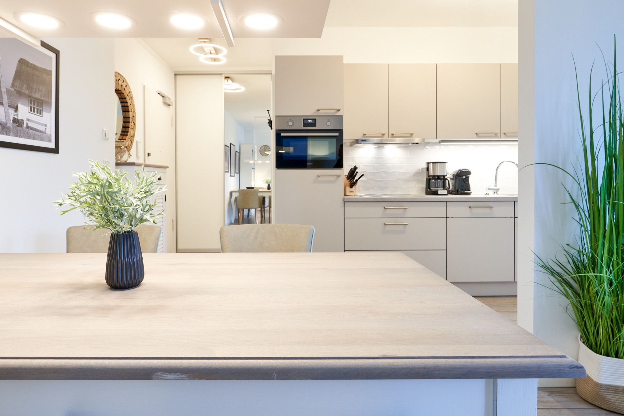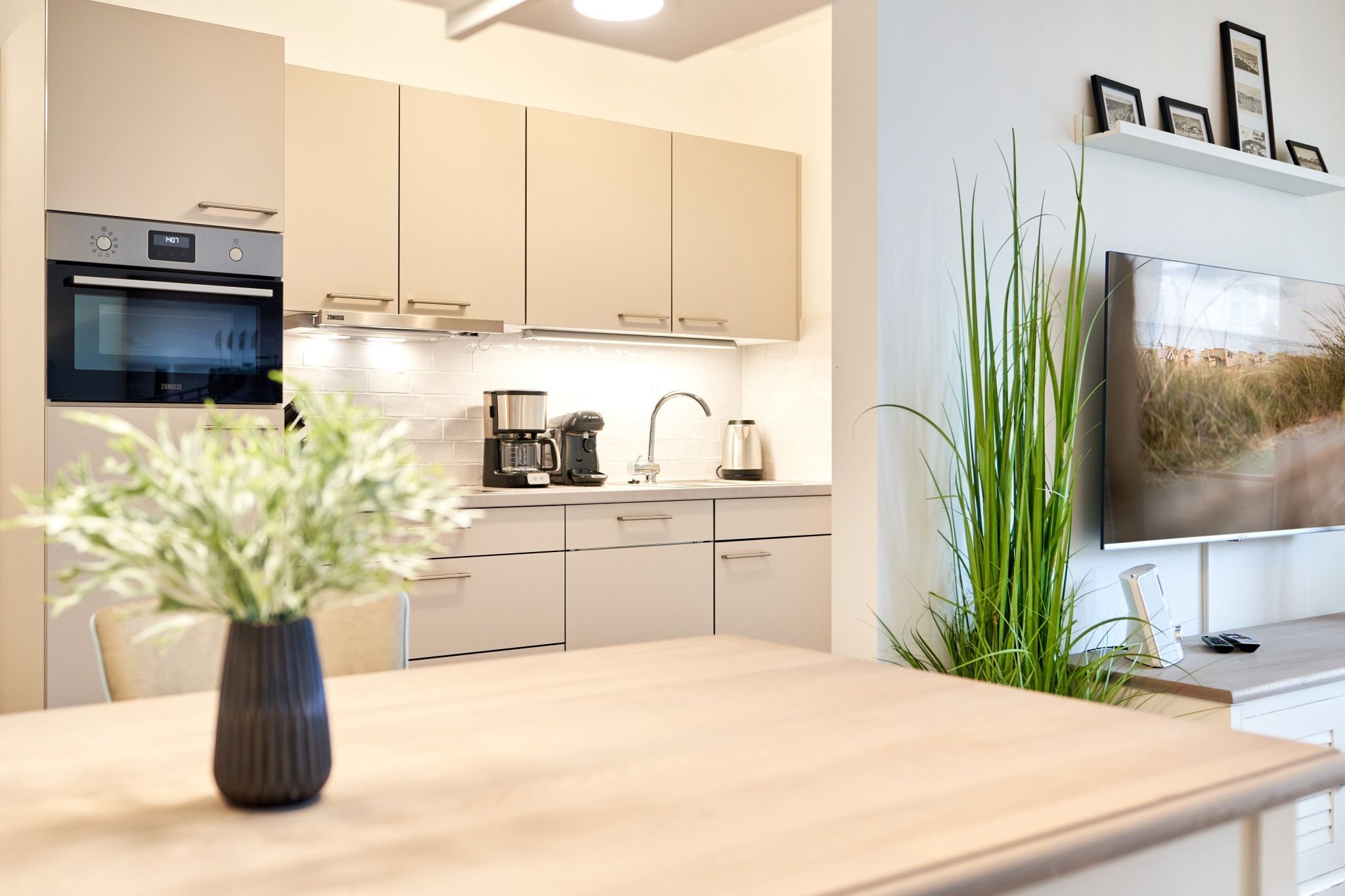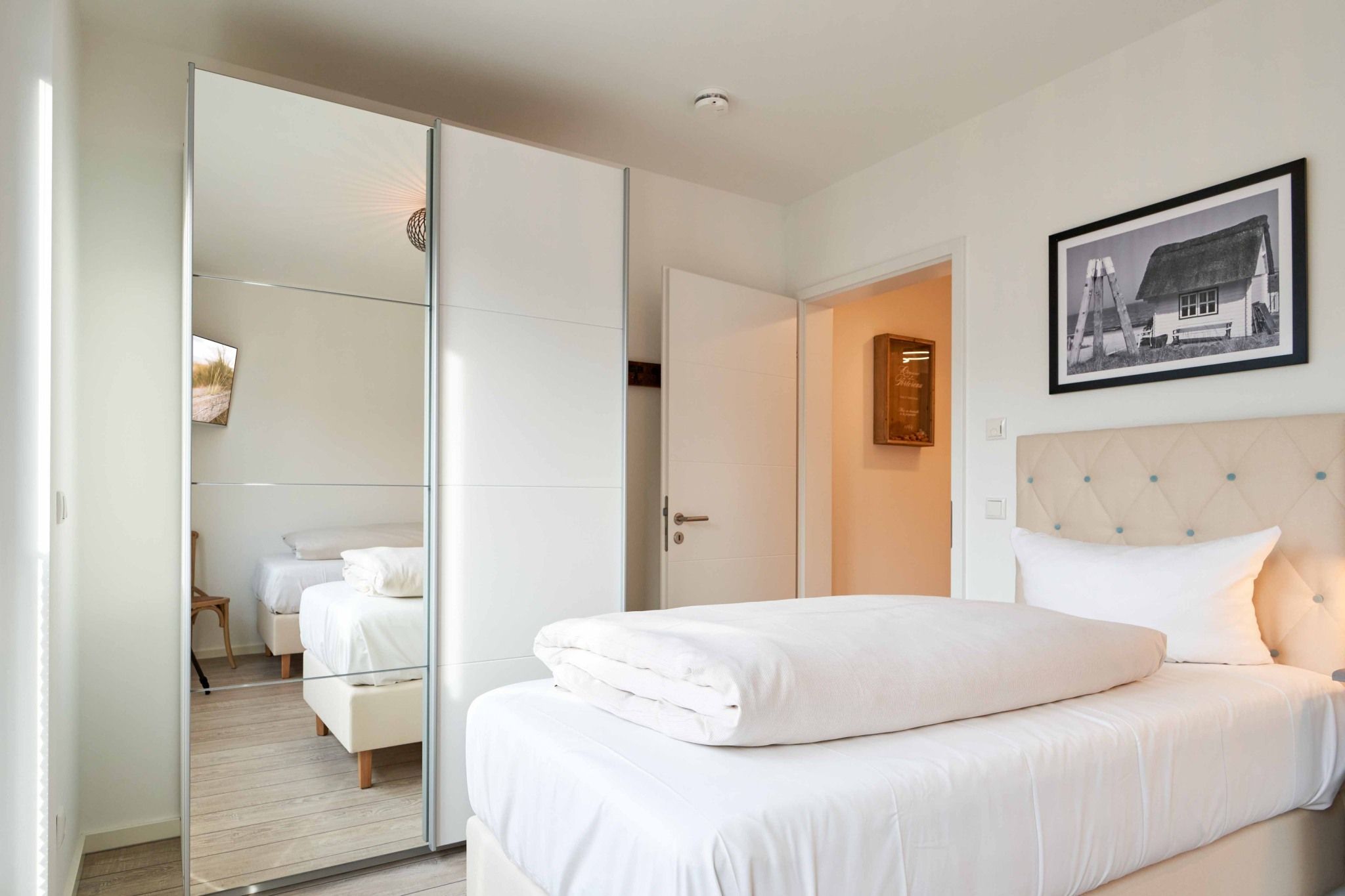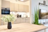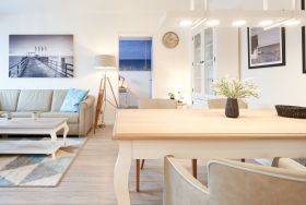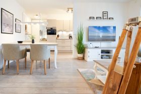 Die 3-Zimmer-Ferienwohnung ist mit bodentiefen Fenstern ausgestattet. An allen Fenstern befinden sich Licht- und Sichtschutz sowie Außenrollläden. Die Einbauküche im Wohn-Essbereich ist komplett ausgestattet. Backofen, Ceran-Kochfeld, Mikrowelle, Geschirrspüler, Kühlschrank mit Gefrierfach, Filterkaffeemaschine, Tassimo Kapselmaschinen, Eierkocher, Mixer, Toaster und Wasserkocher. Der Wohnbereich ist mit einem hochwertigen Sofa, einem Wohnzimmertisch, einem TV (55 Zoll) sowie einem Essbereich ausgestattet. Aus dem Wohnbereich gelangen Sie auf den überdachten Westbalkon. Hier stehen Ihnen Tisch und Stühle zur Verfügung. Das 1. Schlafzimmer ist mit einem Boxspringbett ( 2,00m x 2,00m), einem großen Kleiderschrank, 2 Nachttischen sowie einem Wand-TV (43 Zoll) ausgestattet. Das 2. Schlafzimmer hat zwei Einzel-Boxspringbetten (0,90m x 2,00m), 2 Nachttische, einen Kleiderschrank sowie einen Wand-TV (43 Zoll). Alle Fenster haben elektrische Außenrollläden. Das Duschbad in heller Optik mit bodengleicher Dusche / Regendusche, mit separater Handbrause, Handtuchheizkörper, Fön, Kosmetikspiegel. Die gesamte Wohnung ist mit einer Fußbodenheizung ausgestattet.