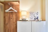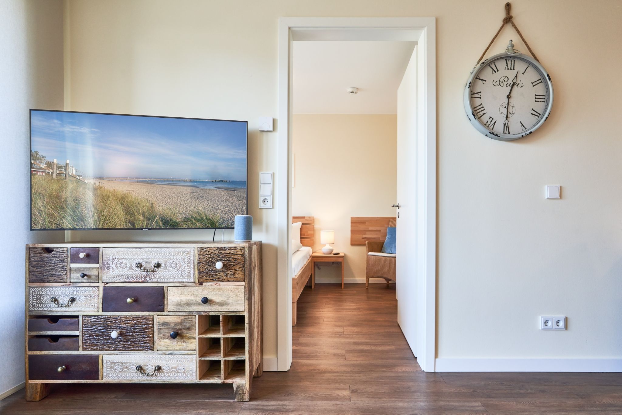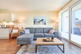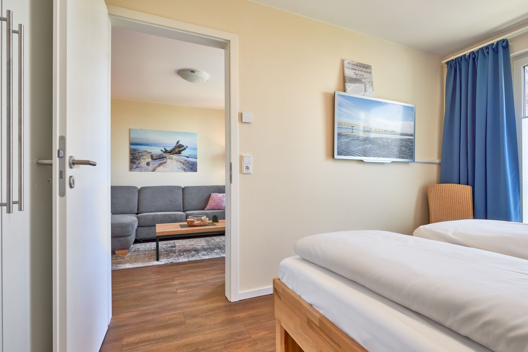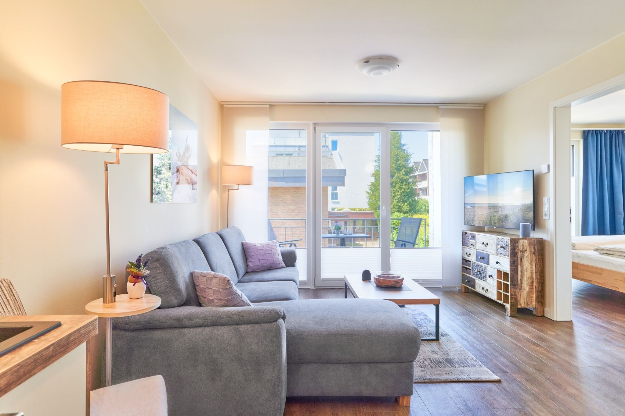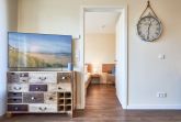 Die offene Küche ist komplett ausgestattet und lässt keine Wünsche offen. Der Wohn-Essbereich ist hell und freundlich gestaltet. Die bequeme Couch lässt sich in wenigen Handgriffen zu einem Schlafsofa umgestalten. Ein Flachbildschirm sowie eine Stereoanlage und freies WLAN sind selbstverständlich. Der Esstisch lädt zum gemütlichen Verweilen ein. Im Schlafzimmer steht ein bequemes Doppelbett mit Einzelmatratzen (0,90 x2,00m) sowie ein geräumiger Schrank. Auch im Schlafzimmer ist ein Flachbildfernseher für Sie angebracht. Das Badezimmer verfügt u. a. über eine großzügige, bodentiefe Dusche und einen zusätzlichen Handtuchheizkörper. Es gibt einen Abstellraum.