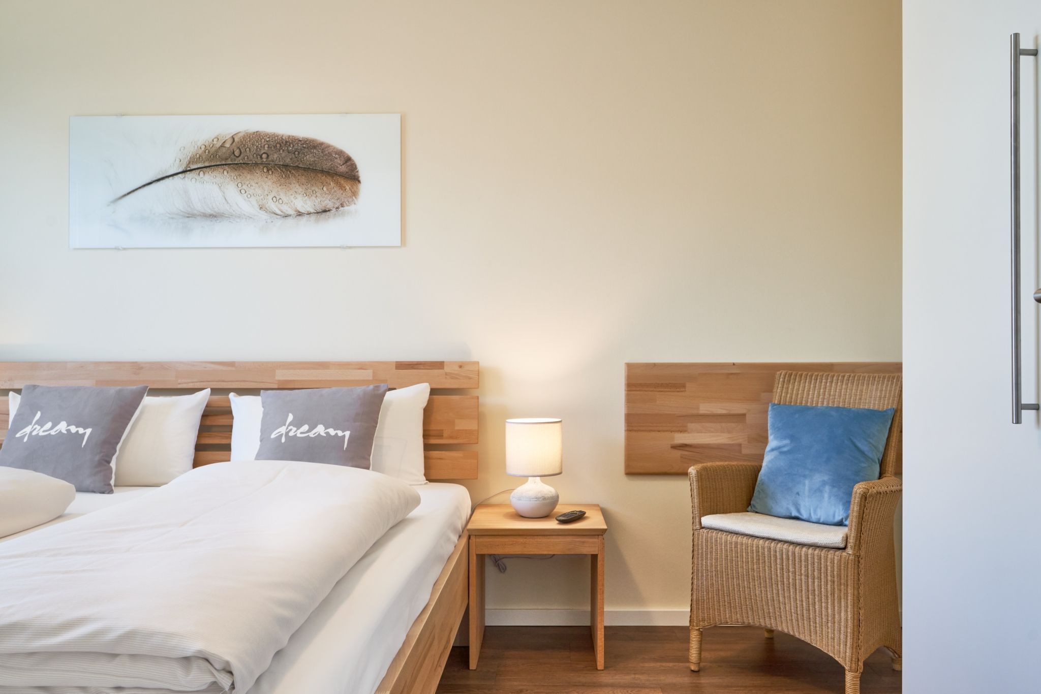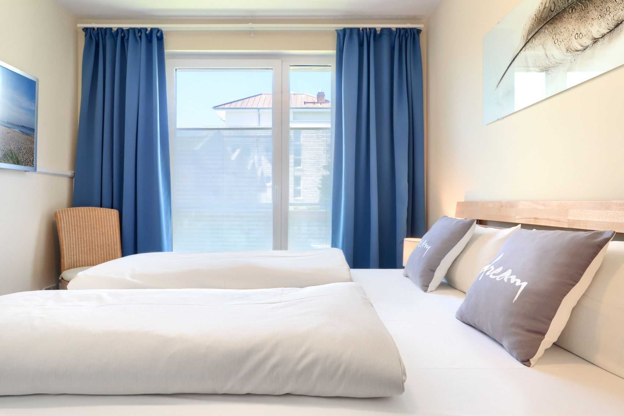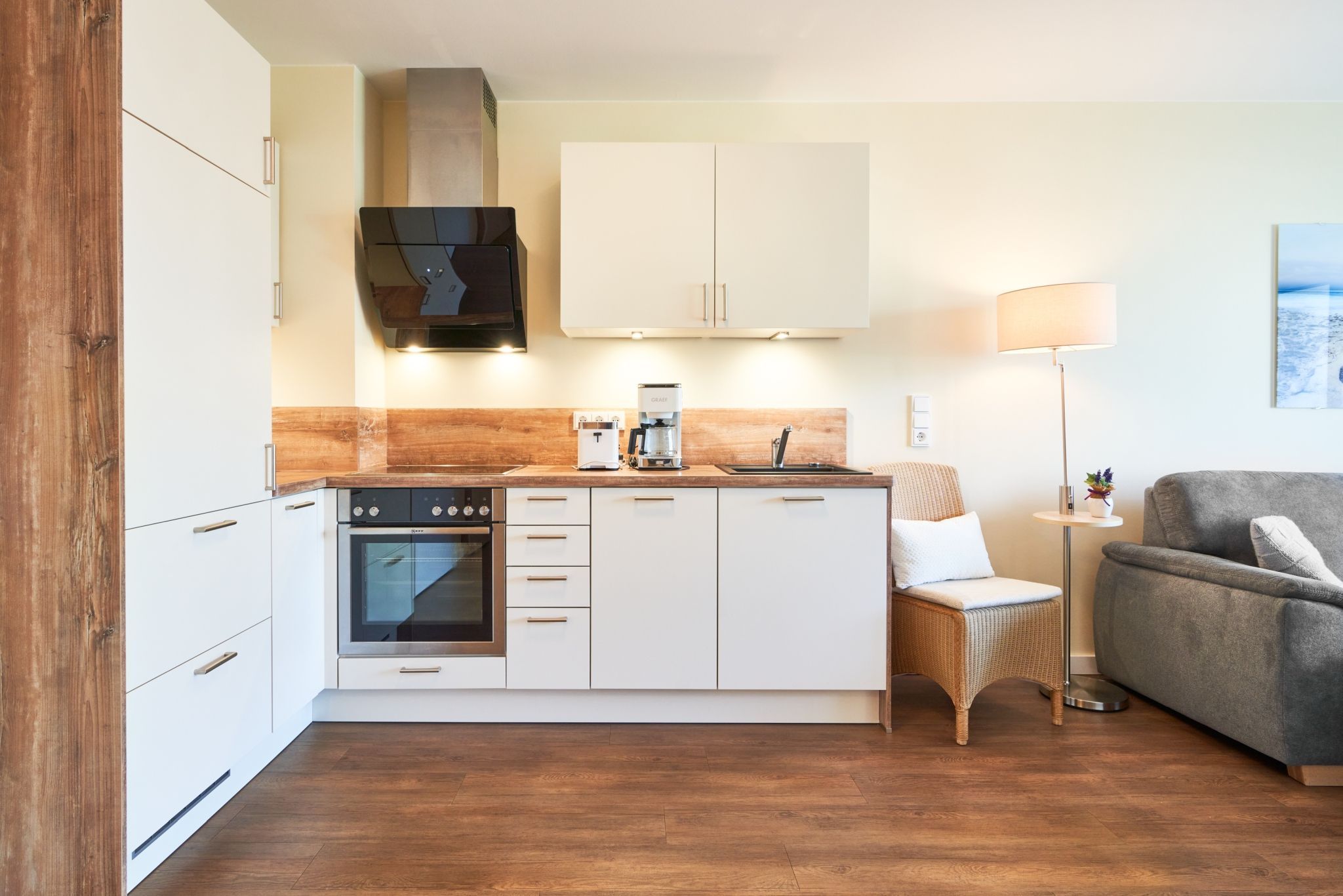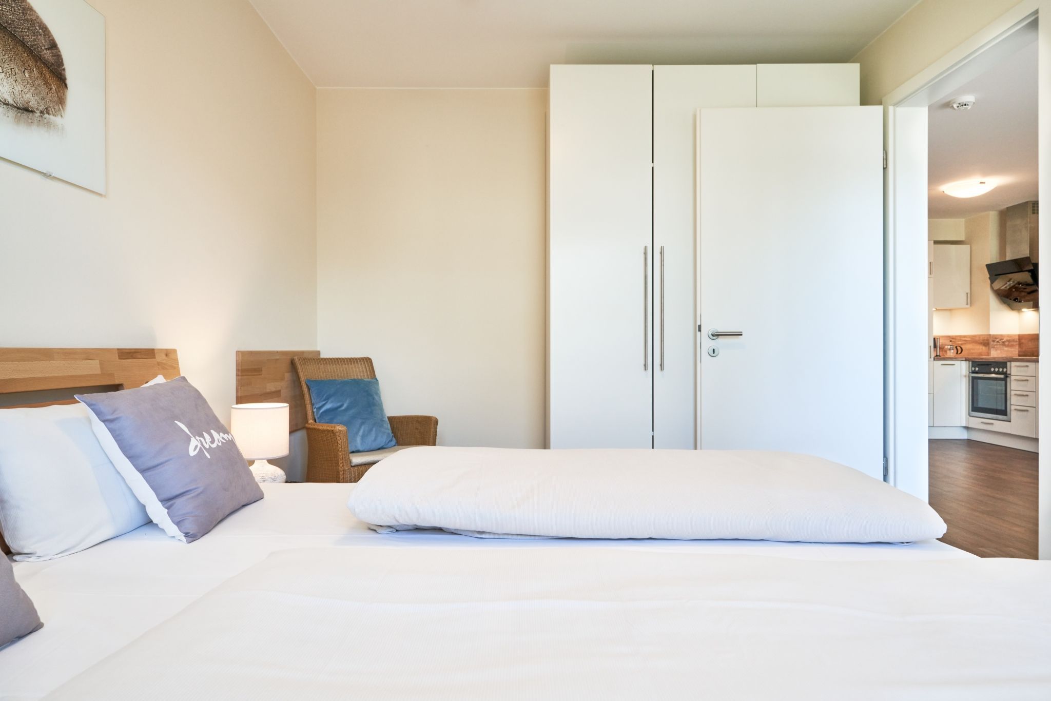 Die offene Küche ist komplett ausgestattet und lässt keine Wünsche offen. Der Wohn-Essbereich ist hell und freundlich gestaltet. Die bequeme Couch lässt sich in wenigen Handgriffen zu einem Schlafsofa umgestalten. Ein Flachbildschirm sowie eine Stereoanlage und freies WLAN sind selbstverständlich. Der Esstisch lädt zum gemütlichen Verweilen ein. Im Schlafzimmer steht ein bequemes Doppelbett mit Einzelmatratzen (0,90 x2,00m) sowie ein geräumiger Schrank. Auch im Schlafzimmer ist ein Flachbildfernseher für Sie angebracht. Das Badezimmer verfügt u. a. über eine großzügige, bodentiefe Dusche und einen zusätzlichen Handtuchheizkörper. Es gibt einen Abstellraum.