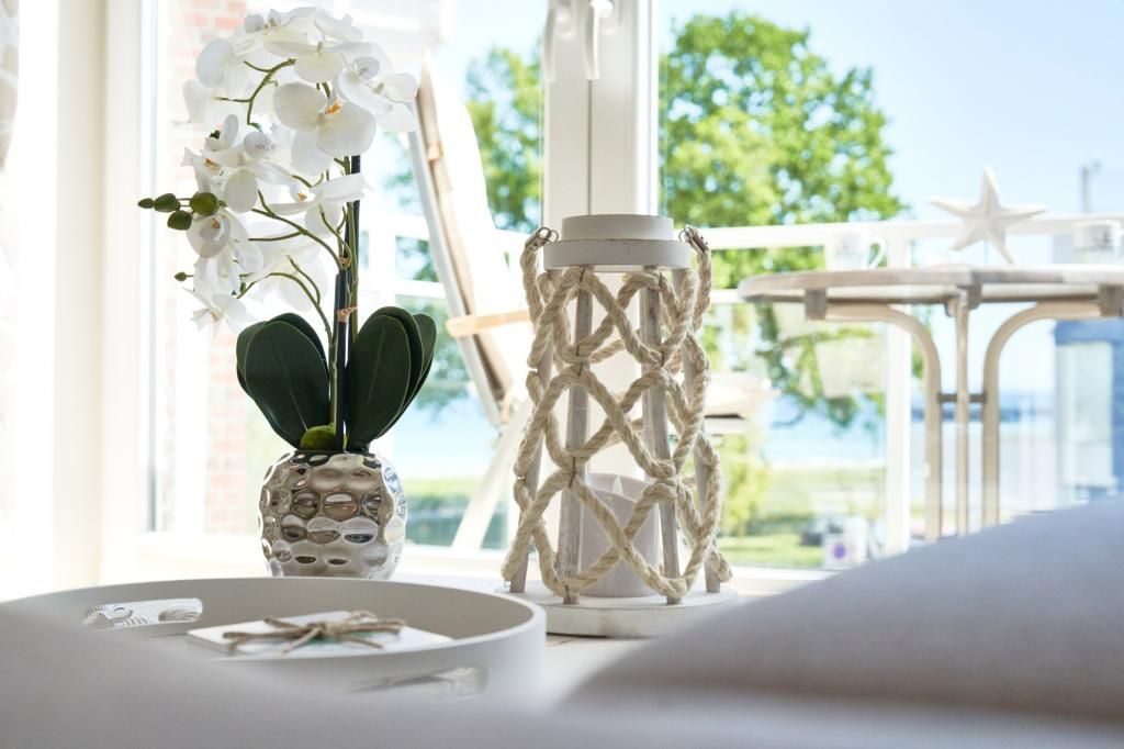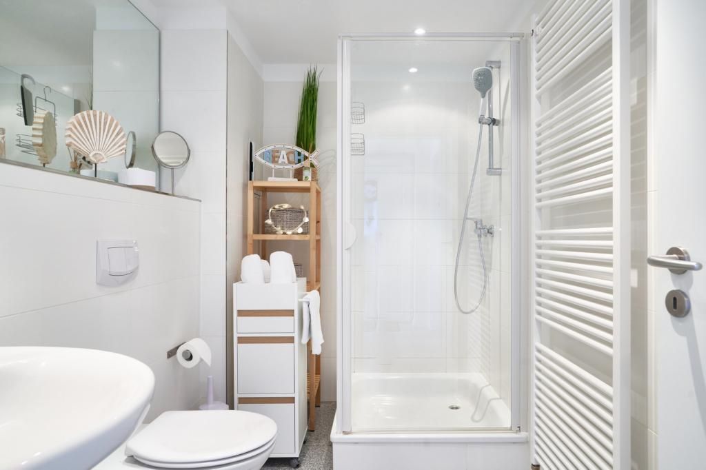 Das Duschbad ist in heller Optik gehalten. Der ansprechende Wohnbereich ist mit einer schönen Küchenzeile, einem Essbereich sowie einem gemütlichen Wohnbereich mit einer Sofaecke (Schlafsofa) ausgestattet. Neben einem Flachbildfernseher steht Ihnen selbstverständlich kostenloses WLAN zur Verfügung. Vom Wohnbereich aus gelangen Sie auf den Balkon. Von hier haben Sie einen schönen Ostseeblick. Die helle Küche lässt keine Wünsche offen. Der Esstisch bietet Ihnen ausreichend Platz für gesellige Stunden.