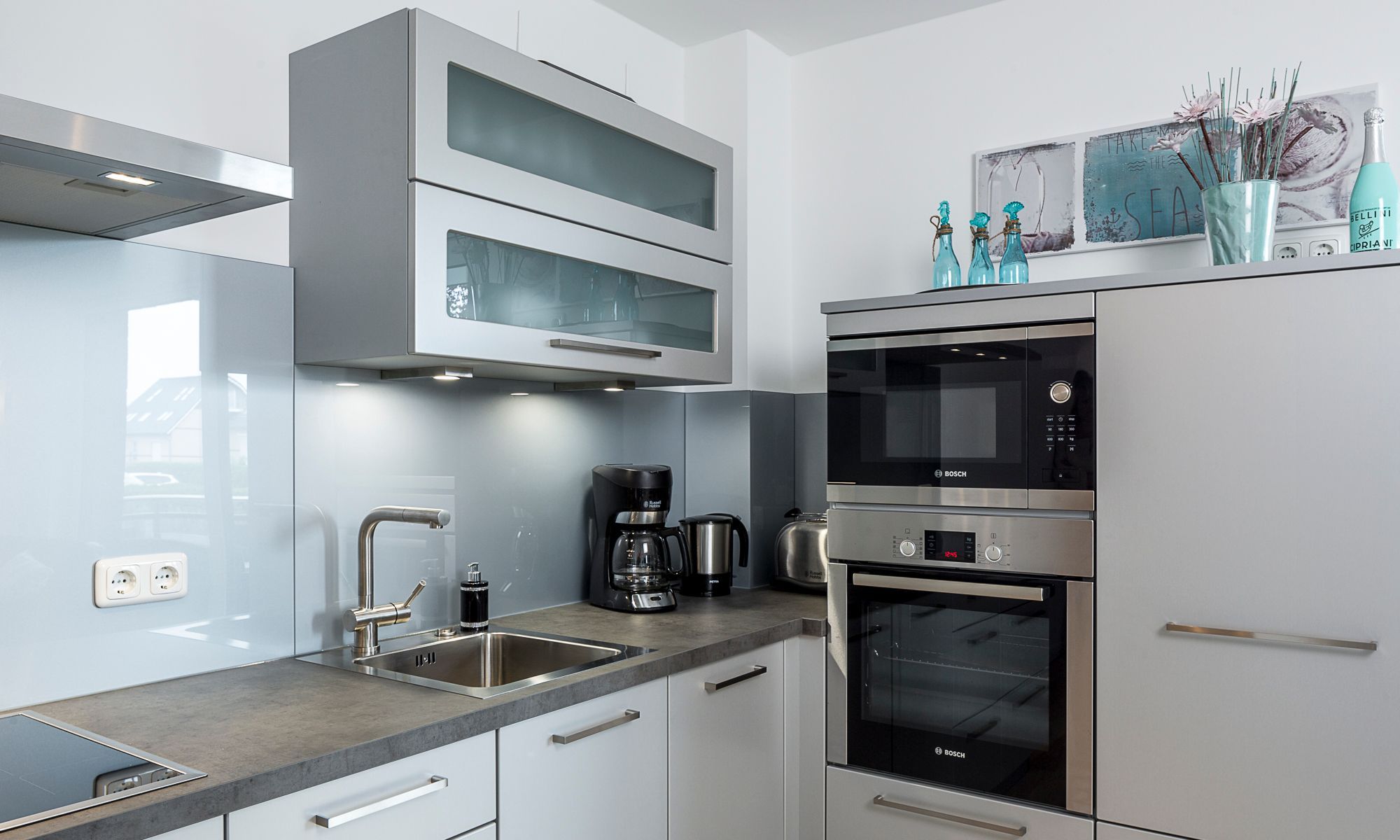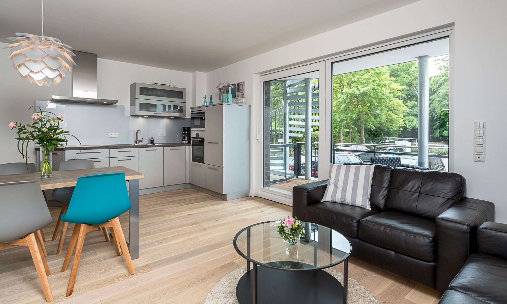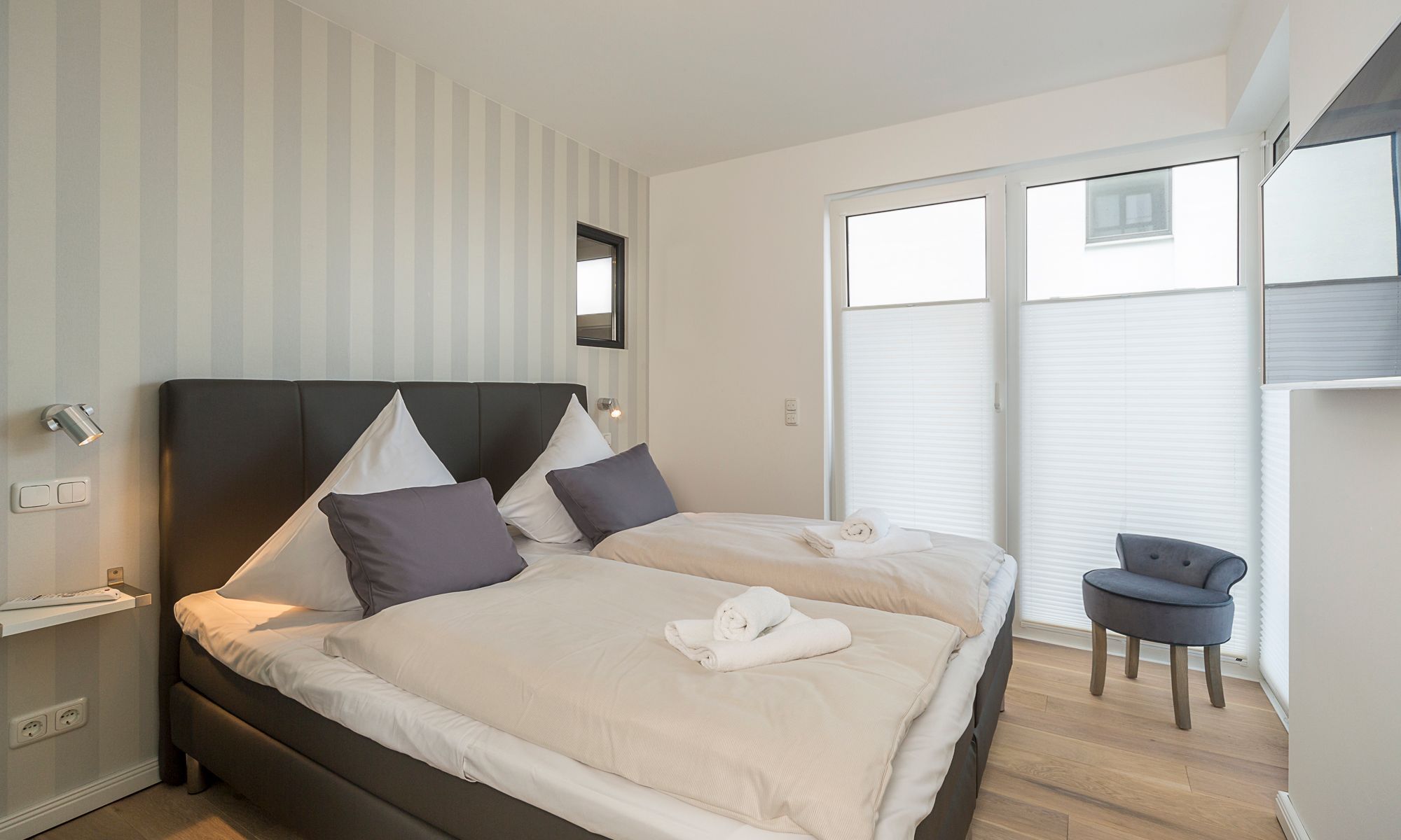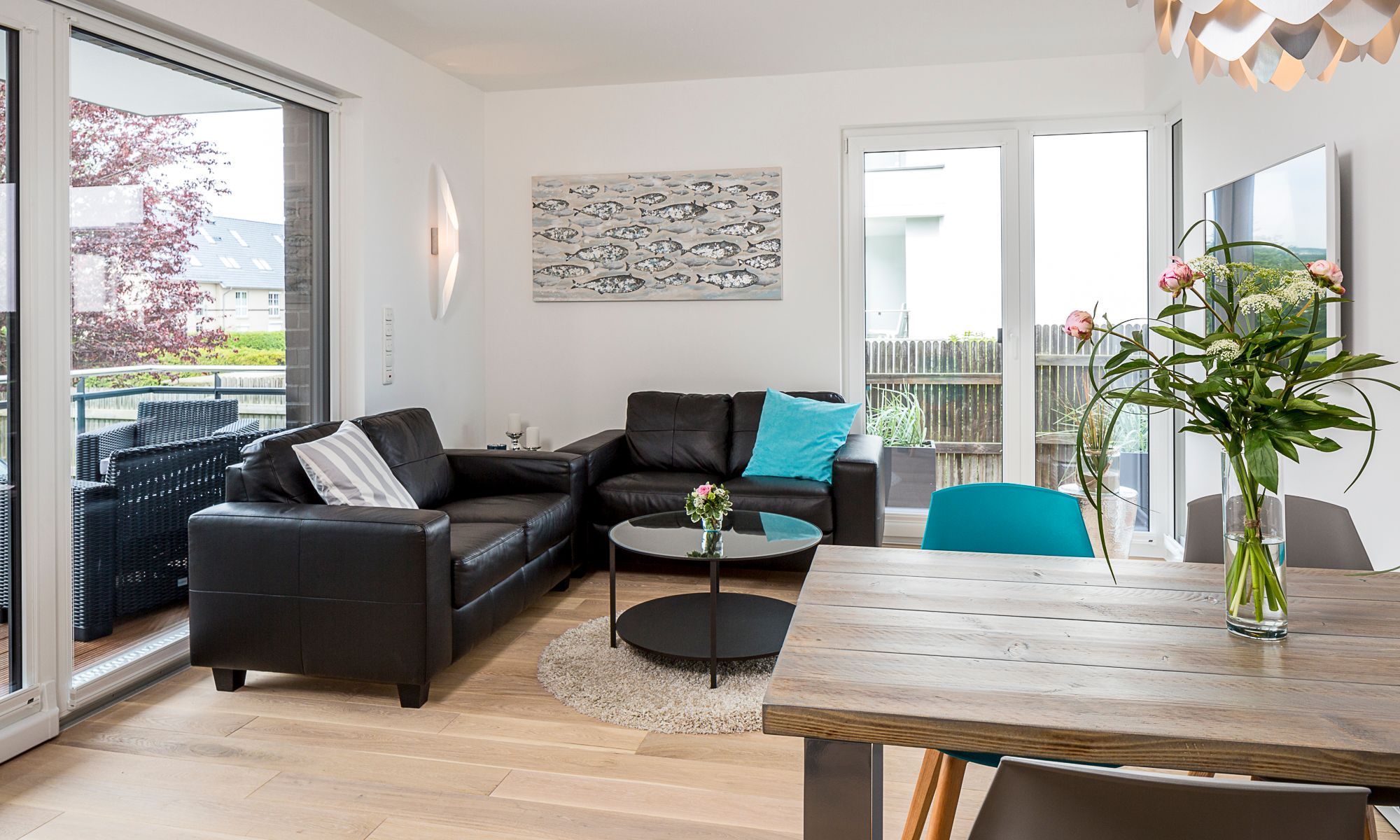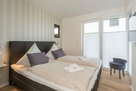 Der moderne Wohn-Essbereich bietet Ihnen eine gemütliche Sofaecke sowie einen großen Esstisch mit Stühlen für gesellige Stunden. Auf dem angrenzenden Südwestbalkon sowie der Terrasse genießen Sie die Mittags- bis Abendsonne. Neben einem Flach-TV und einer Stereoanlage steht Ihnen selbstverständlich kostenloses WLAN zur Verfügung. Die moderne Küche ist komplett ausgestattet und lässt keine Wünsche offen. Das Bad verfügt über eine bodentiefe Dusche, zwei Waschtische und einen Handtuchheizkörper sowie ein integriertes Bad-Radio. Die beiden Schlafzimmer sind mit Boxspringbetten (1,80x2,00m), einem Kleiderschrank sowie mit je einem Flach-TV ausgestattet. Alle Fenster haben elektrische Außenrollläden.