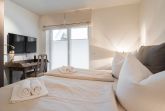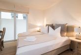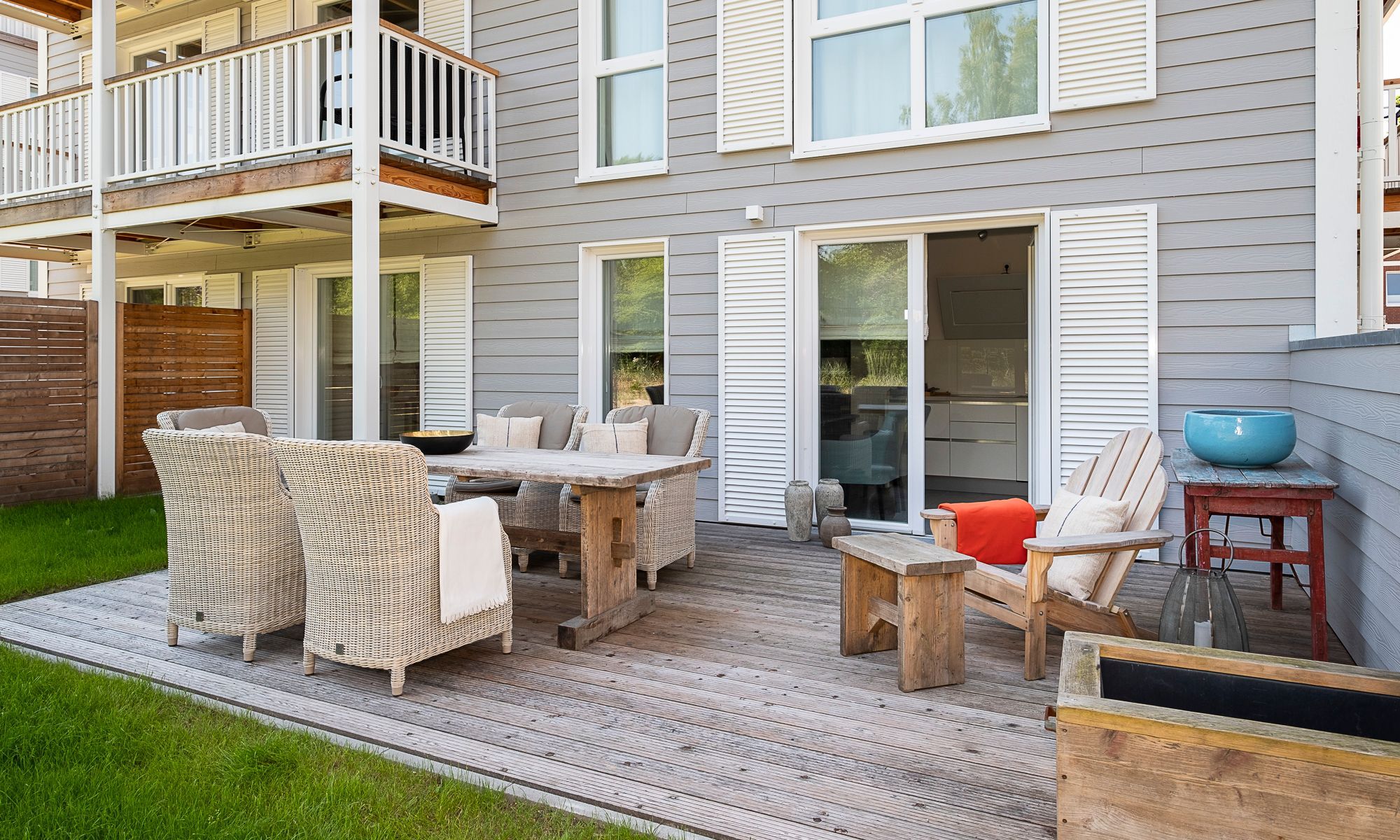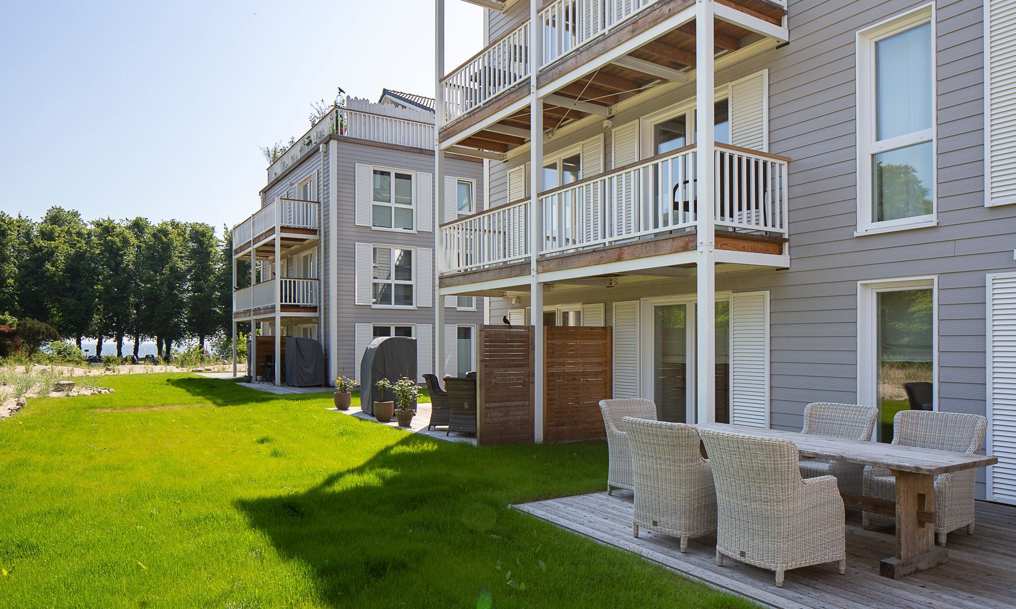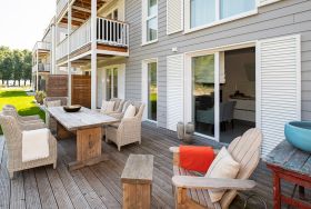 Hampton Park ist eine Zwei-Zimmer-Wohnung, 69 m² zzgl. großer Terrasse, Tiefgaragenstellplatz (Durchfahrtshöhe 2,10 m) für bis zu 4 Personen, in der Bahnhofstr. 2 A in Haffkrug.
