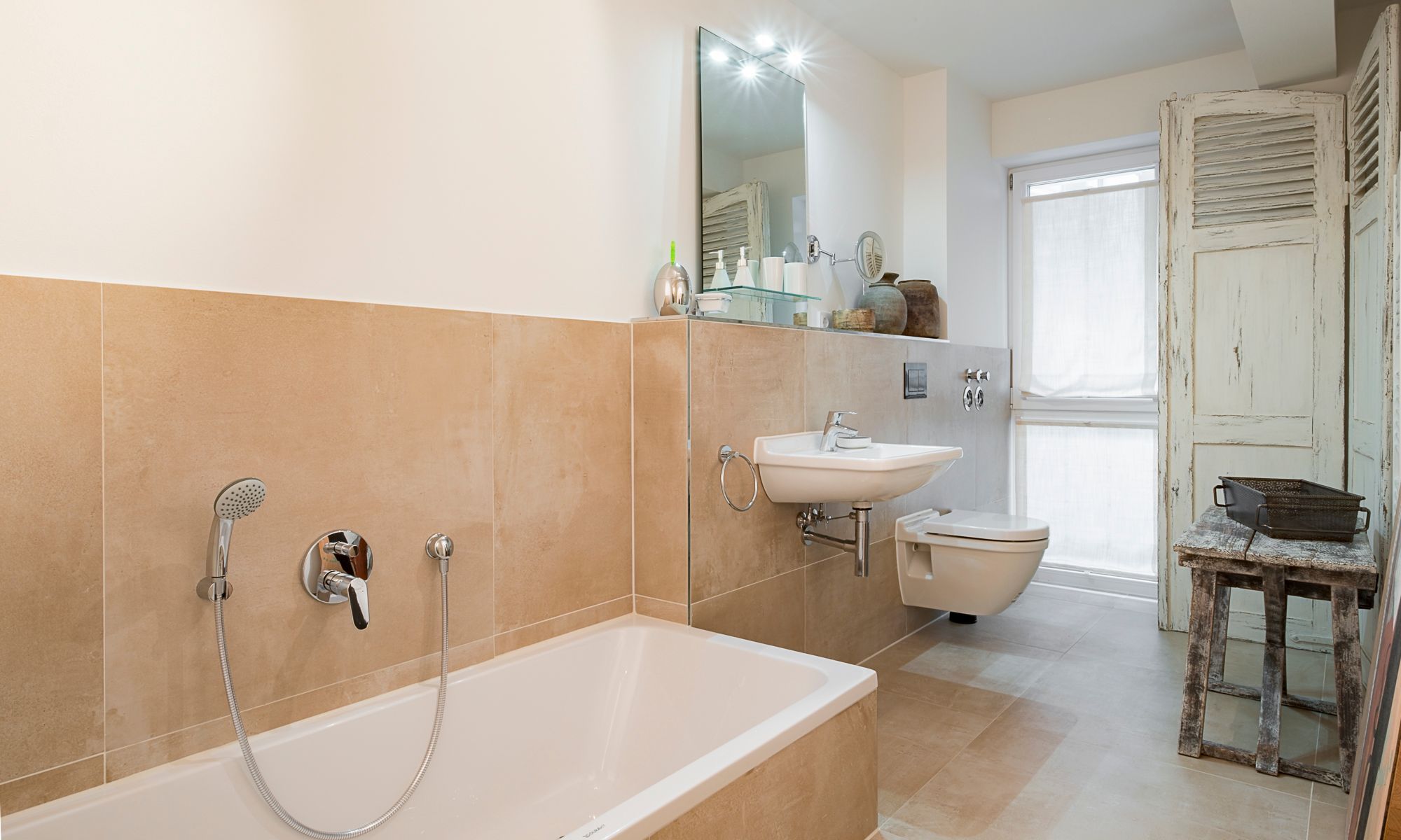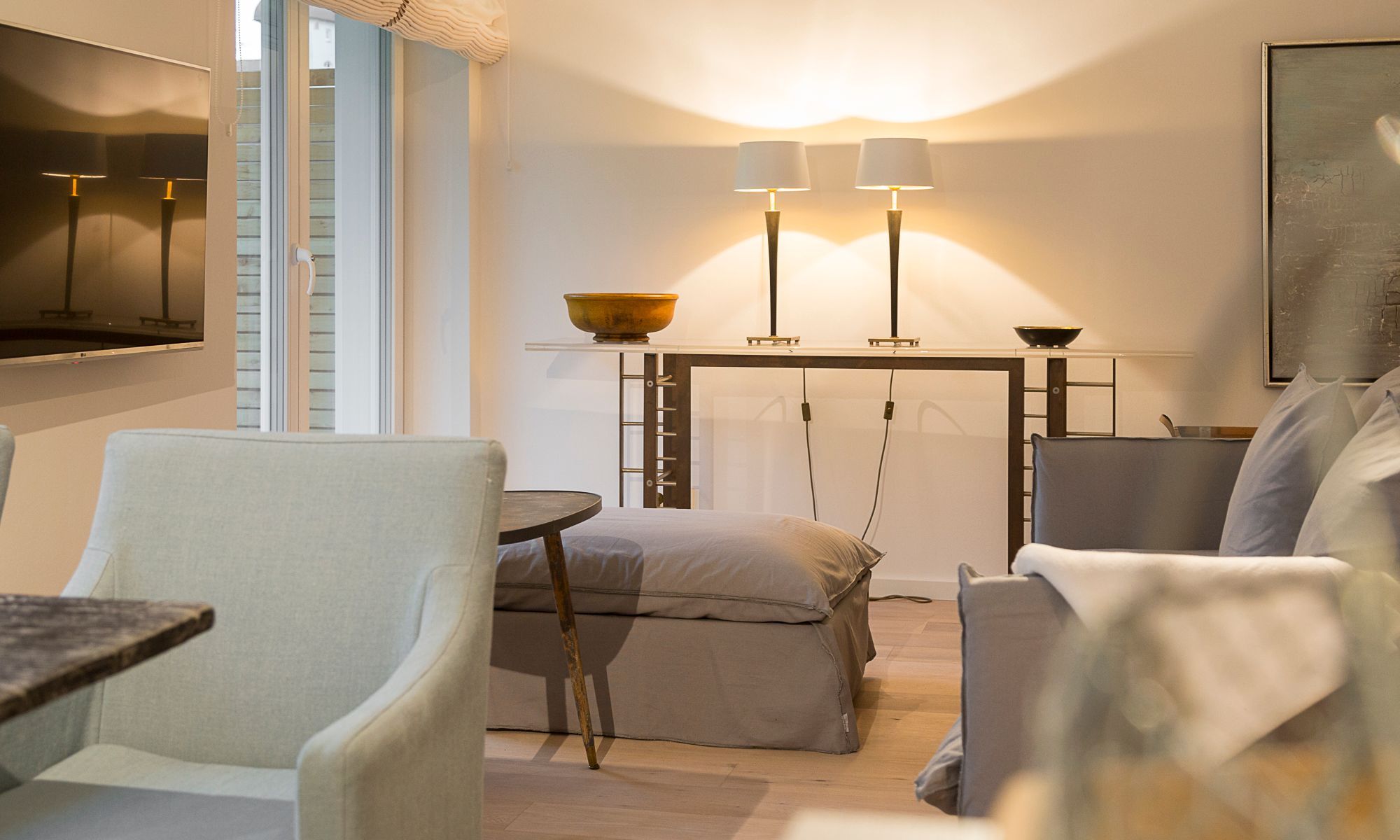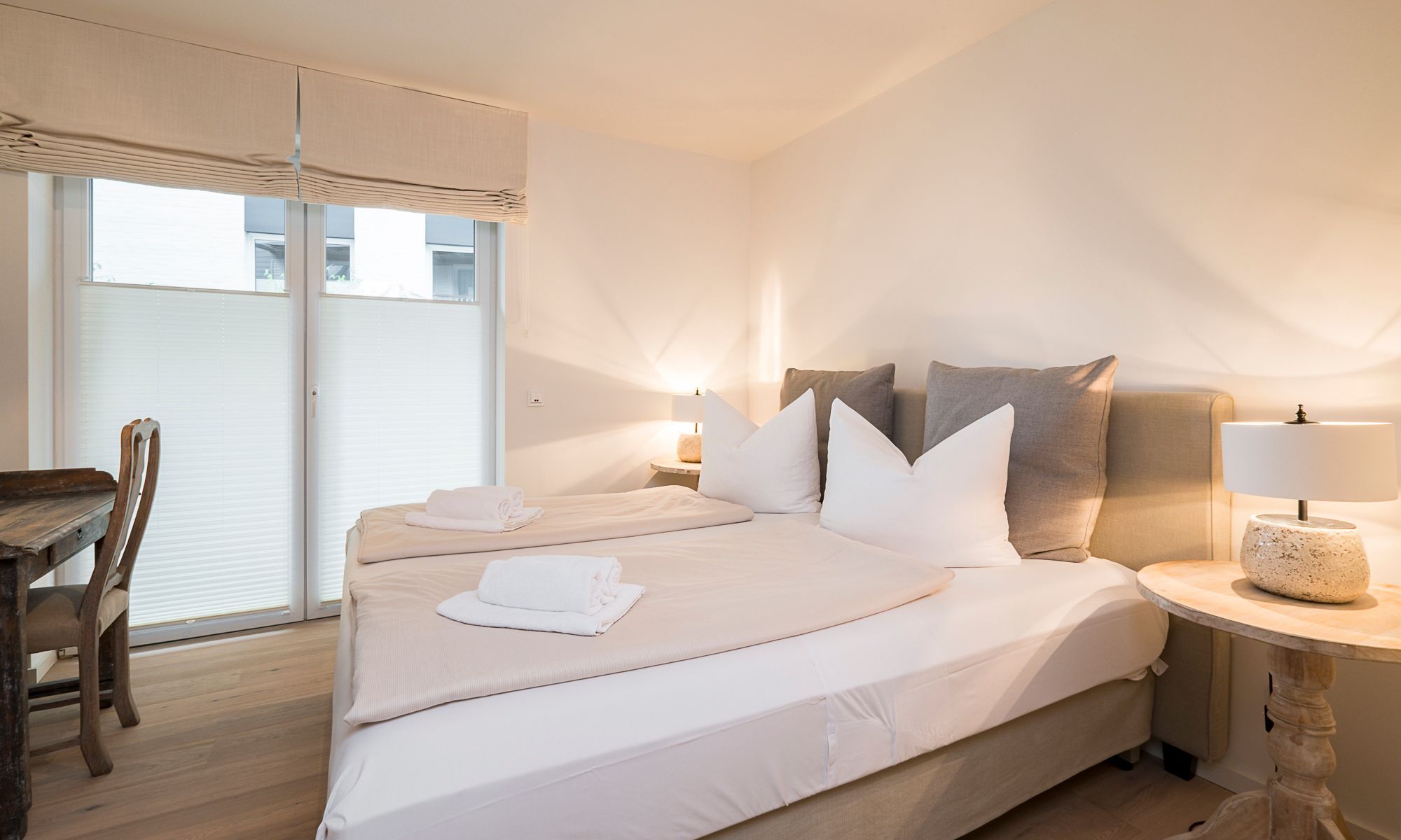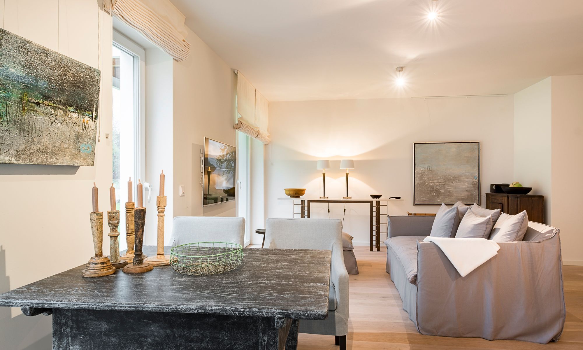 Die Einrichtung ist eine gelungene Mischung aus Modernem und Altem, alles mit einer persönlichen, künstlerischen Note ausgesucht. Vom gemütlichen Sofa (in einfachen Handgriffen entsteht hier ein bequemes Schlafsofa für 2 Personen) geht der Blick über die Terrasse ins Grüne. Der Essplatz mit 4 Polsterstühlen lädt zu geselligen Mahlzeiten und zum Verweilen ein. Die vollausgestattete Küche lässt für die Zubereitung Ihrer Mahlzeiten keine Wünsche offen. Sowohl Wohn- als auch Schlafzimmer sind mit einem TV ausgestattet. Das moderne Tageslichtbad ist mit einer ebenerdigen Dusche und einer Badewanne ausgestattet. Auch diesen Raum machen die interessanten Details zu etwas Besonderem. Die im Erdgeschoss gelegene 69 m² große Wohnung ist von der Tiefgarage bequem mit dem Fahrstuhl zu erreichen.