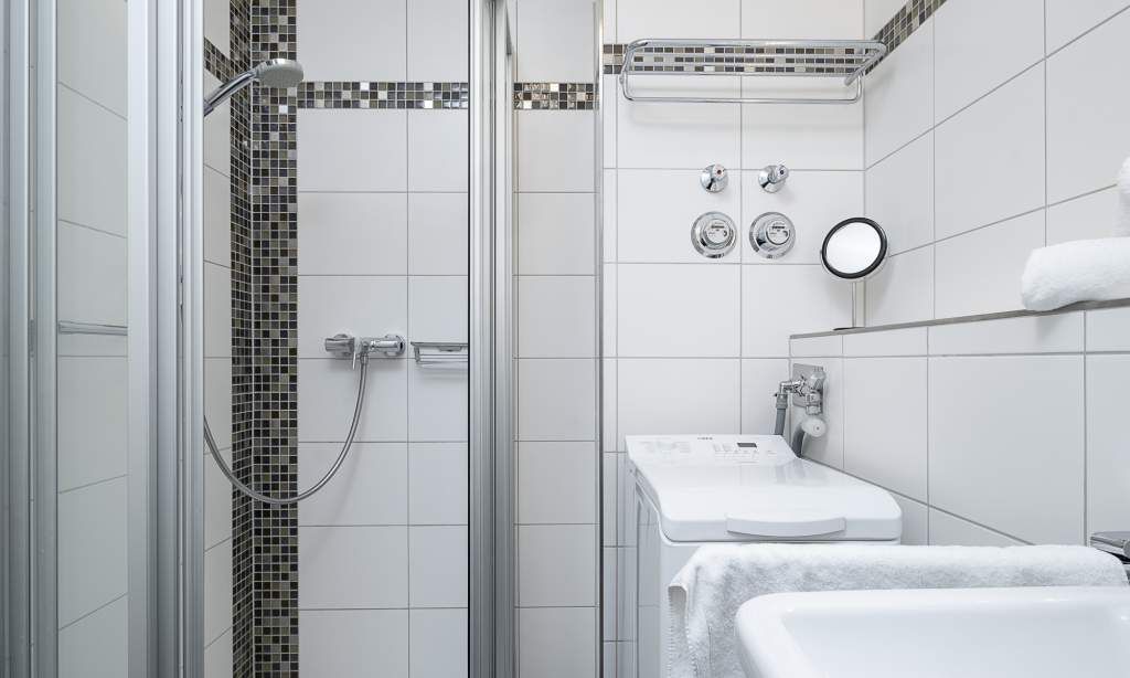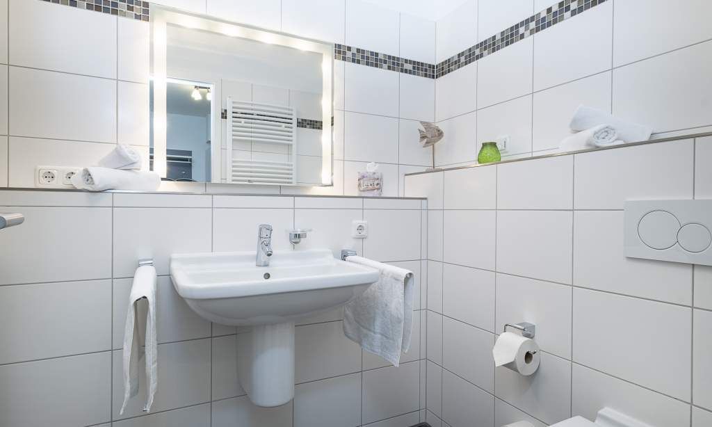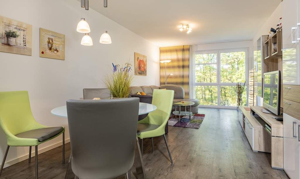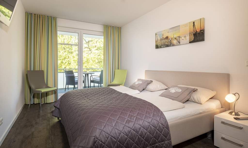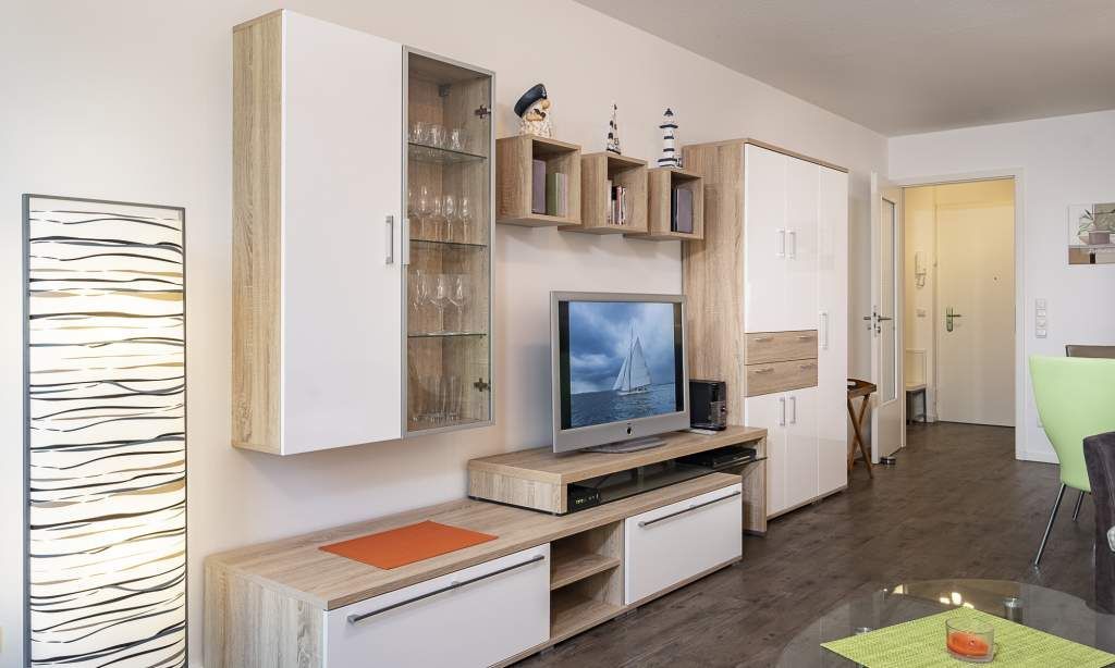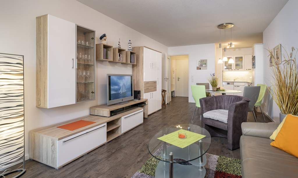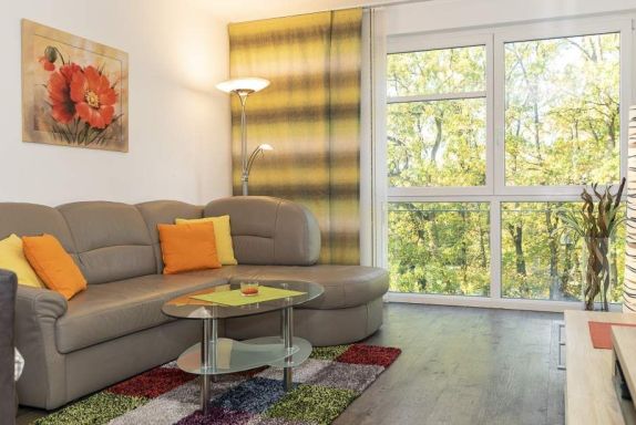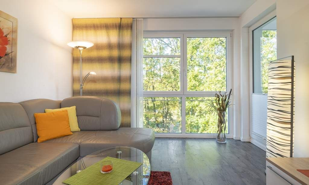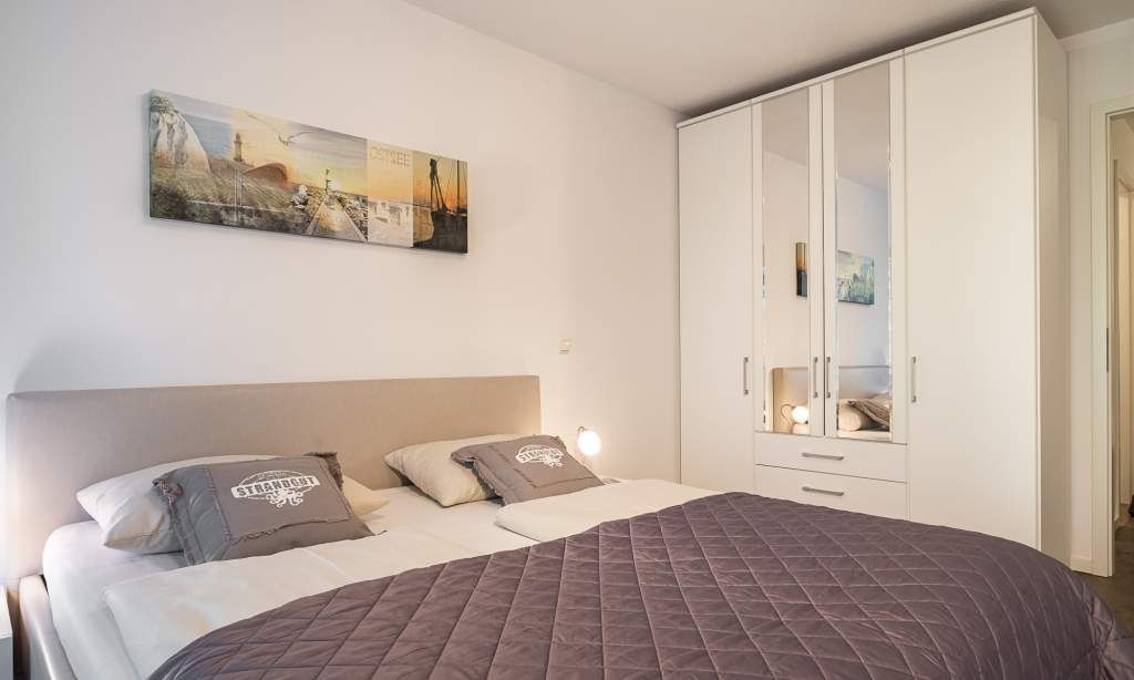 Der helle Wohnbereich mit bodentiefen Fenstern bietet einen Essplatz für 4 Personen, ein gemütliches Sofa, das sich mit wenigen Handgriffen in eine Schlafcouch (1,70 x 2,00m) verwandeln lässt, einen Flachbild-TV, WLAN, eine iPod-Dockingstation, einen Blue-Ray-Player, eine Stereoanlage und einen Safe. Die voll ausgestattete Küche lässt keine Wünsche offen. Vom Balkon aus hat man einen seitlichen Blick aufs Meer und die Aussicht in den Kurpark. Ein komfortables Doppelbett (1,80 m x 2,00 m) sorgt im Schlafzimmer für eine erholsame Nachtruhe. Hier finden Sie den zweiten Flachbild-TV. Im Badezimmer mit bodengleicher Dusche ist auch die Waschmaschine untergebracht. Die Wohnung liegt direkt gegenüber dem Kurpark, nur wenige Schritte von der Fußgängerzone und der Ostsee entfernt. Sie verfügt über einen Safe und einen abschließbaren Fahrradkeller.