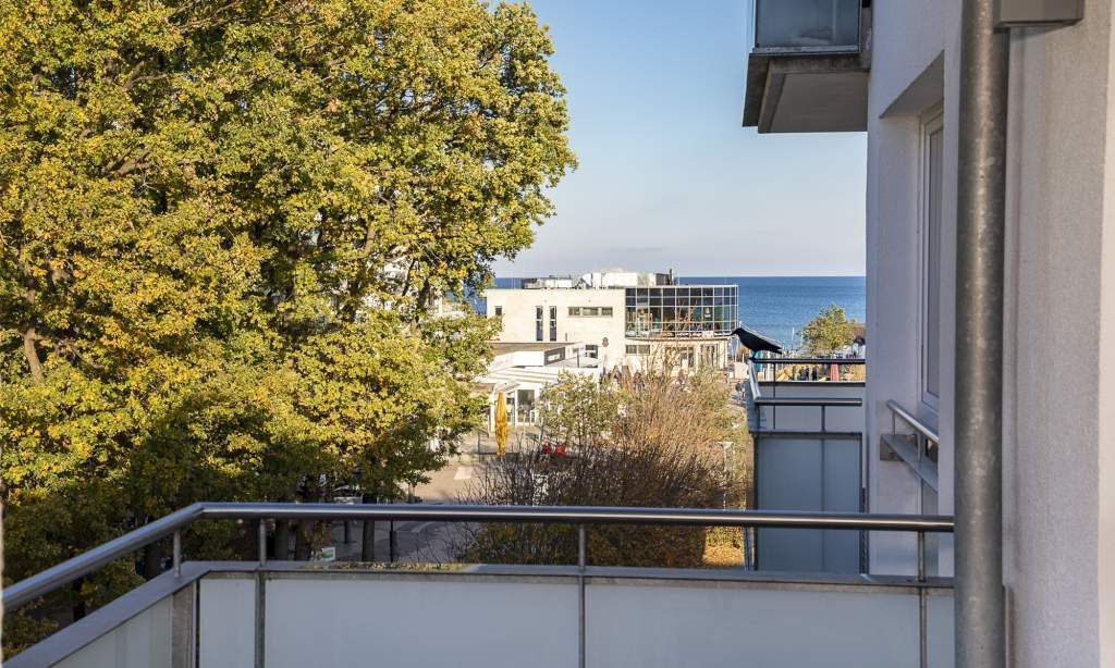 Schöner Balkon mit Blick in den Kurpark und seitlichem Meerblick. Tiefgaragenstellplatz in Haus B inklusive (Durchfahrtshöhe 1,98 m).