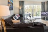 Der geräumige Wohn-Essbereich mit einer voll ausgestatteten Küchenzeile mit hochwertigen Markengeräten und einer Nespresso-Maschine lässt keine Wünsche offen. Der runde Esstisch mit Platz für bis zu 4 Personen ermöglicht gesellige Stunden auch mit Gästen. Vom großzügigen Weylandts-Eck-Sofa hat man einen wunderschönen Blick in die umliegenden grünen Gärten. Es ist keine rückwärtige Bebauung vorhanden. Design-Klassiker wie Riviera-Maison-Couchtisch und -Sideboards, Arne-Jacobsen-Stühle, Artemide-Leuchten, Hästens-Betten und Lexington-Geschirr begeistern Designfreunde und sorgen für eine stylische, aber auch gemütliche Atmosphäre. Alles wurde mit viel Liebe zum Detail aufeinander abgestimmt und bietet luxuriösen Komfort.
