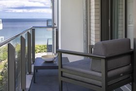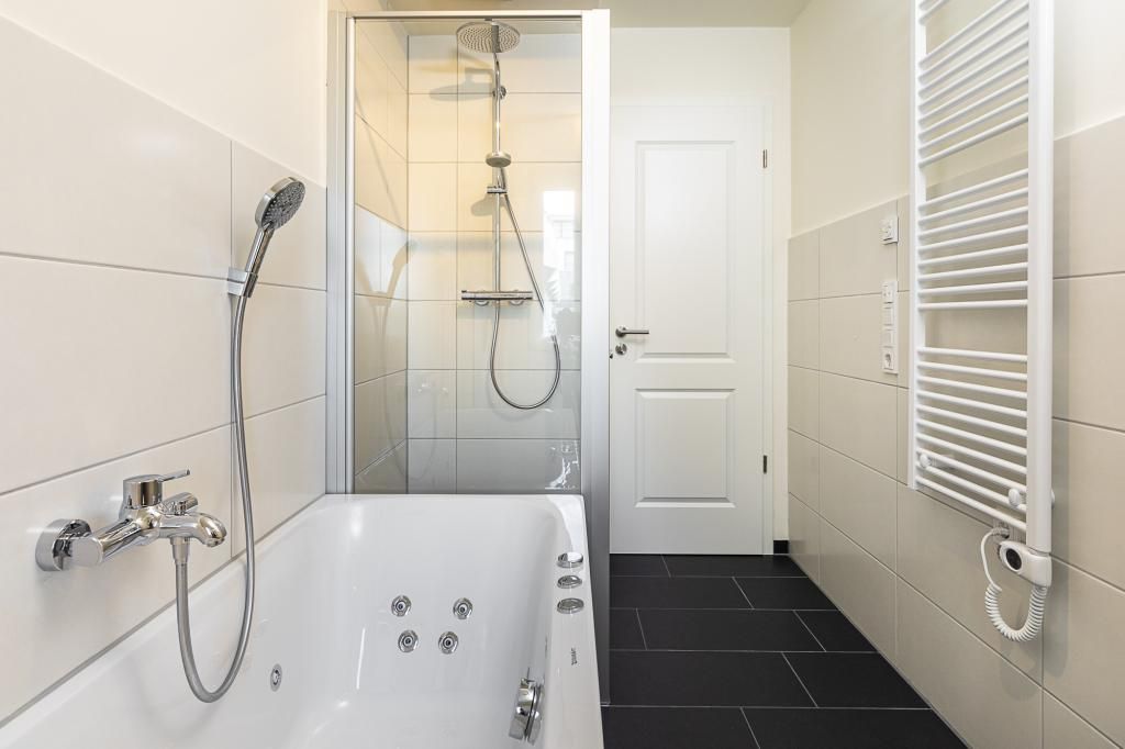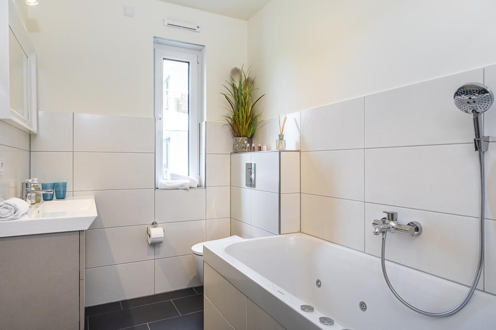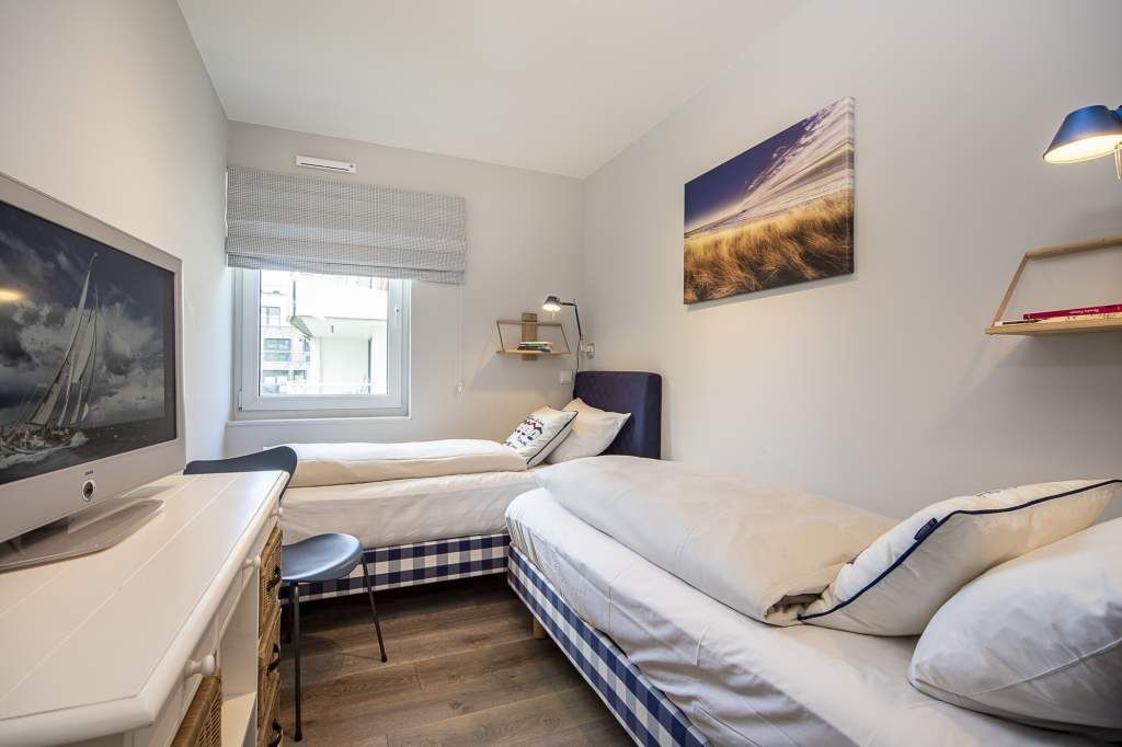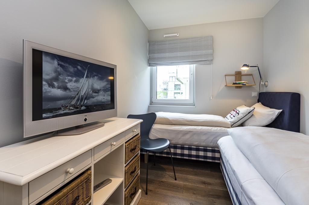 Die Wohnung bietet alle Annehmlichkeiten eines modernen Neubaus, wie bodentiefe Fenster mit Außenjalousien, Fußbodenheizung, hochwertiges Echtholzparkett und einen großzügigen Eckbalkon mit seitlichem Meerblick. Die Wohnung verfügt über 2 Schlafzimmer und bietet Platz für bis zu 4 Personen. Beide Schlafzimmer verfügen über Flachbildfernseher und Boxspringbetten der Luxusmarke Hästens, das Hauptschlafzimmer über ein großes Doppelbett (1,80 x 2,00m), das 2. Schlafzimmer über 2 Einzelbetten. Das Wellness-Badezimmer mit Tageslicht ist sowohl mit einer bodentiefen Dusche als auch mit einer Badewanne mit Whirlpool-Funktion ausgestattet; selbstverständlich sind Handtuchheizkörper und ein großzügiger Waschtisch mit ausreichend Ablagefläche.
