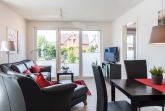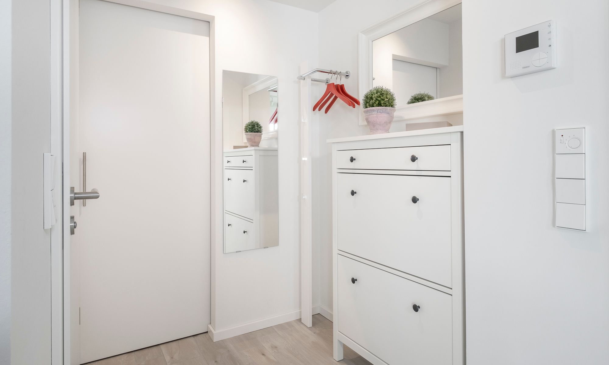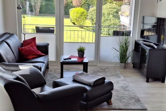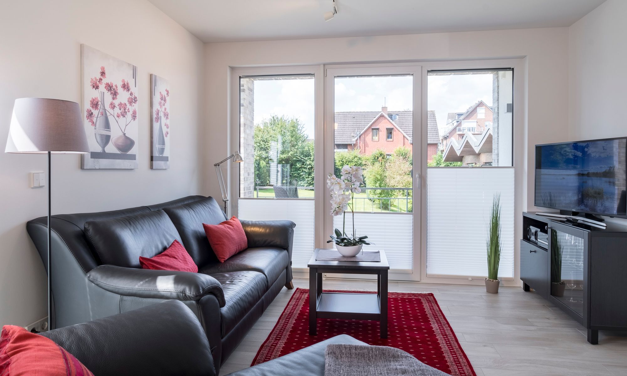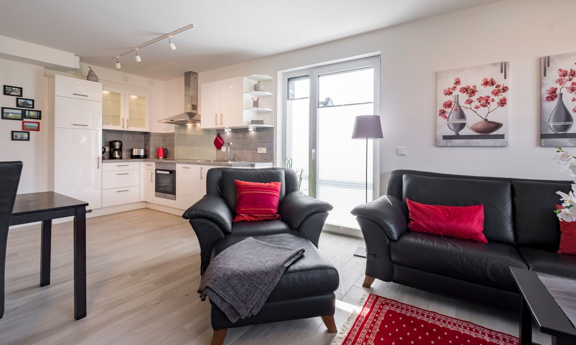 Die Ferienwohnung strahlt mit ihren bodentiefen Fenstern eine helle, behagliche Gemütlichkeit aus. Sie bietet Ihnen am Eingang eine Garderobenecke mit geschmackvollem Schuhschrank, Garderobenpaneel und Ganzkörperspiegel. Die offene Küche im Wohn-Essbereich ist komplett ausgestattet und lässt keine Wünsche offen. Im Wohnbereich finden Sie alles, was man zur Entspannung benötigt, ein ansprechendes großes Ledersofa sowie einen bequemen Sessel samt Fußhocker. Ein Flachbildschirm sowie eine Stereoanlage und freies WLAN sind selbstverständlich. Der Esstisch lädt mit seinen Schwingstühlen zu einem gemütlichen Verweilen ein. Im Schlafzimmer steht ein bequemes Boxspringbett der Marke Ruf (1,80 x 2,00m) sowie ein geräumiger Schrank. Auch im Schlafzimmer ist ein Flachbildfernseher für Sie angebracht. Das Badezimmer verfügt u. a. über eine großzügige, bodentiefe Walk-in-Dusche und einen zusätzlichen Handtuchheizkörper. Es gibt einen Abstellraum mit Waschmaschine und weiterem Stauraum.