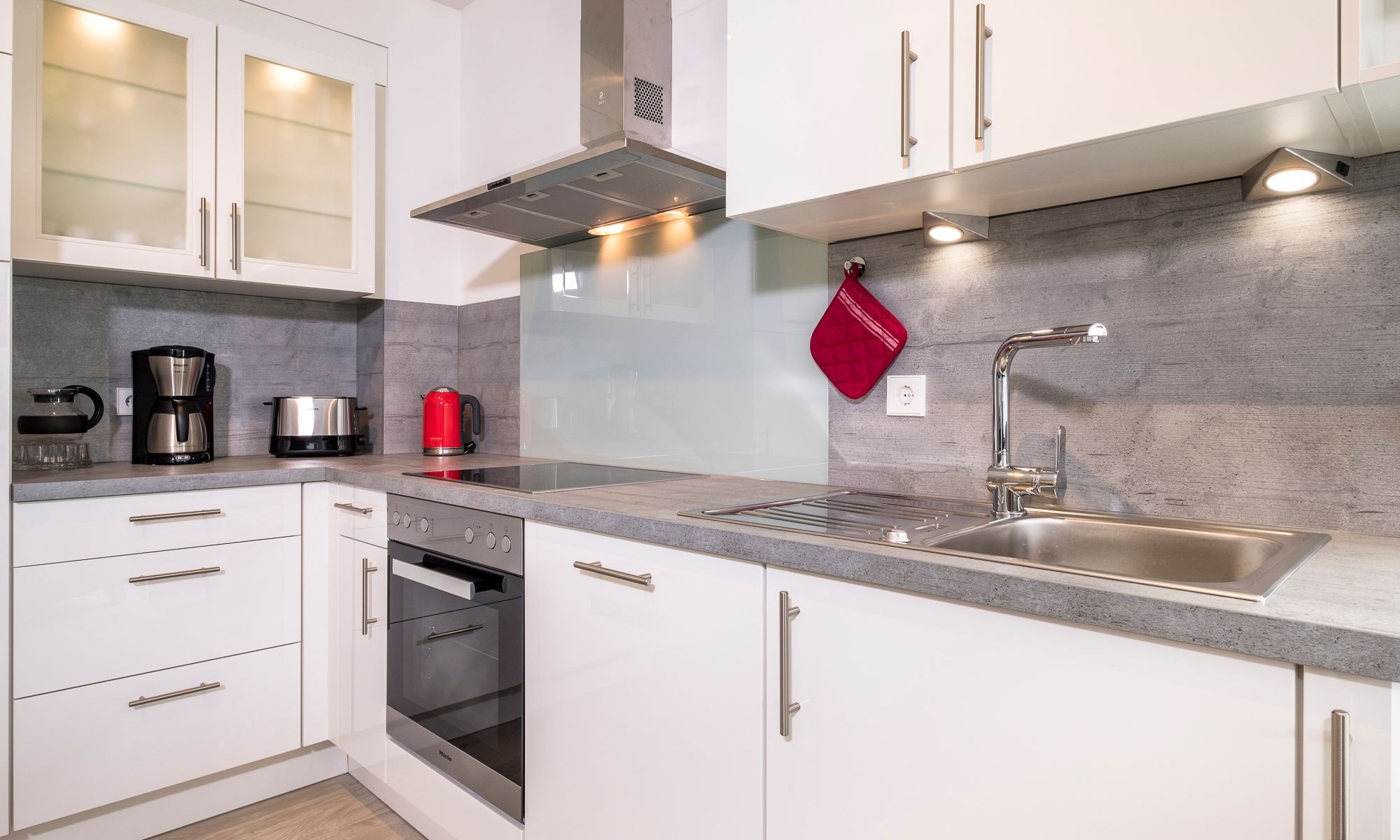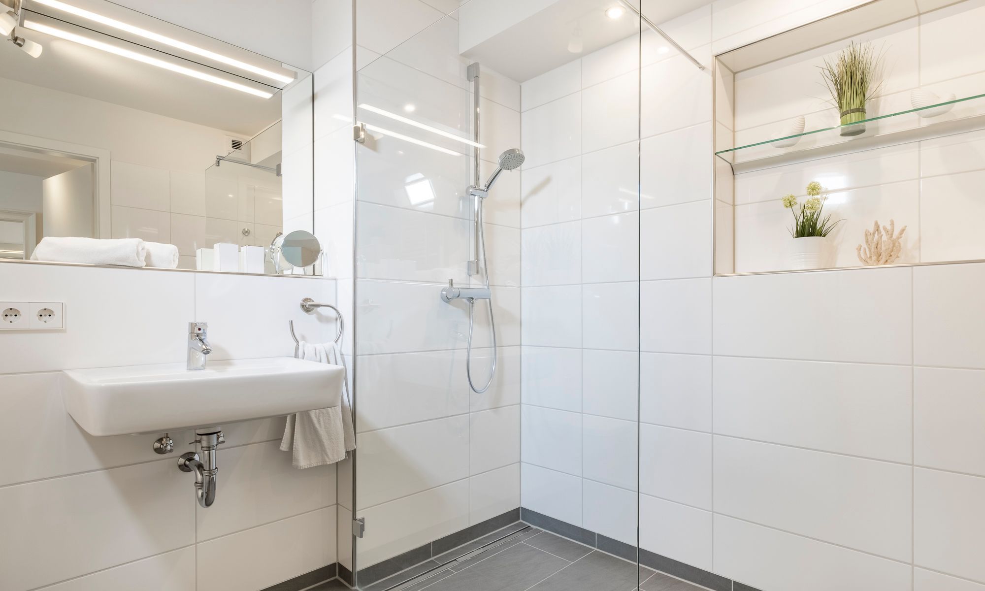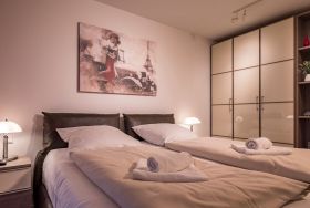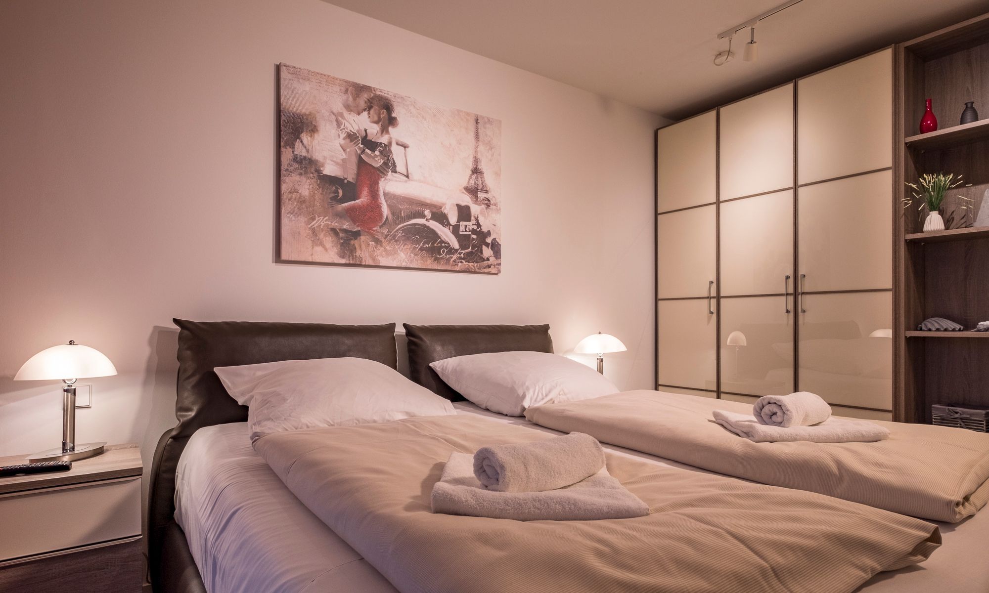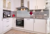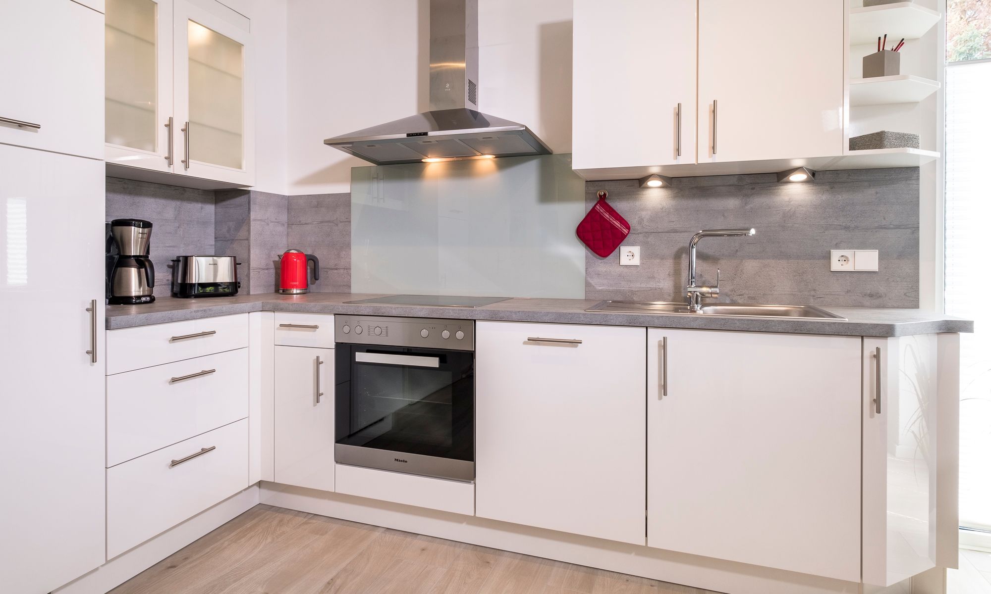 Die Ferienwohnung strahlt mit ihren bodentiefen Fenstern eine helle, behagliche Gemütlichkeit aus. Sie bietet Ihnen am Eingang eine Garderobenecke mit geschmackvollem Schuhschrank, Garderobenpaneel und Ganzkörperspiegel. Die offene Küche im Wohn-Essbereich ist komplett ausgestattet und lässt keine Wünsche offen. Im Wohnbereich finden Sie alles, was man zur Entspannung benötigt, ein ansprechendes großes Ledersofa sowie einen bequemen Sessel samt Fußhocker. Ein Flachbildschirm sowie eine Stereoanlage und freies WLAN sind selbstverständlich. Der Esstisch lädt mit seinen Schwingstühlen zu einem gemütlichen Verweilen ein. Im Schlafzimmer steht ein bequemes Boxspringbett der Marke Ruf (1,80 x 2,00m) sowie ein geräumiger Schrank. Auch im Schlafzimmer ist ein Flachbildfernseher für Sie angebracht. Das Badezimmer verfügt u. a. über eine großzügige, bodentiefe Walk-in-Dusche und einen zusätzlichen Handtuchheizkörper. Es gibt einen Abstellraum mit Waschmaschine und weiterem Stauraum.