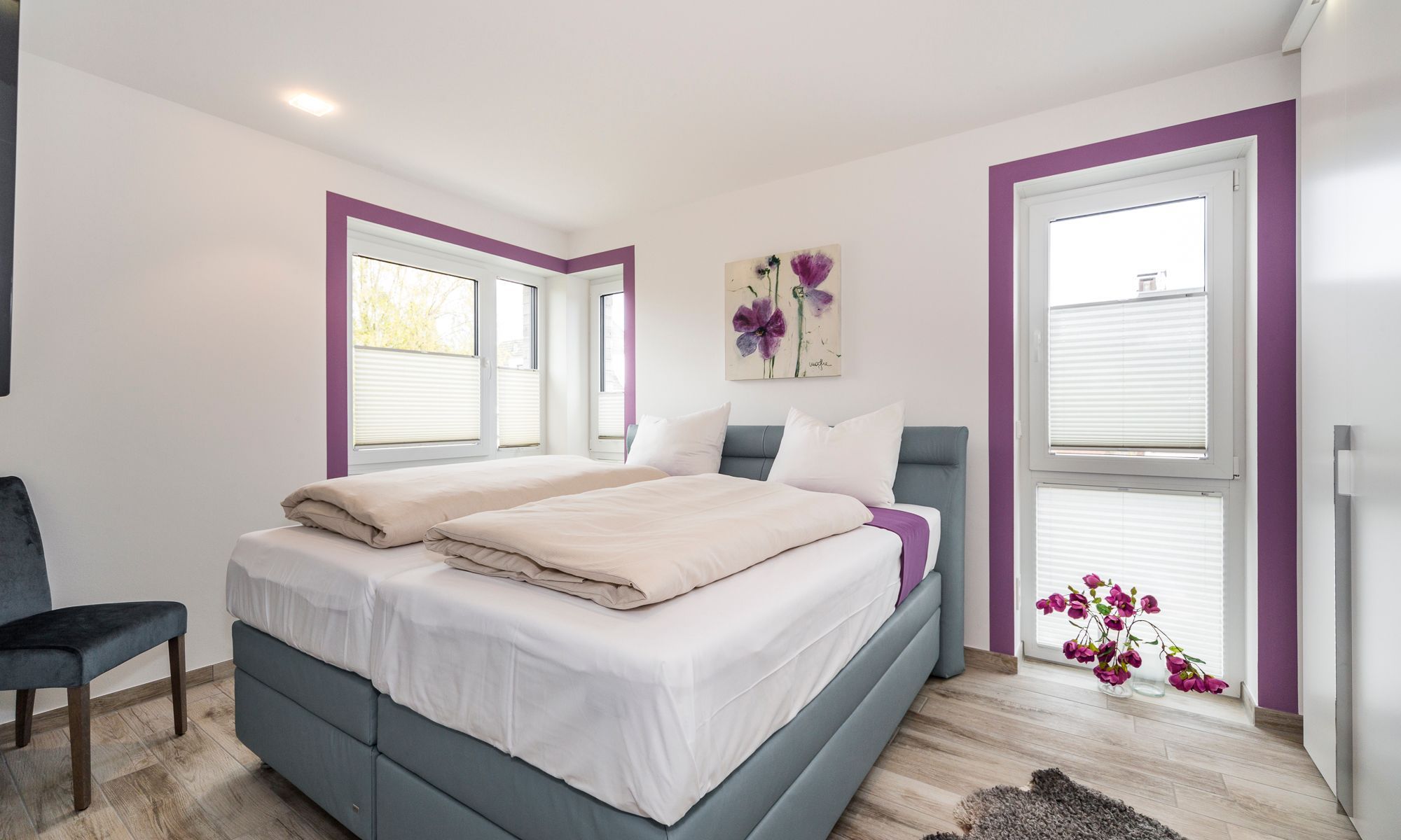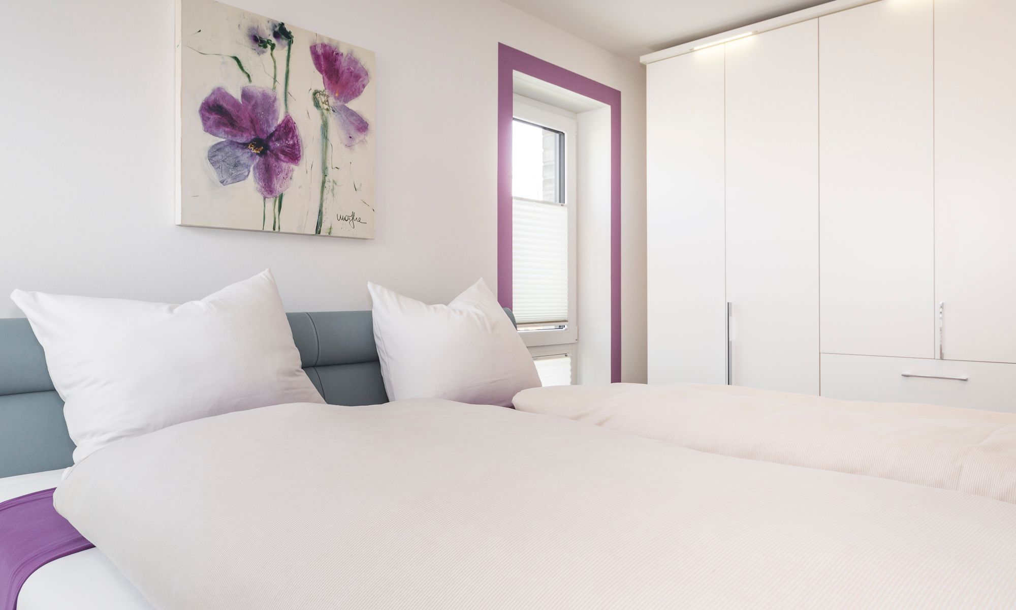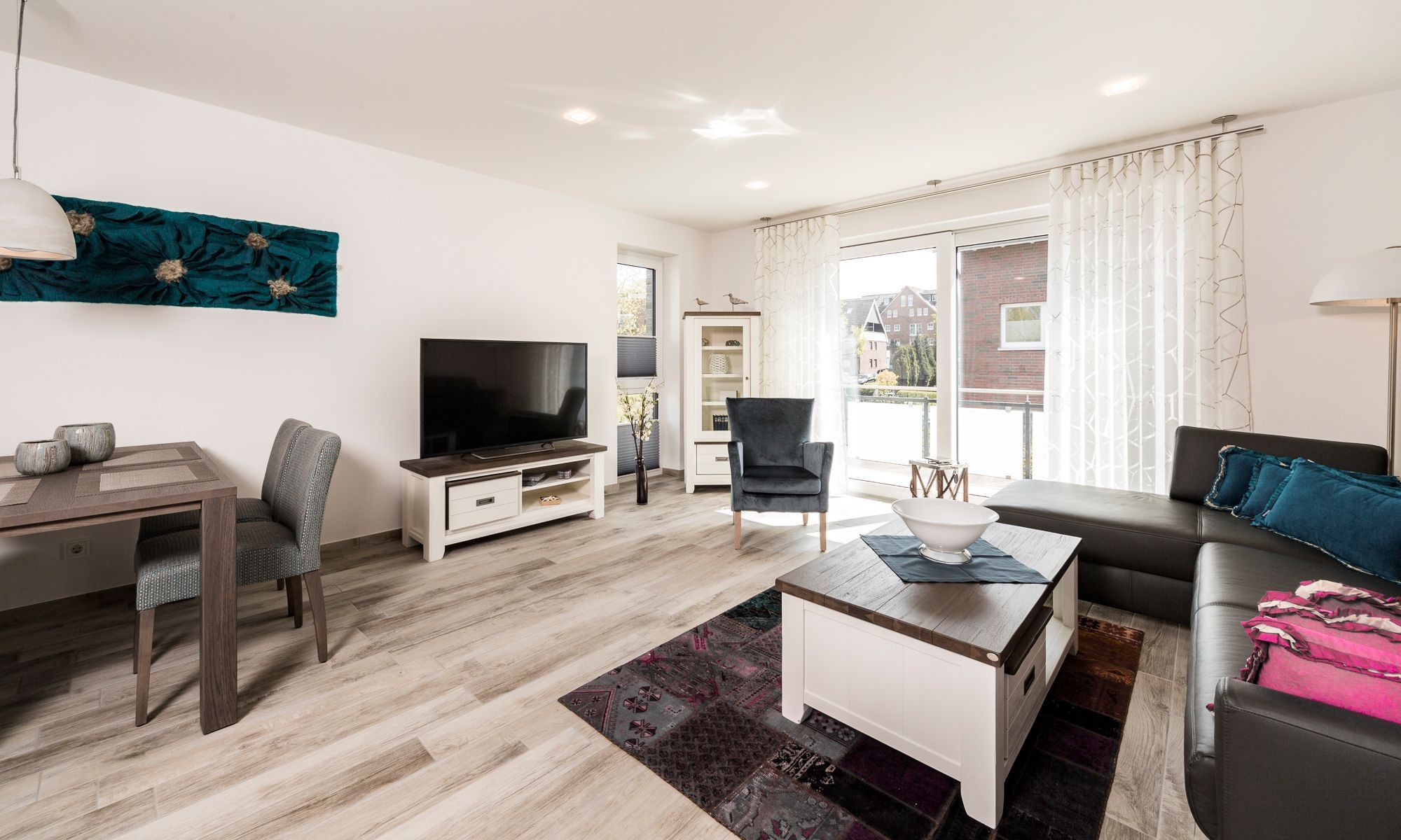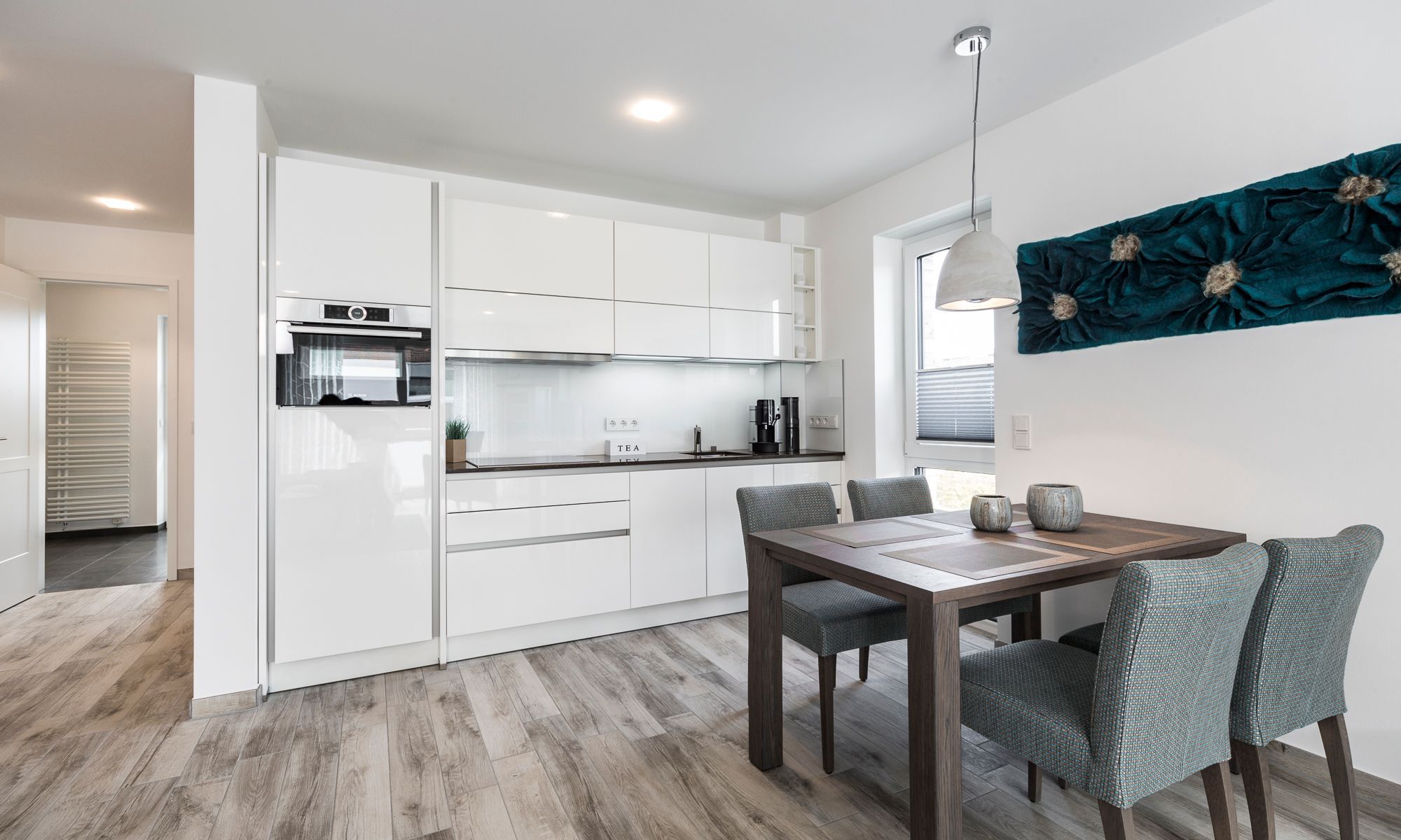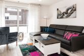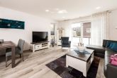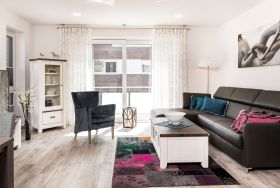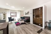 Die Ferienwohnung ist durchgehend mit einem Bodenbelag in angenehmer Holzoptik und Fußbodenheizung ausgestattet. Die sehr moderne und voll ausgestattete Küche lässt keine Wünsche offen. Neben einer Filterkaffeemaschine steht zusätzlich eine Nespresso-Kapselmaschine für Sie bereit. Der Wohnraum verfügt über einen Essbereich sowie einen gemütlichen Sitzbereich. Die Couch lässt sich mit nur wenigen Handgriffen in eine bequeme Schlafcouch (1,40 x 2,00 m) umfunktionieren. Kostenloses WLAN ist selbstverständlich. Im Schlafzimmer erwartet Sie ein geräumiger Schrank, ein komfortables Boxspringbett (1,80 x 2,00 m) sowie ein Flachbildfernseher. Das Tageslichtbad verfügt über eine bodengleiche Dusche mit Regendusche und eine Waschmaschine steht hier für Sie bereit. Der Balkon Richtung Süden ist mit einem hochwertigen Tisch und Stühlen ausgestattet.