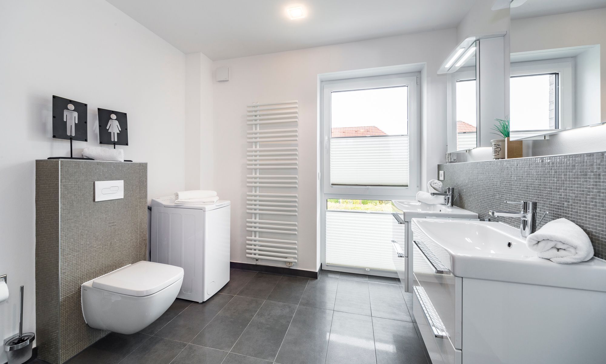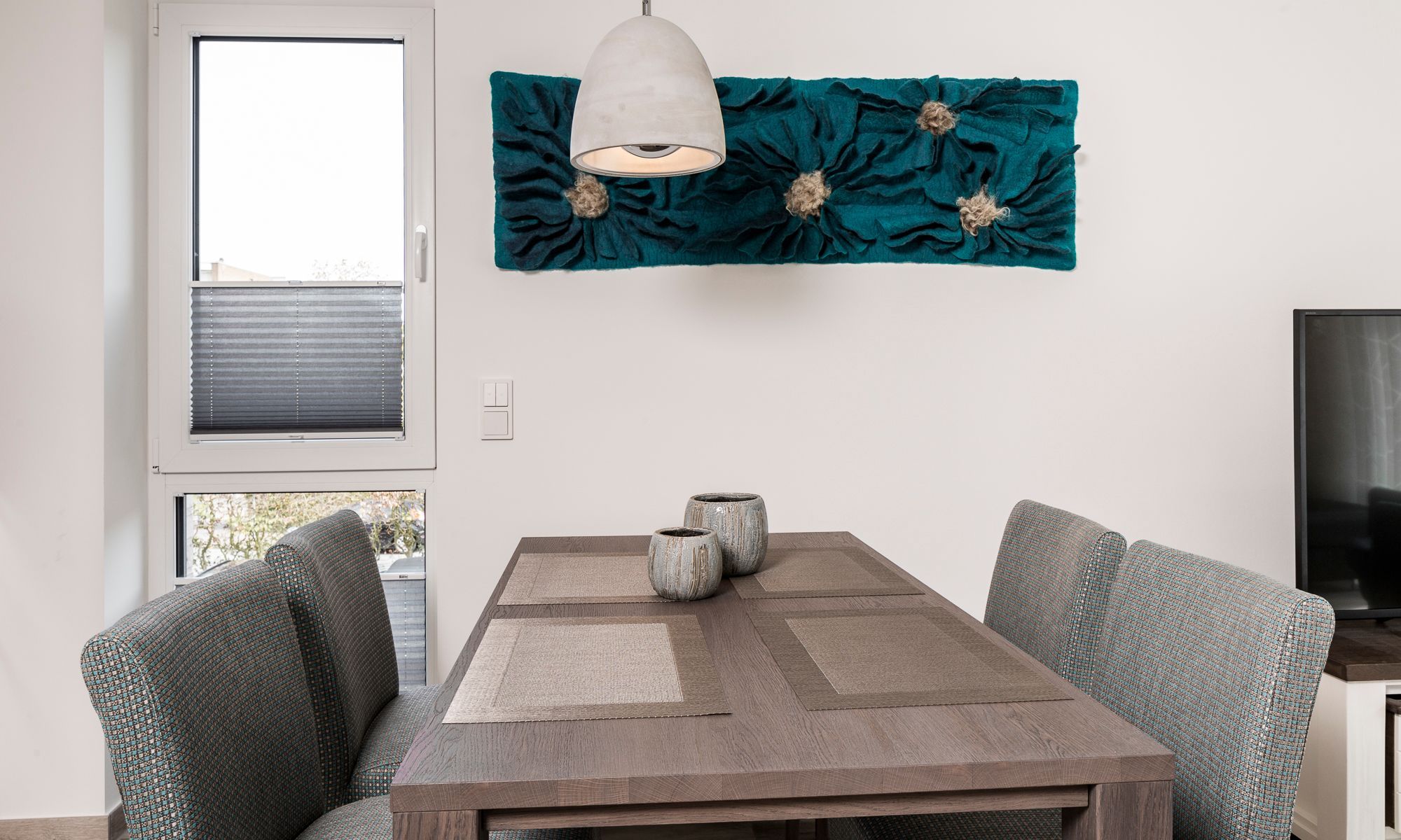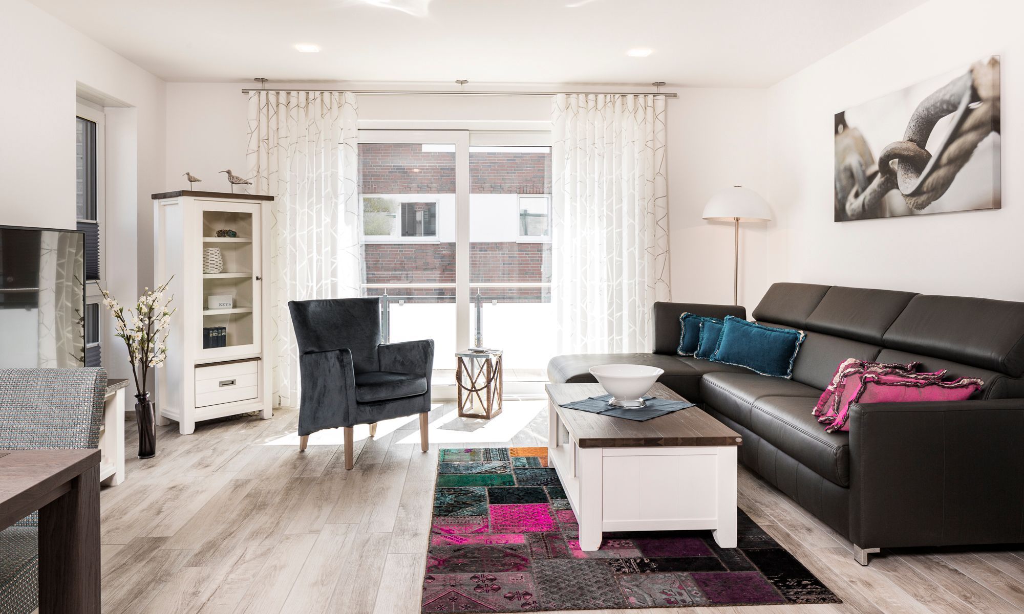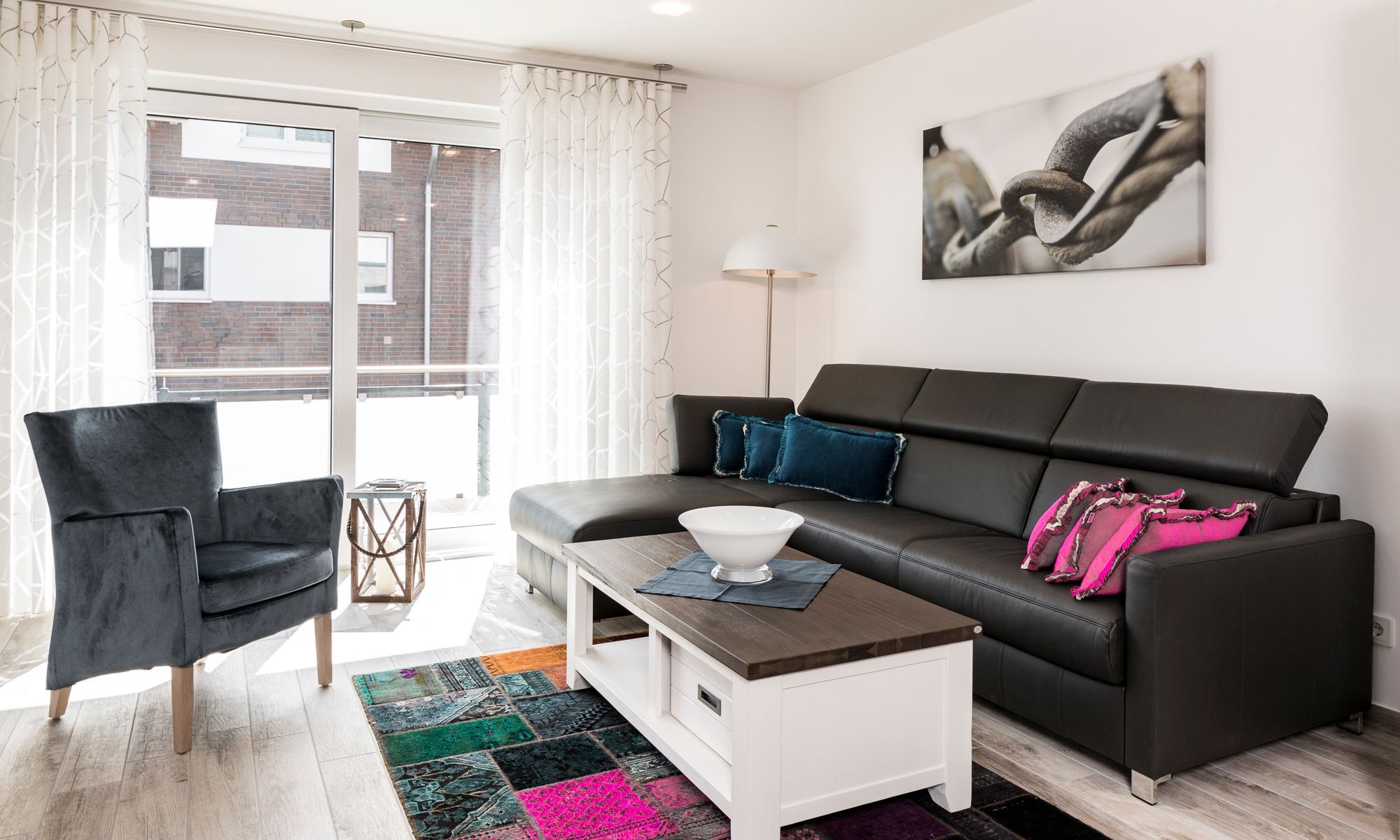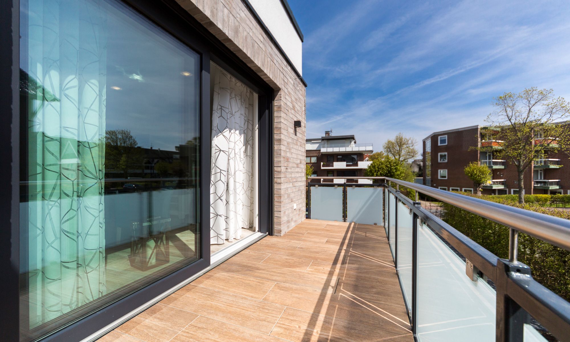 Die Ferienwohnung ist durchgehend mit einem Bodenbelag in angenehmer Holzoptik und Fußbodenheizung ausgestattet. Die sehr moderne und voll ausgestattete Küche lässt keine Wünsche offen. Neben einer Filterkaffeemaschine steht zusätzlich eine Nespresso-Kapselmaschine für Sie bereit. Der Wohnraum verfügt über einen Essbereich sowie einen gemütlichen Sitzbereich. Die Couch lässt sich mit nur wenigen Handgriffen in eine bequeme Schlafcouch (1,40 x 2,00 m) umfunktionieren. Kostenloses WLAN ist selbstverständlich. Im Schlafzimmer erwartet Sie ein geräumiger Schrank, ein komfortables Boxspringbett (1,80 x 2,00 m) sowie ein Flachbildfernseher. Das Tageslichtbad verfügt über eine bodengleiche Dusche mit Regendusche und eine Waschmaschine steht hier für Sie bereit. Der Balkon Richtung Süden ist mit einem hochwertigen Tisch und Stühlen ausgestattet.