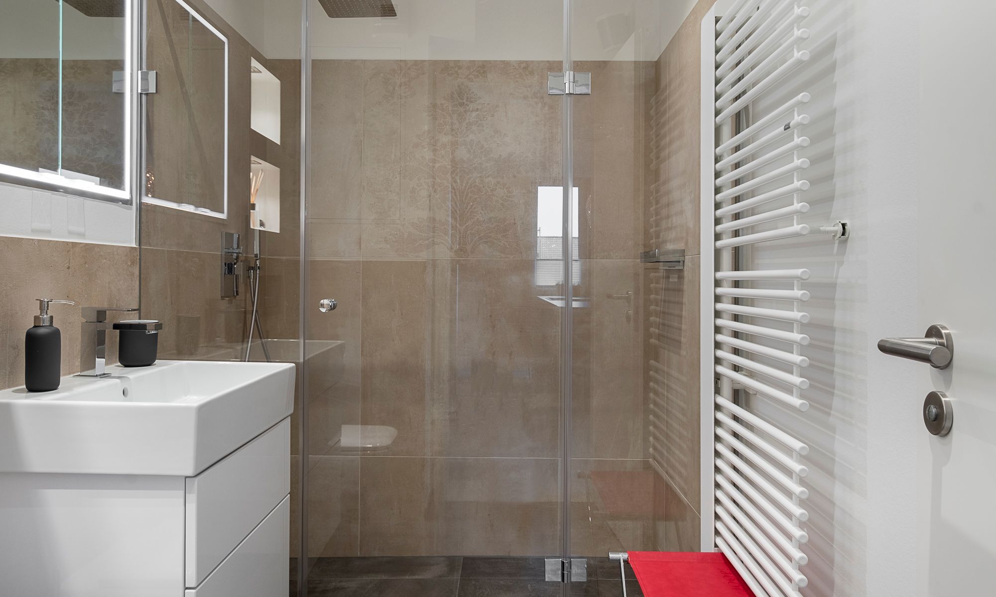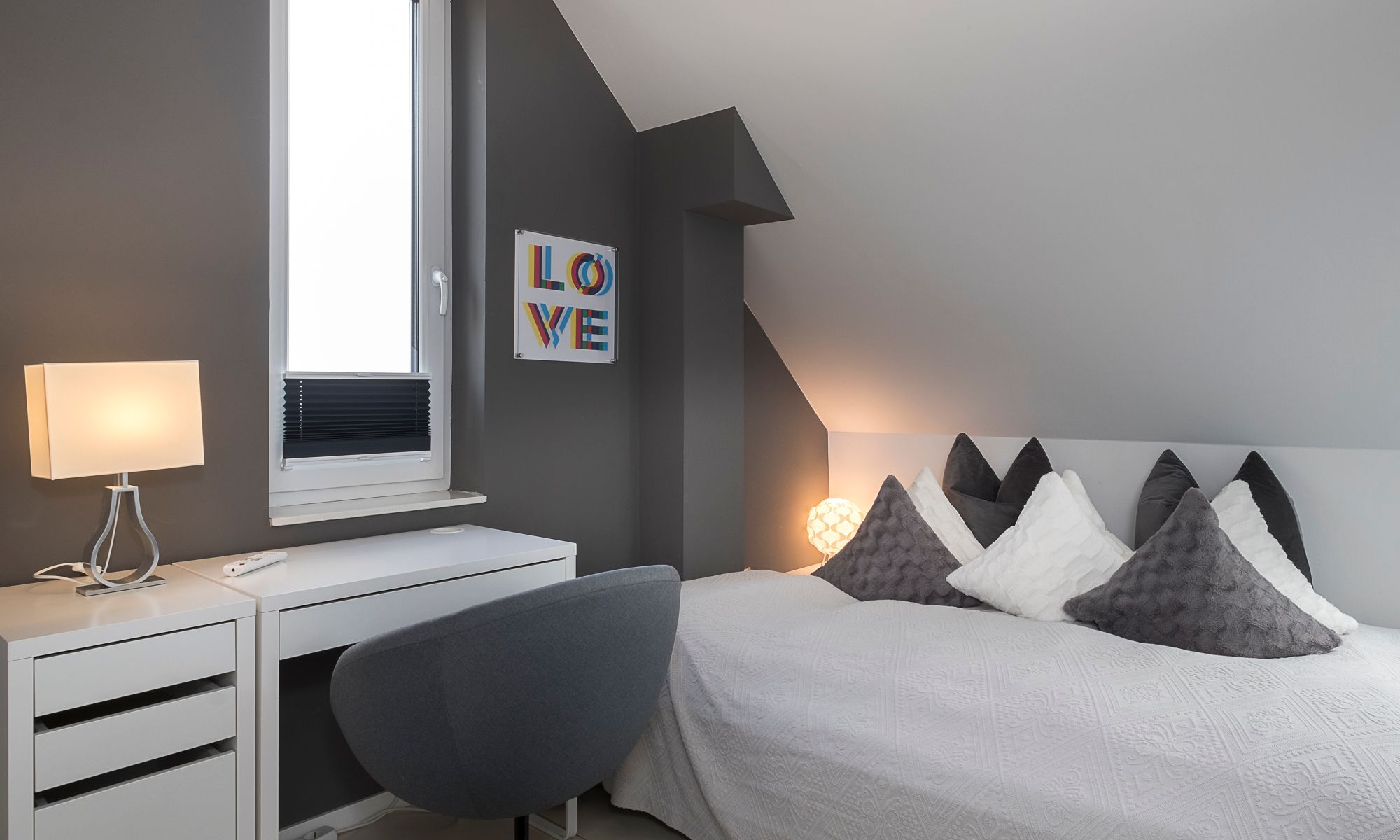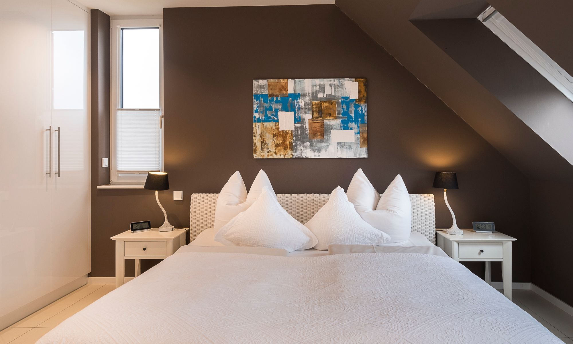 Über eine bequeme Treppe gelangen Sie in das Obergeschoss. Hier finden Sie zwei weitere Schlafzimmer, jedes mit Doppelbett und Flachbildschirm. Die gesamte Wohnung ist mit einer Fußbodenheizung sowie mit einem Sicht- bzw. Lichtschutz an allen Fenstern und zusätzlichen elektrischen Rollläden ausgestattet. Ein zur Wohnung gehörender Tiefgaragenstellplatz sorgt für eine sichere Unterbringung Ihres Autos. Die Wohnung verfügt durch die diversen Einbauschränke über viel Stauraum.