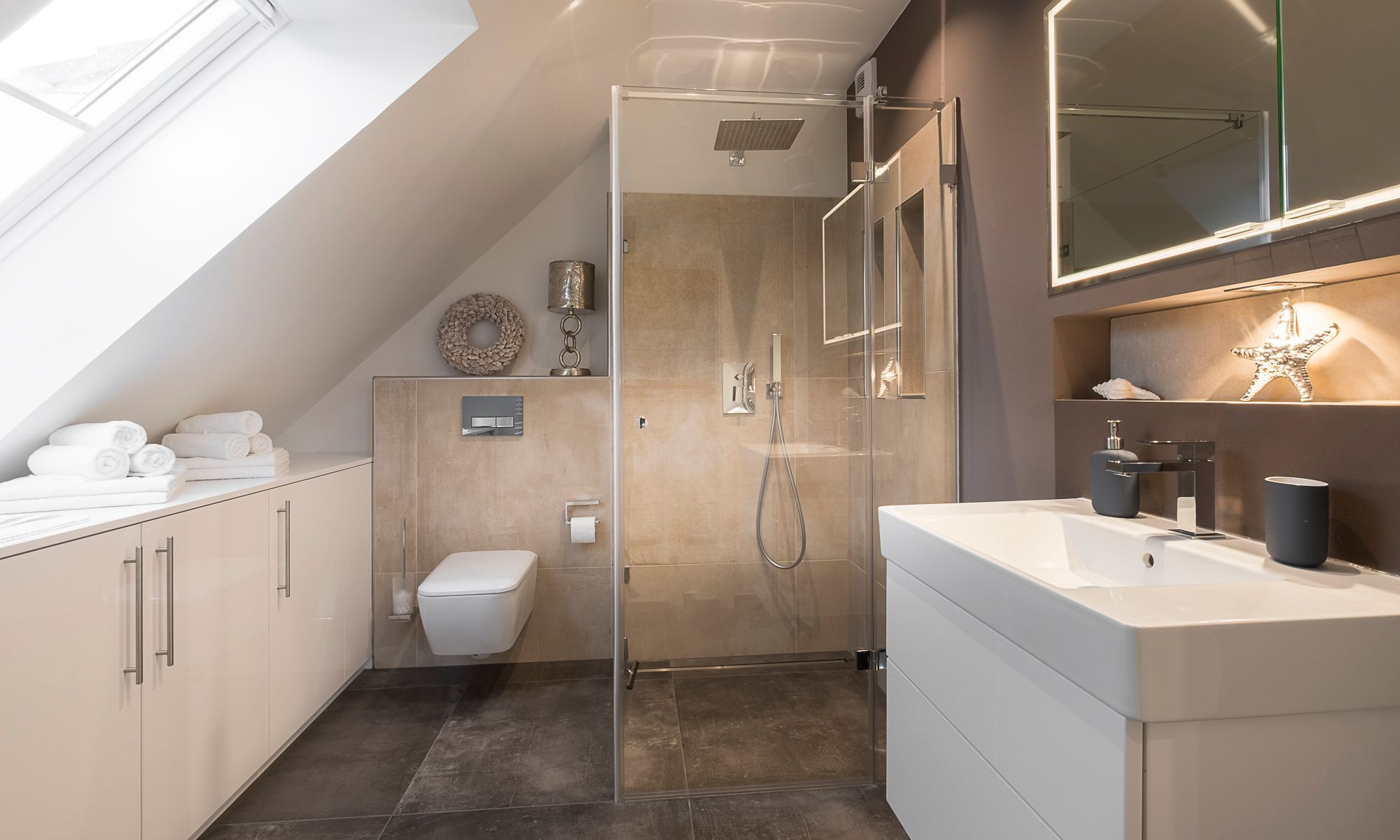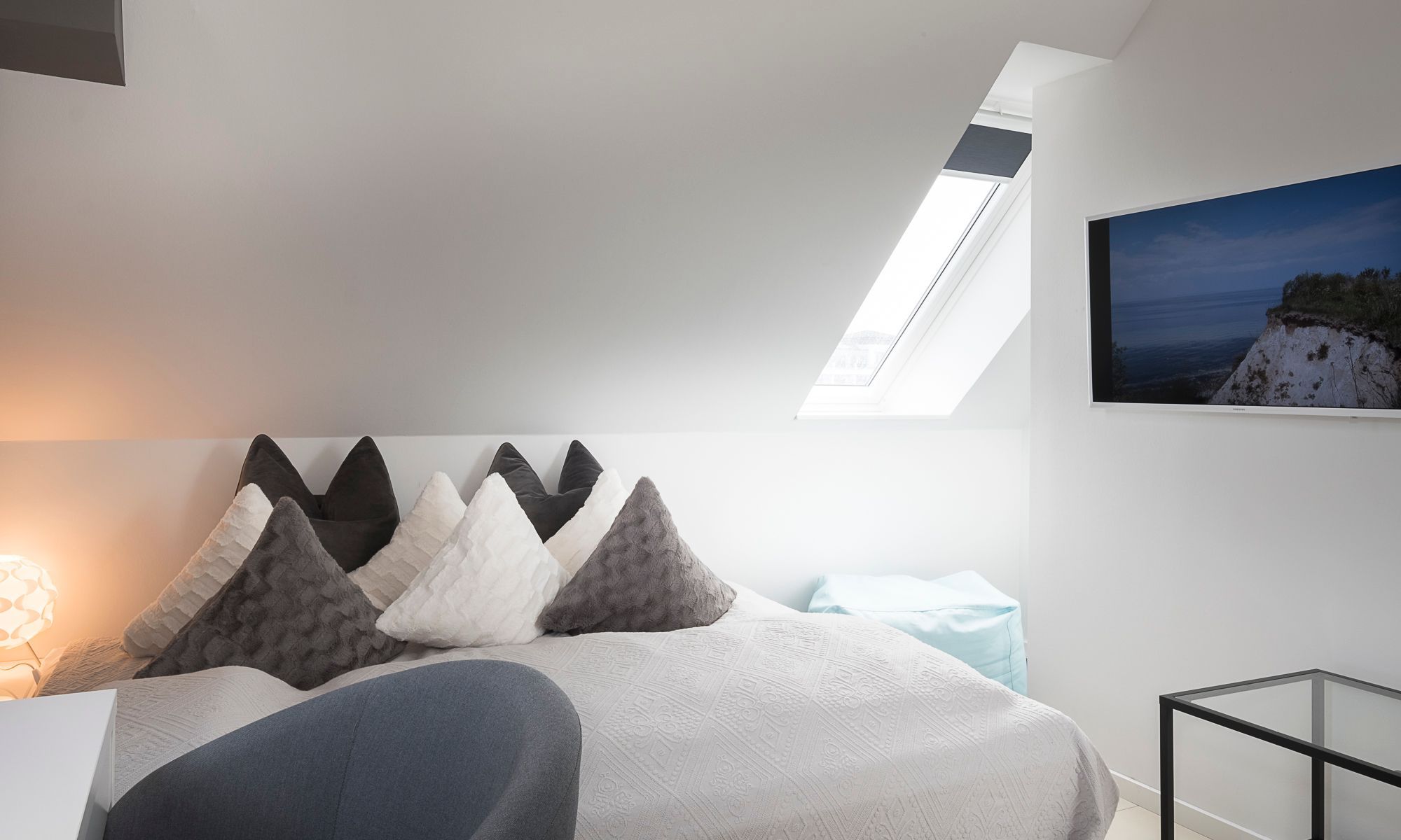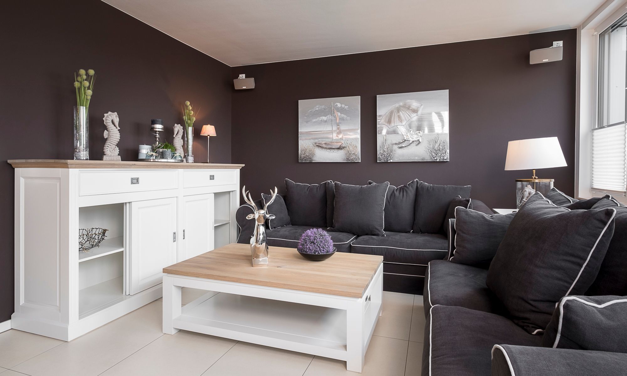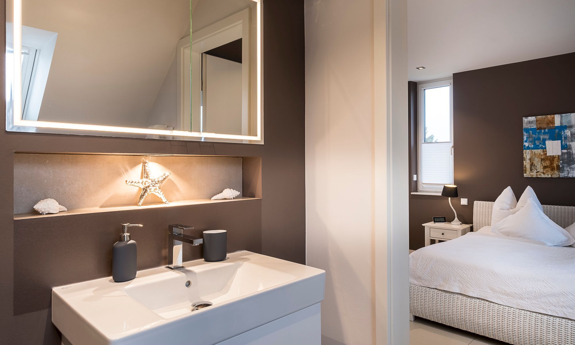 Die Ferienwohnung strahlt mit ihren zum Teil bodentiefen Fenstern eine helle, behagliche Gemütlichkeit aus. Die offene Küche im Wohn-Essbereich ist komplett ausgestattet und lässt keine Wünsche offen. Im Wohnbereich finden Sie alles, was man zur Entspannung benötigt, zum Beispiel einen HD-Flachbildschirm sowie eine Sonos-Anlage und freies WLAN. Die Sonos-Anlage ist über die SONOS App zu steuern. Der Tresen lädt mit seinen Designer-Stühlen zu einem gemütlichen Verweilen ein. Das Sofa sowie die besonderen Stühle, der ausgefallene Tresen und das Sideboard sind von der Firma Richmond Interiors. Das erste Schlafzimmer mit Doppelbett (1,80 x 2,00m) verfügt über ein Bad en Suite mit bodentiefer Dusche und Handtuchheizkörper sowie einen Waschtrockner und einen geräumigen Schrank. Ein weiteres Duschbad mit bodengleicher Dusche steht neben dem Eingangsbereich für die Gäste der anderen beiden Schlafzimmer zur Verfügung.