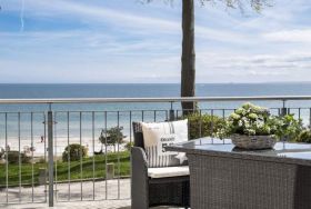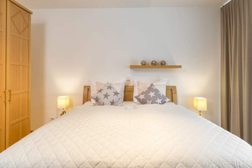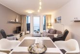 Helle und freundliche 3-Zimmer-Ferienwohnung, ca. 70 m², für bis zu 4 Personen mit 100% Meerblick, zwei Balkonen, Wannenbad, Waschmaschine, Fahrstuhl und Tiefgaragenstellplatz, Einfahrtshöhe 1,90 m.