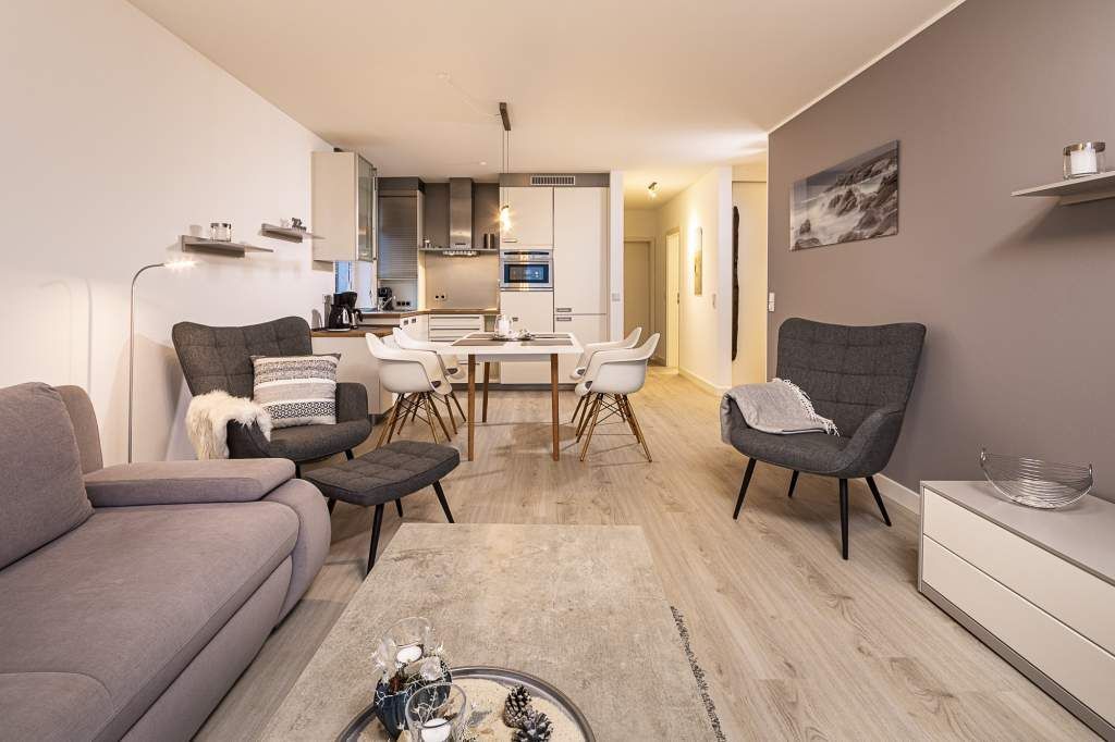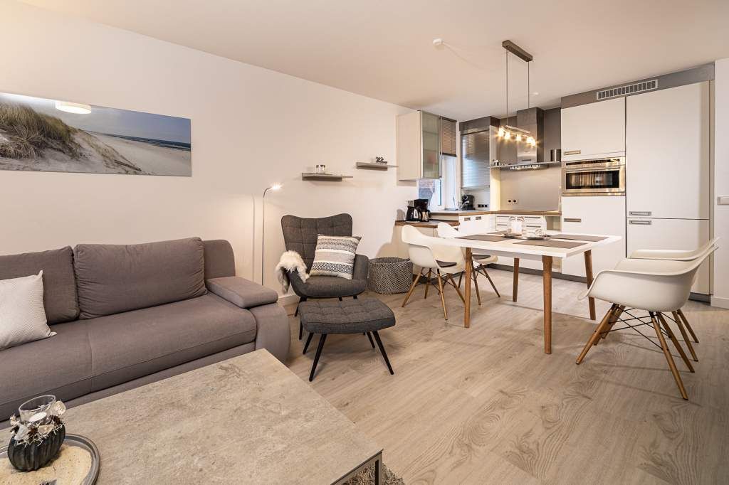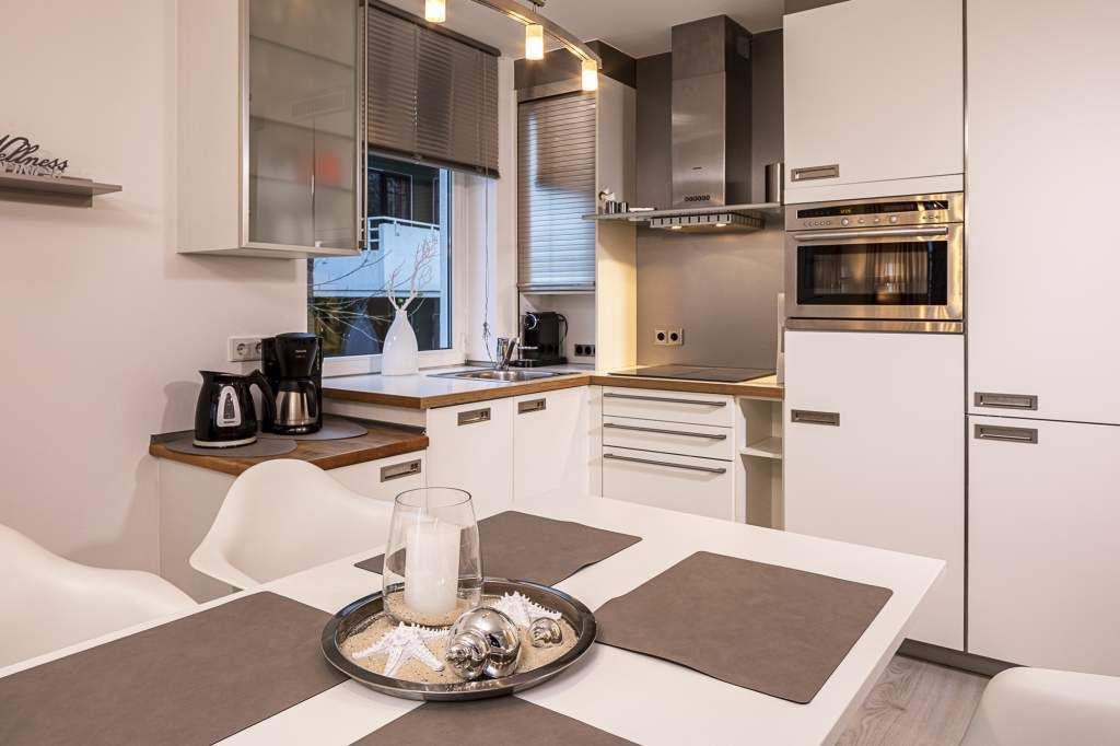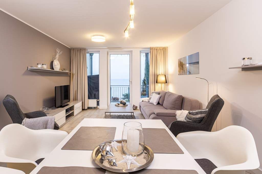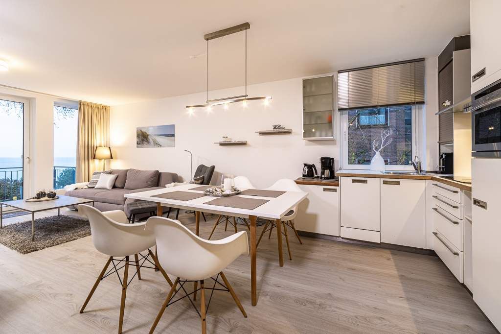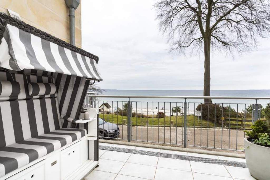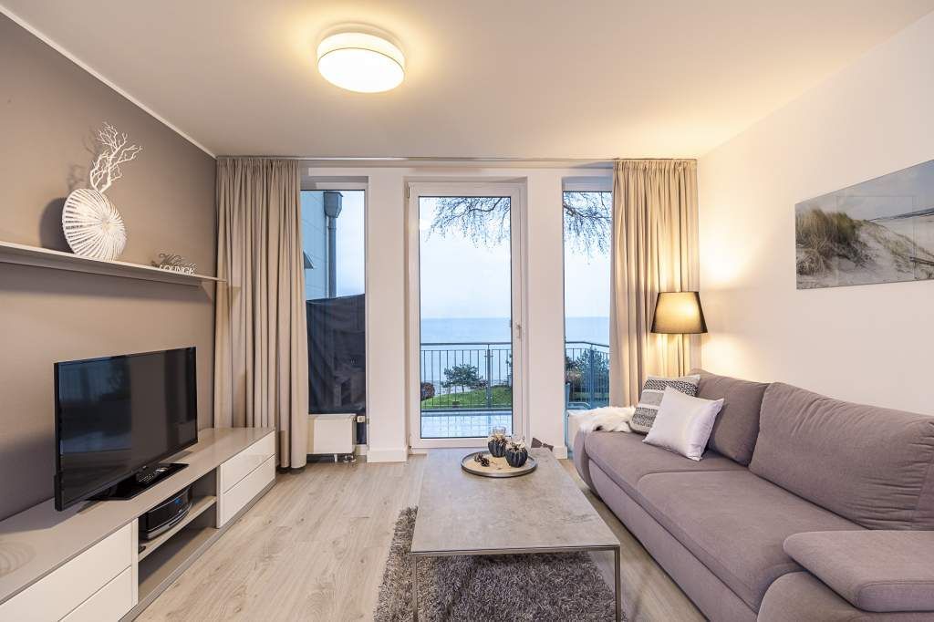 Diese helle 3-Zimmer-Ferienwohnung bietet Ihnen neben dem traumhaften Blick auf die Lübecker Bucht auch den Blick ins Grüne, mit Nachmittagssonne. Der Wohn- und Essbereich ist geschmackvoll und freundlich eingerichtet und verfügt über ein bequemes Sofa, welches sich in wenigen Handgriffen zu einem Schlafsofa umgestalten lässt, und zwei Sessel. Kostenloser WLAN-Zugang, Flachbildfernseher. Vom Wohnzimmer treten Sie hinaus auf den ersten Balkon (Richtung Süd/Osten), hier empfängt Sie ein phantastischer Meerblick, den Sie vom dort befindlichen Strandkorb genießen können. Die offene Küche ist in den Wohn-Essbereich integriert. Das erste Schlafzimmer verfügt über den Zugang zum zweiten Balkon. Das Schlafzimmer ist mit einem Doppelbett (1,60 x 2,00m), einem Kleiderschrank sowie mit einer Anrichte / TV ausgestattet. Auf dem 2. Balkon Richtung Südwest können Sie den Blick ins Grüne und die Mittags- bzw. Nachmittagssonne genießen. Das zweite Schlafzimmer verfügt über ein sehr bequemes Schrankbett (1,40 x2,00m). Hier haben Sie die Möglichkeit, den Raum tagsüber z. B. für Ihre Kinder als Spielzimmer oder als Lesezimmer zu nutzen. Selbstverständlich steht Ihnen auch hier ein TV-Gerät zur Verfügung. Das in heller Optik gehaltene Badezimmer ist mit einer Wanne mit Duschvorrichtung ausgestattet.