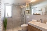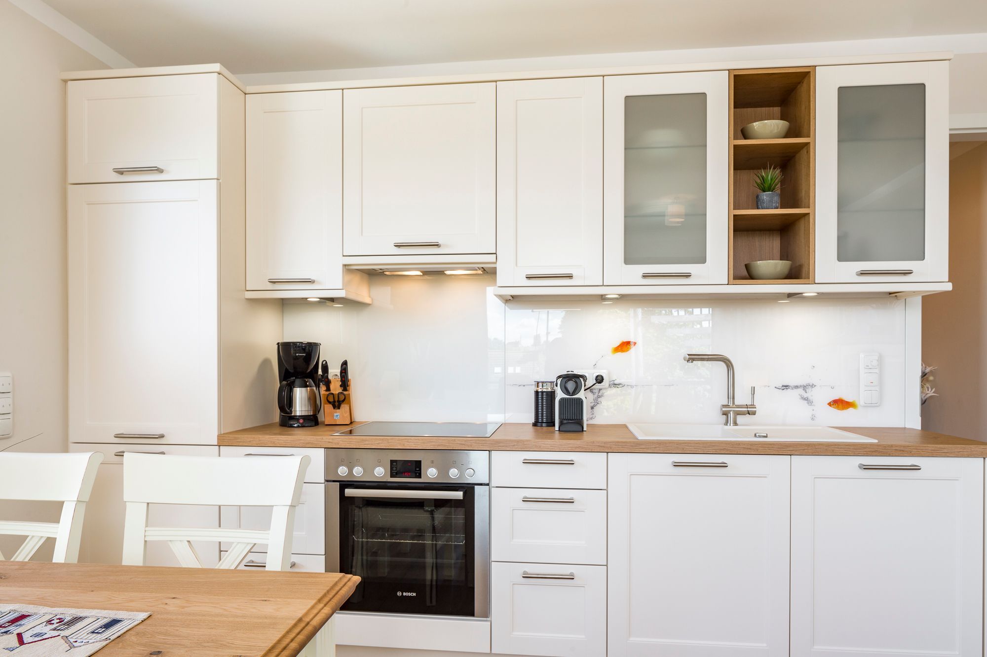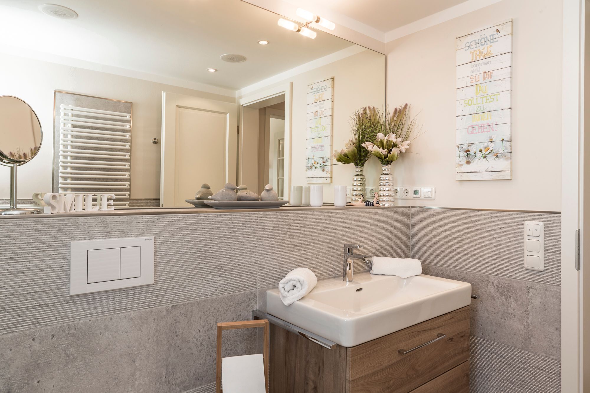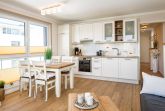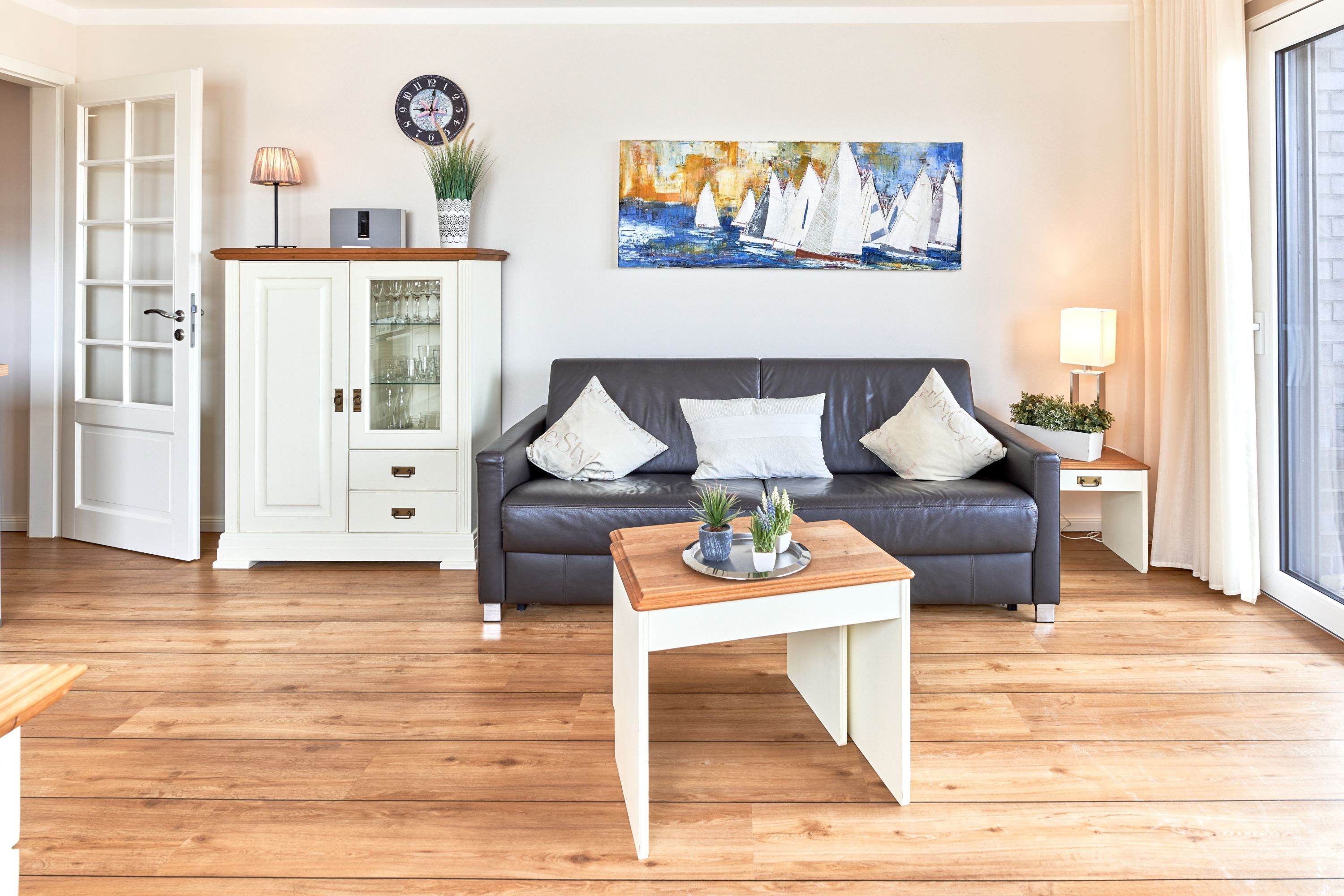 Das Badezimmer hat Tageslicht, Handtuchheizkörper und Fußbodenheizung. Die bodengleiche Dusche verfügt über Duschkopf und Handbrause. Integriertes Bad Radio. Das wohlige Wohnzimmer ist herrlich lichtdurchflutet. Rechter Hand befindet sich die Pantryküche mit Markengeräten (Ceranfeld, Backofen, Geschirrspüler). Der Wohnbereich ist mit einer Ledercouch ausgestattet, die in einfachen Handgriffen zu einem Schlafbereich (160x200m, Lattenrost und Matratze) umfunktioniert werden kann. Anrichte mit Technikhighlights: Sony-DH-Curved-TV, Bose-Sound-System. Vom Essbereich aus haben Sie einen schönen Meerblick. Hier können Sie lange verweilen. Auch für fröhliche Spielabende bietet Ihnen dieser Bereich ausreichend Platz und Bequemlichkeit. Haben Sie an Ihr Lieblingsbuch gedacht ? Ein Relaxsessel freut sich auf Sie.