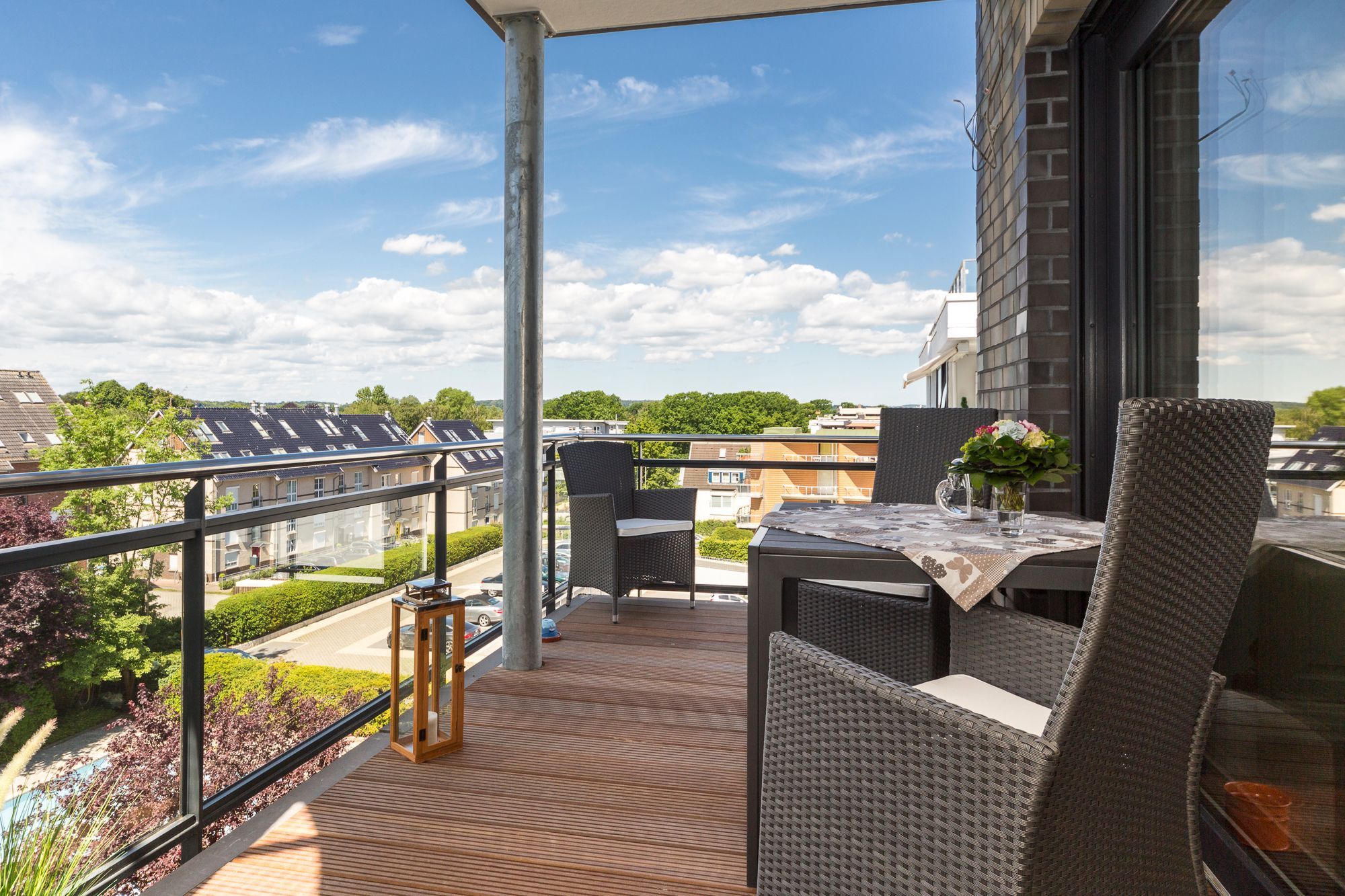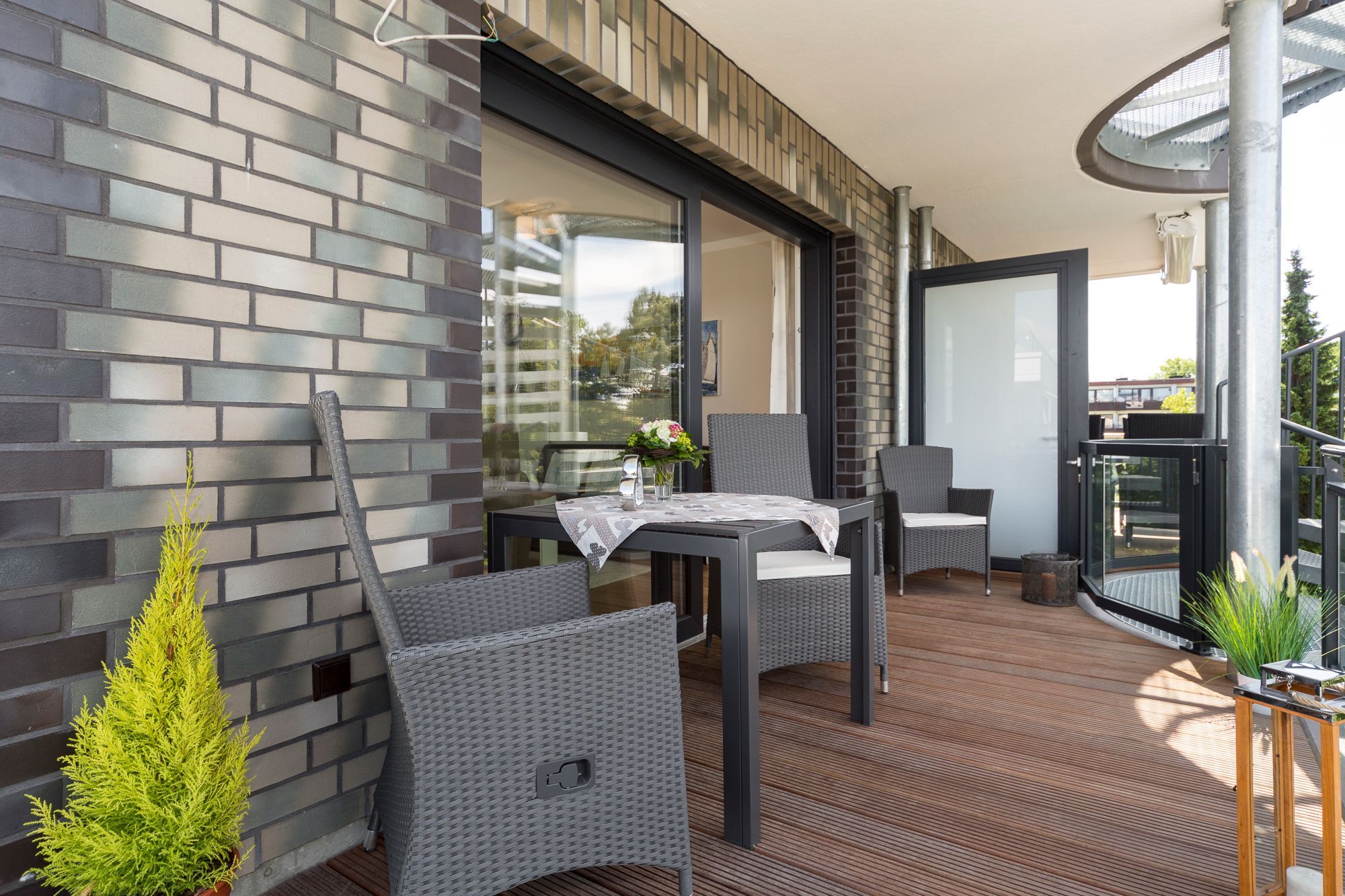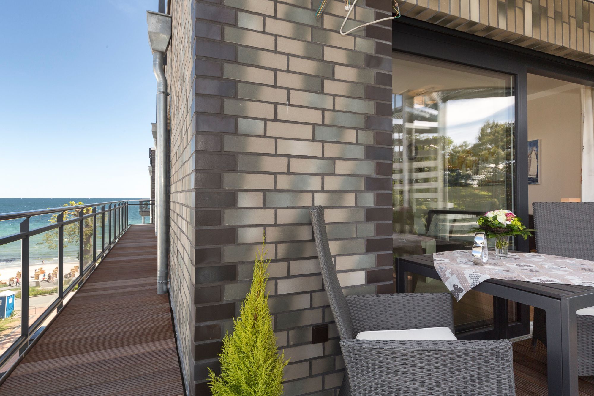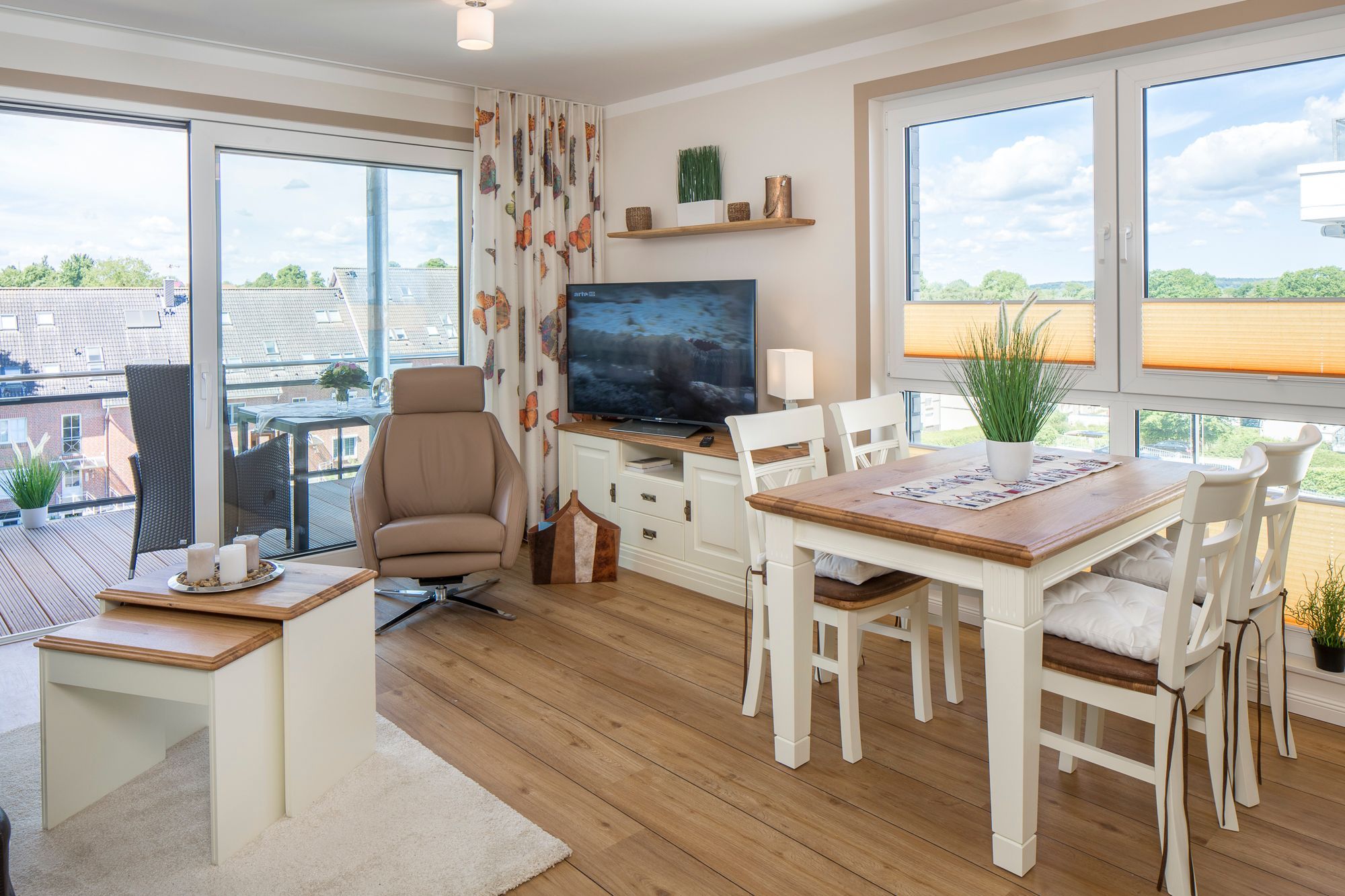 2-Zimmer-Ferienwohnung, ca. 55 m², mit umlaufendem Balkon und herrlichem Teilmeerblick, Duschbad, Kfz-Außenstellplatz, für 2 Personen. Die Wohnung liegt im 3. OG nach Westen.