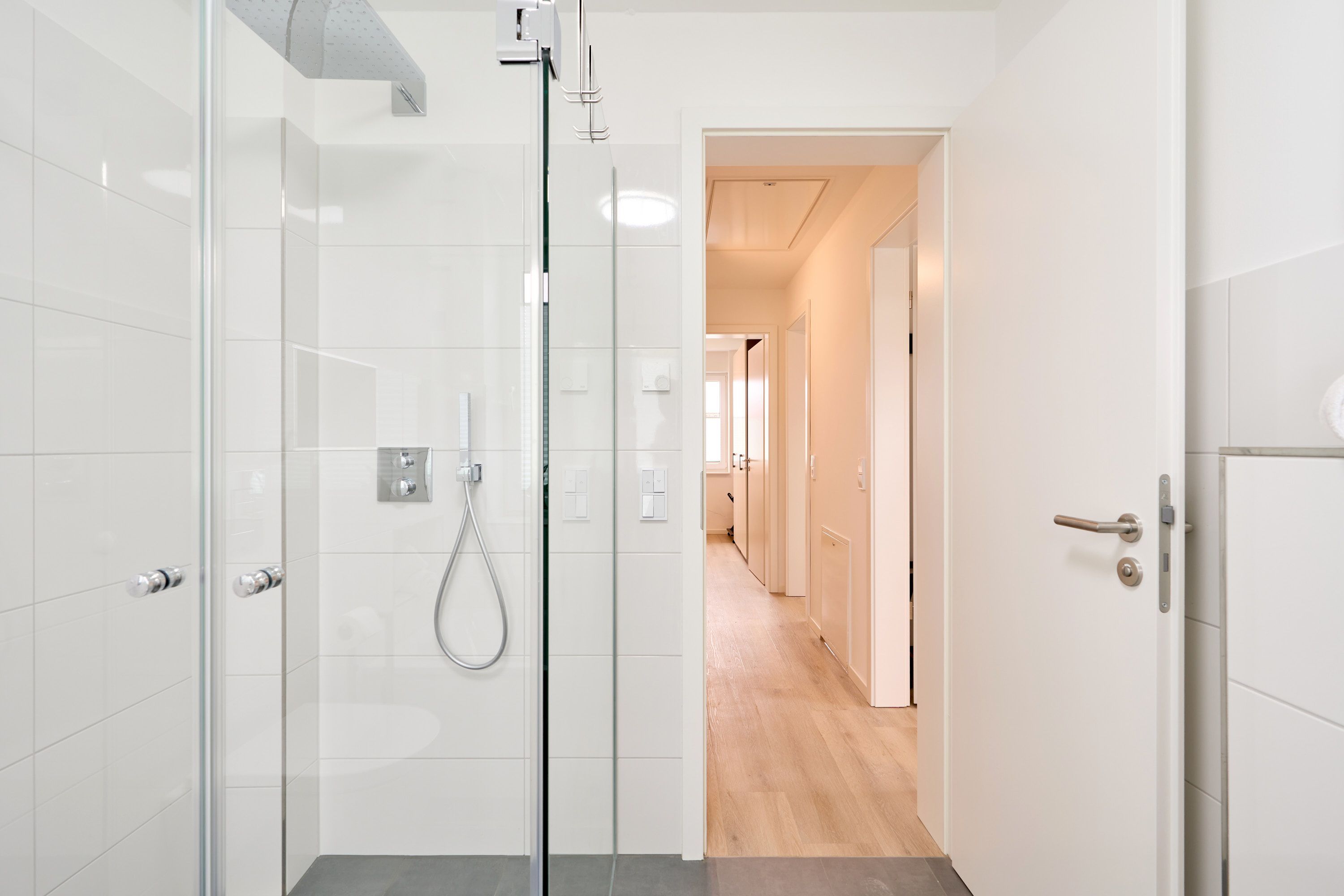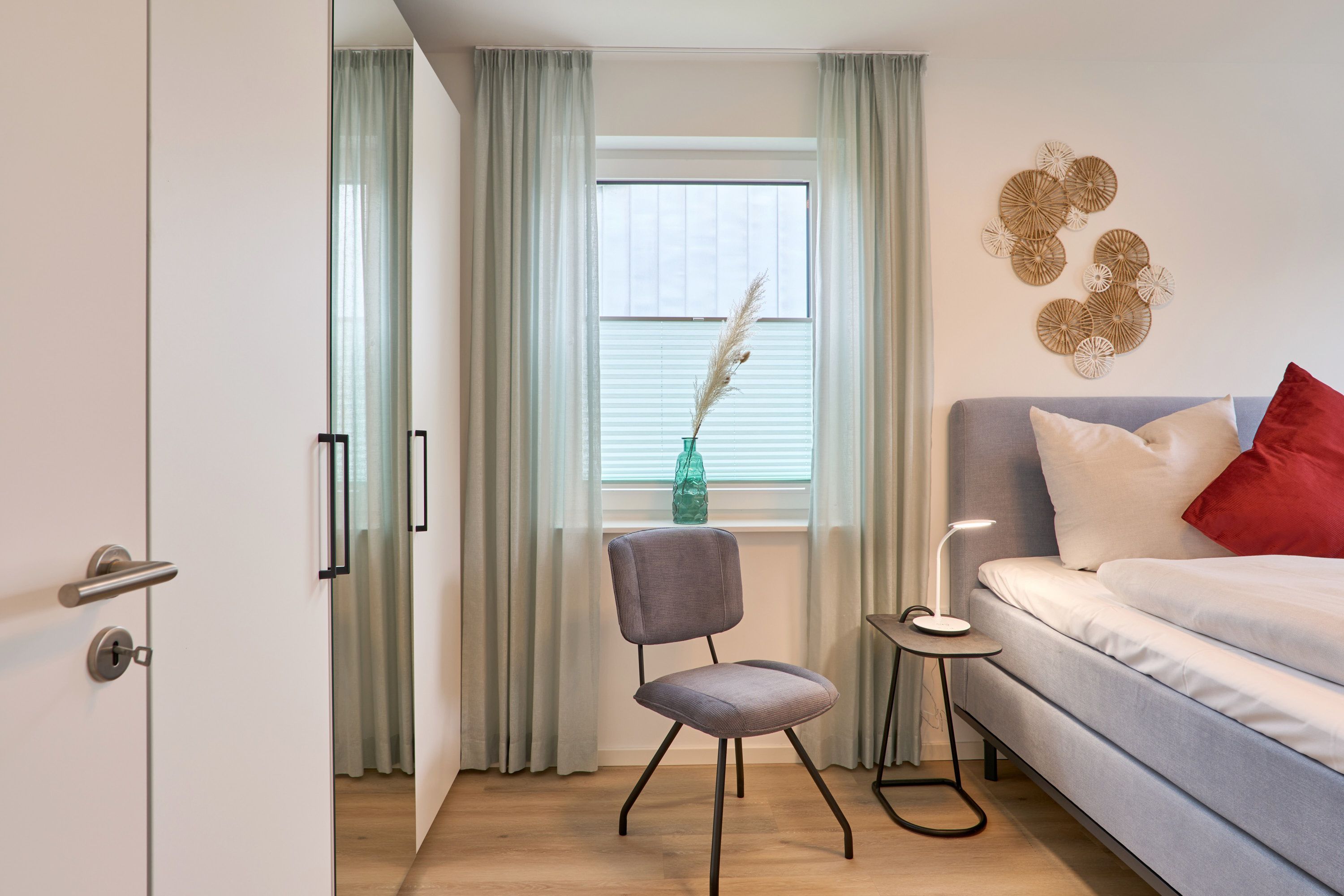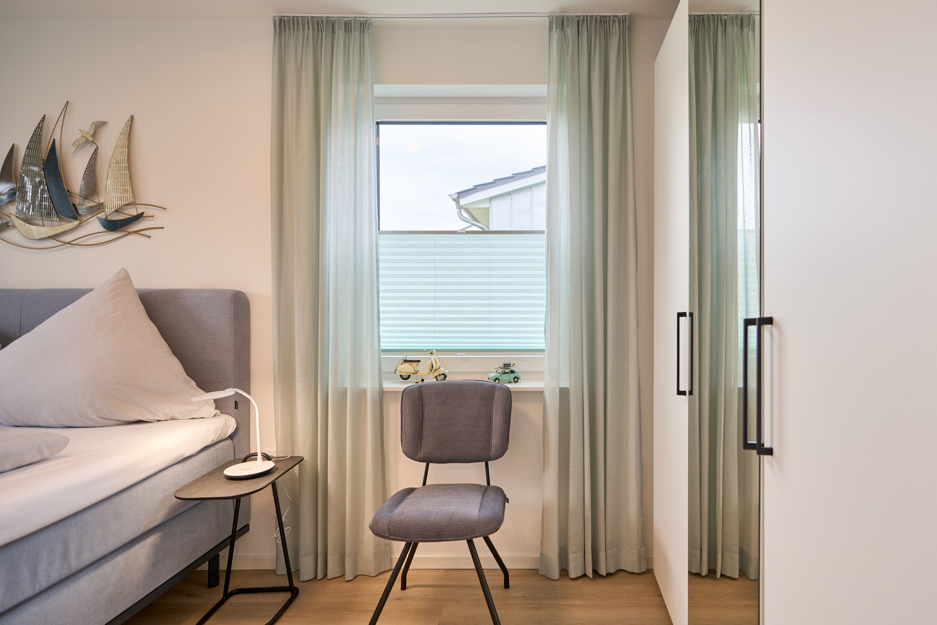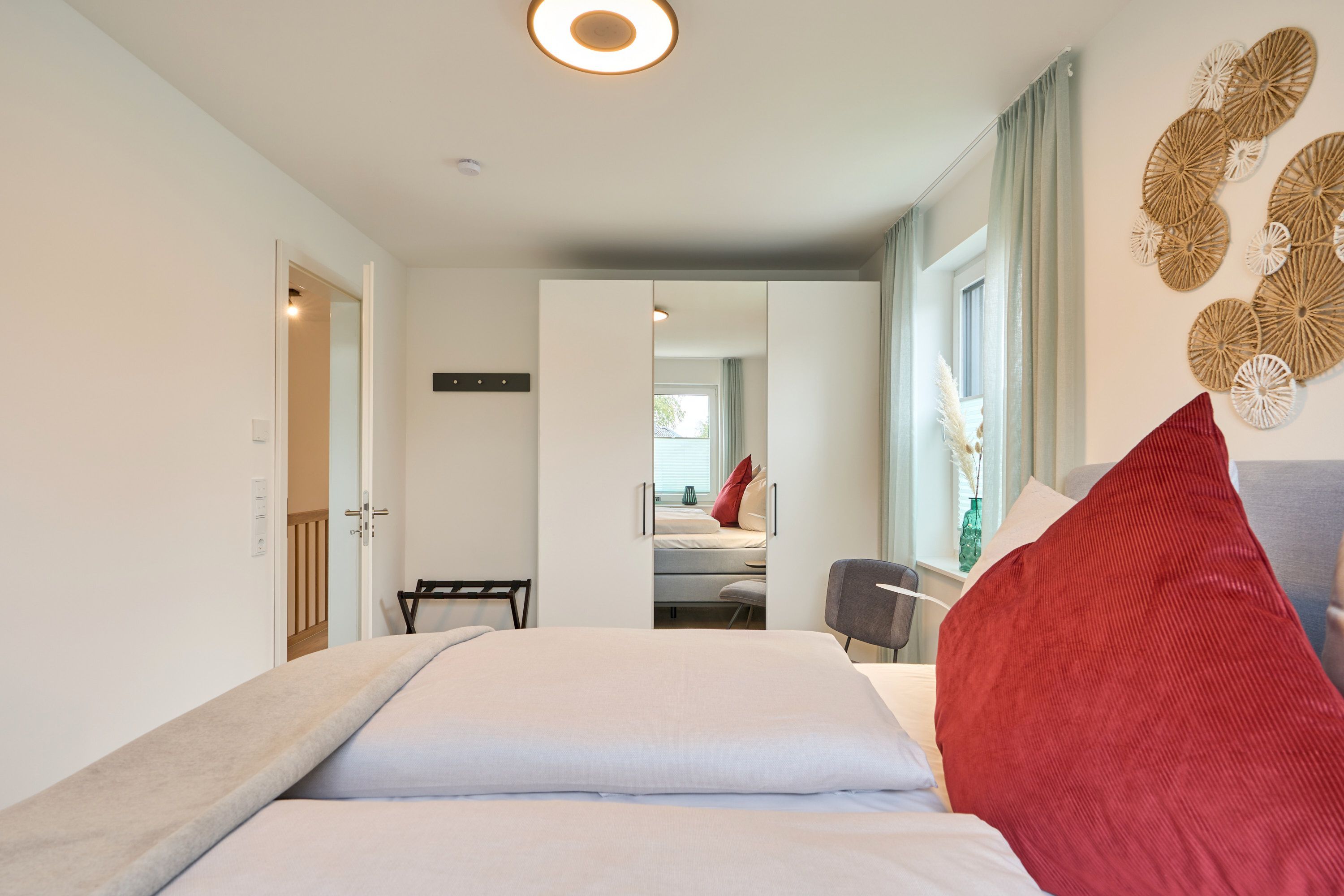 Über eine großzügige Treppe gelangen Sie in das 1. Obergeschoss. Hier befinden sich drei Schlafzimmer sowie das zweite Tageslichtbad, ausgestattet mit einer Badewanne sowie einer bodengleichen Dusche. Zwei Schlafzimmer sind mit je einem Kleiderschrank, zwei Nachttischen sowie mit einem Boxspringbett (1,80x2,00m) ausgestattet. Das dritte Schlafzimmer ist mit einem Kombibett eingerichtet, hier lässt sich aus dem Bettkasten eine weitere Schlafgelegenheit ausziehen. Alle Räume lassen sich mit elektrischen Rollläden verdunkeln.