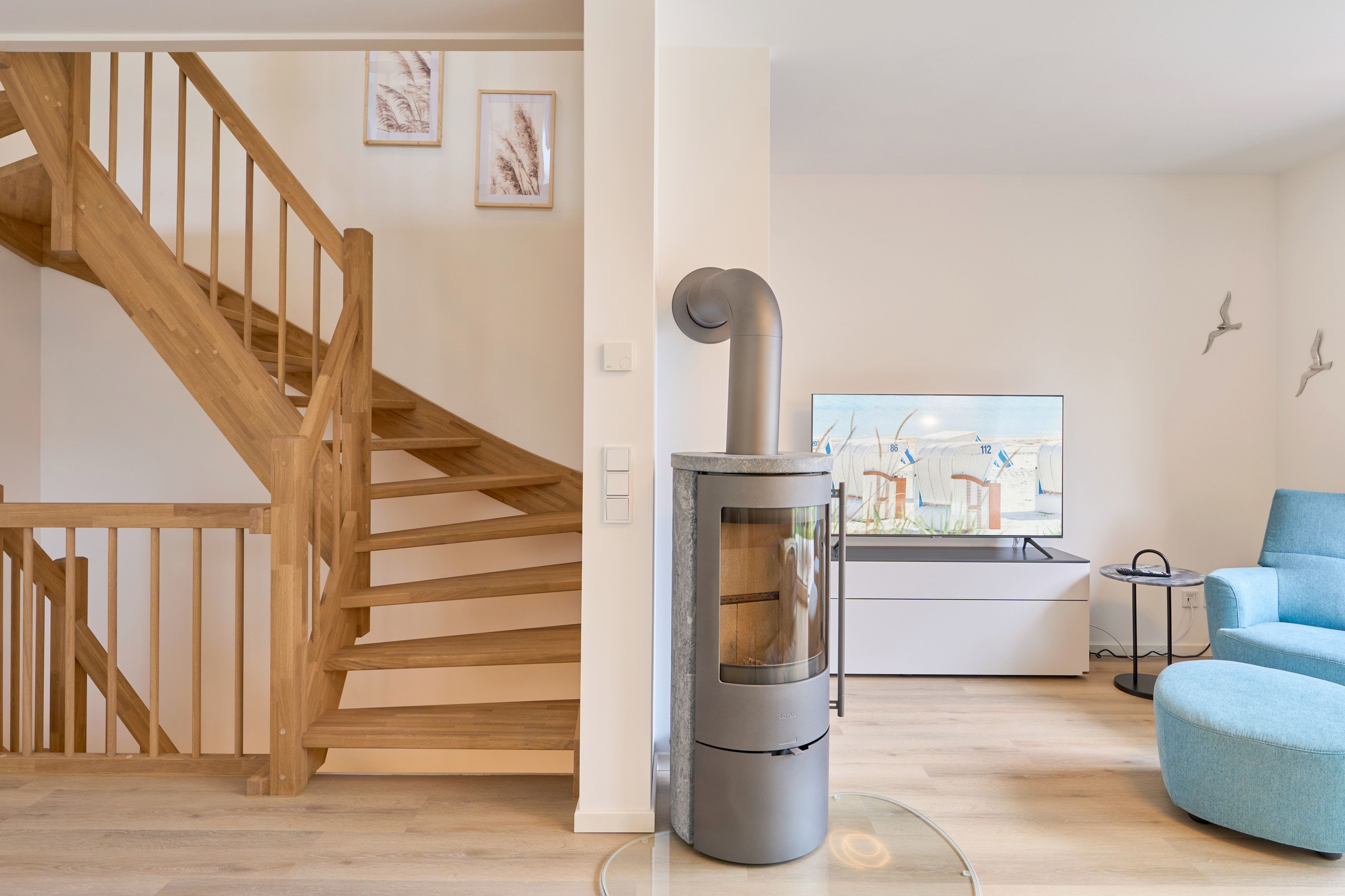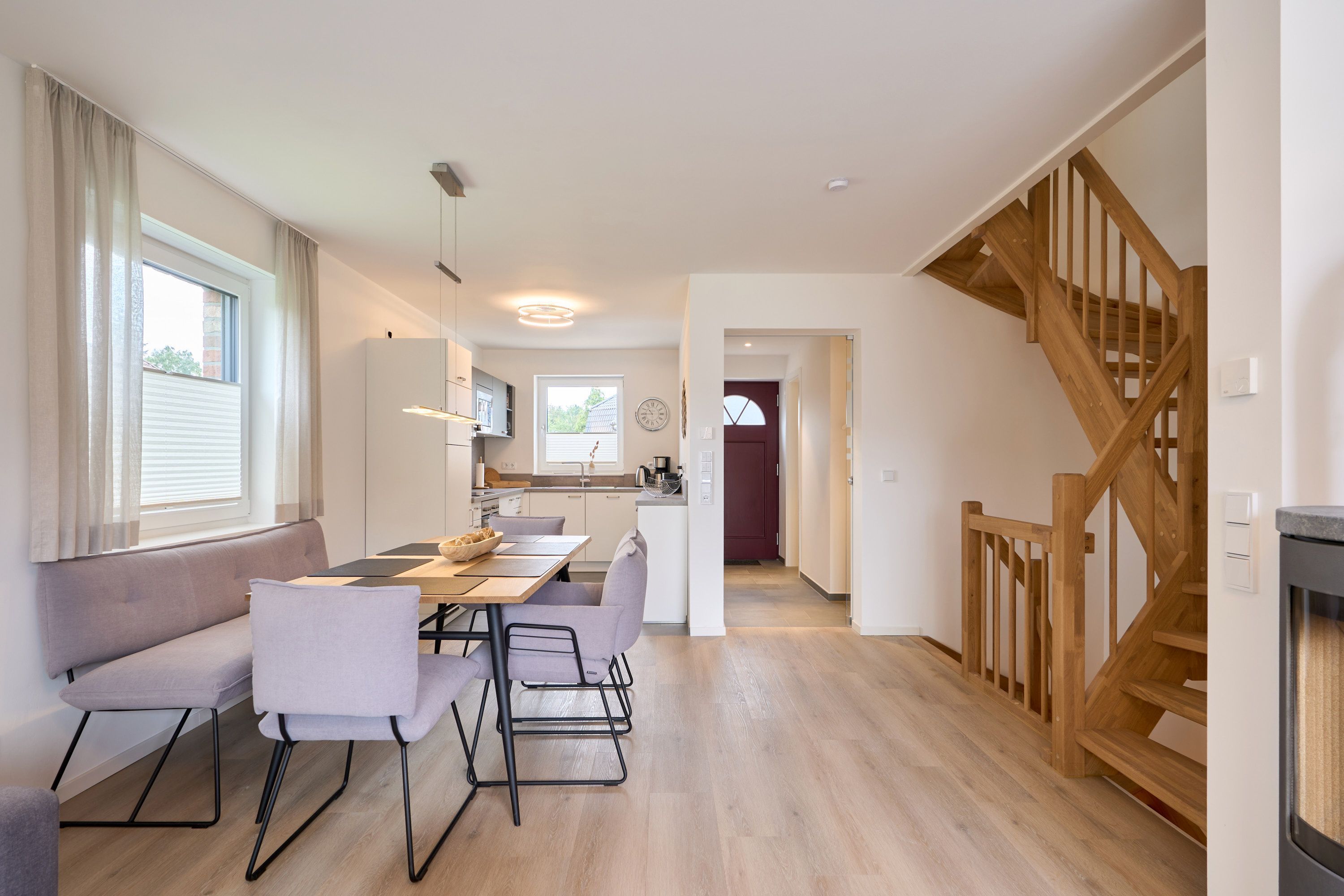 Dieses sehr ansprechende Ferienhaus hat eine Wohnfläche von ca. 100 m², diese ist auf zwei Etagen aufgeteilt. Der Eingangsbereich ist großzügig mit einer Garderobe und einem Tageslichtbad ausgestattet und trennt den Wohn-Essbereich mit einer Glastür. Die Küchenzeile ist großzügig in U-Form angelegt. Alles da … Geschirrspüler, Herd, Kochfeld, Kaffeemaschine, Toaster, Wasserkocher, Waschmaschine und vieles mehr. Der Essbereich bietet Platz für 6 Personen. Im Anschluss das gemütliche Wohnzimmer, mit Sofa, Tisch, Relaxsessel und einem 55-Smart-TV sowie einem Kaminofen für die kalte Jahreszeit. Vom Wohnzimmer haben Sie Zugang zur Südterrasse.