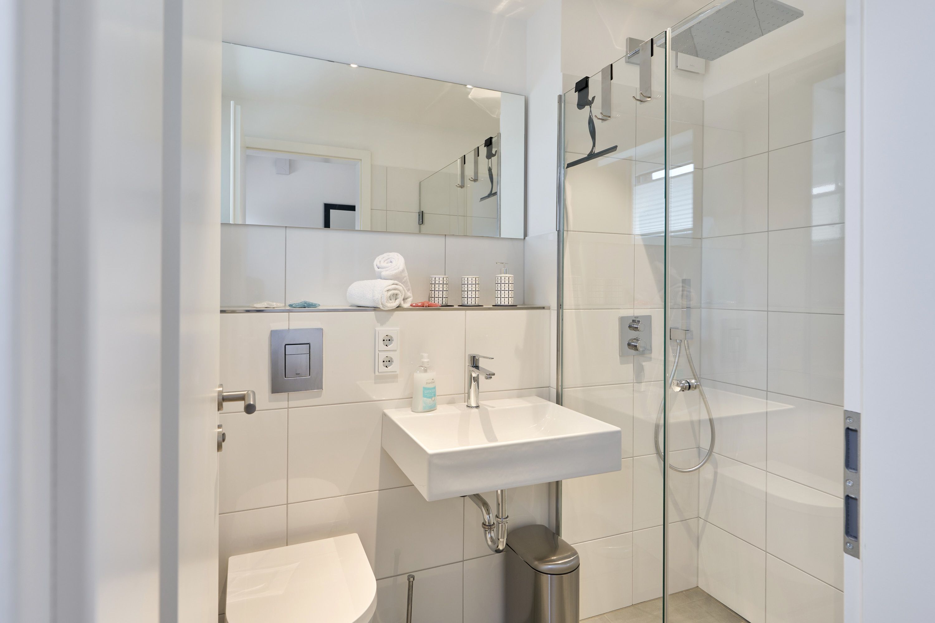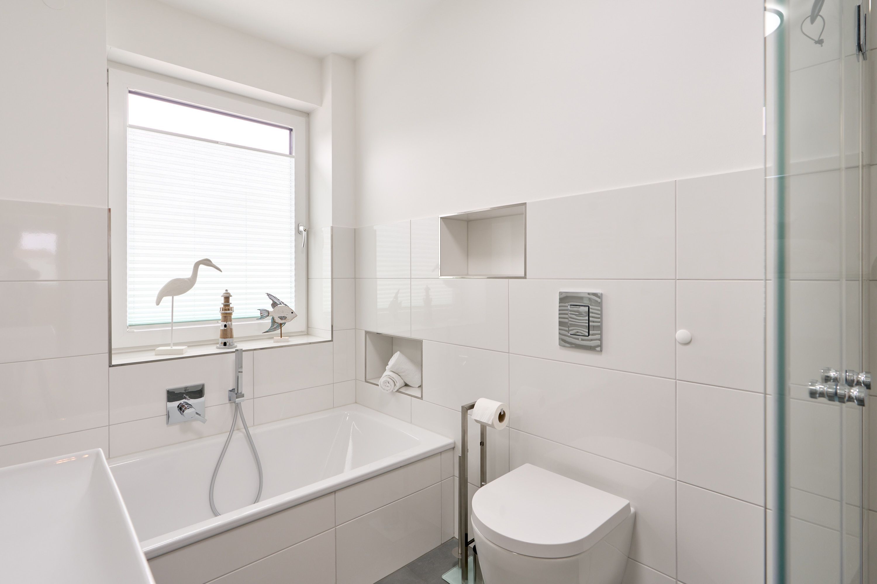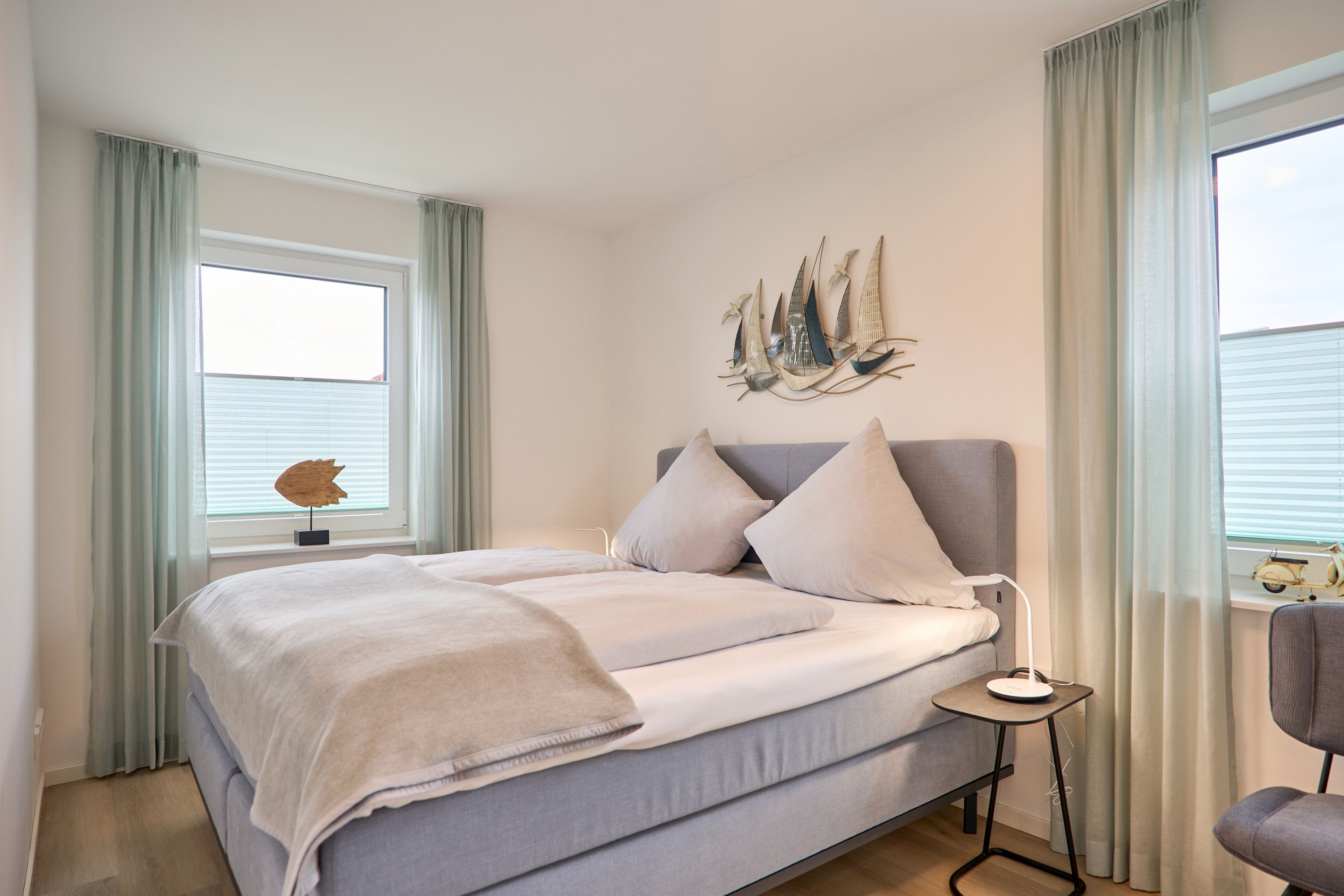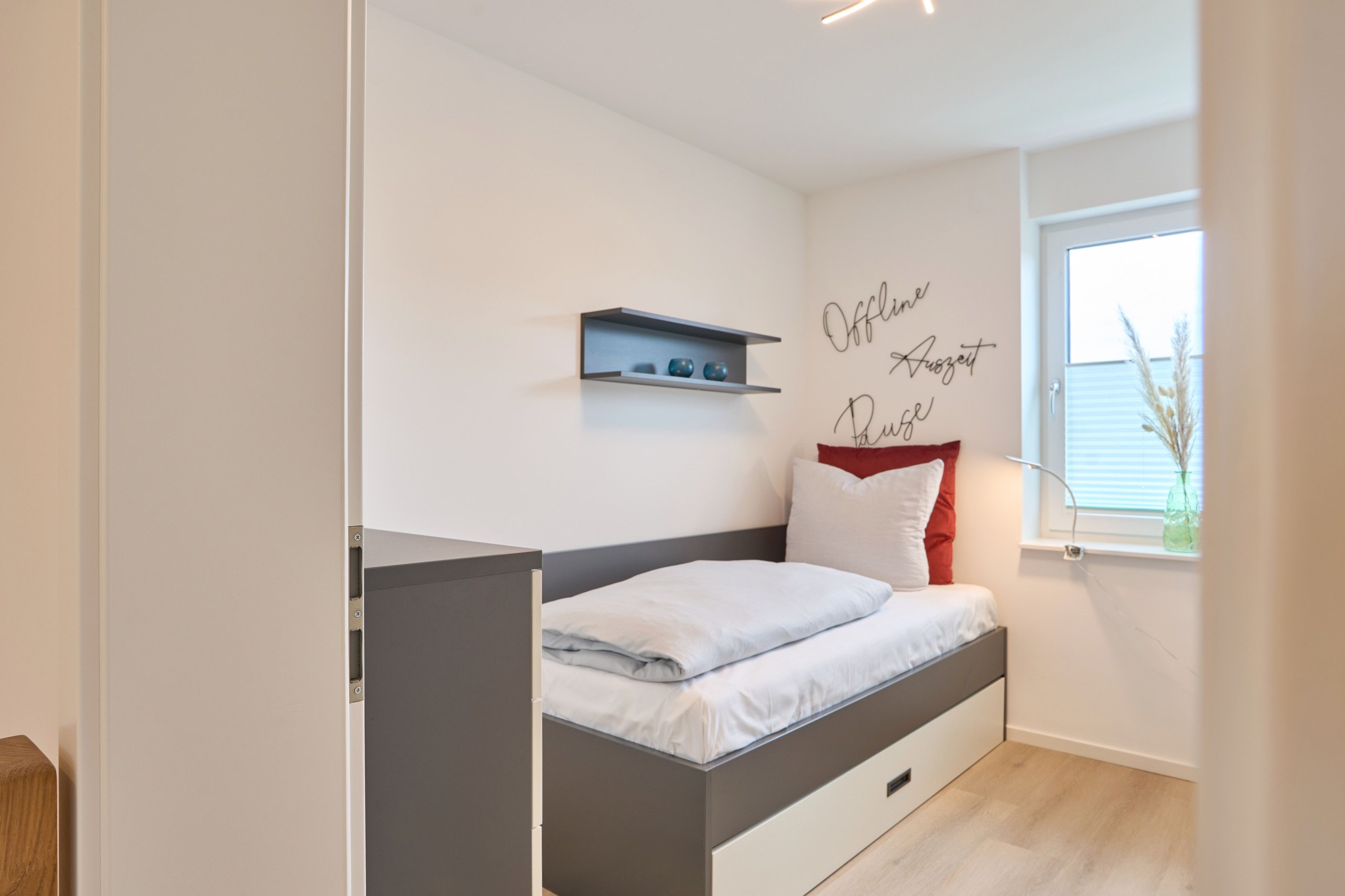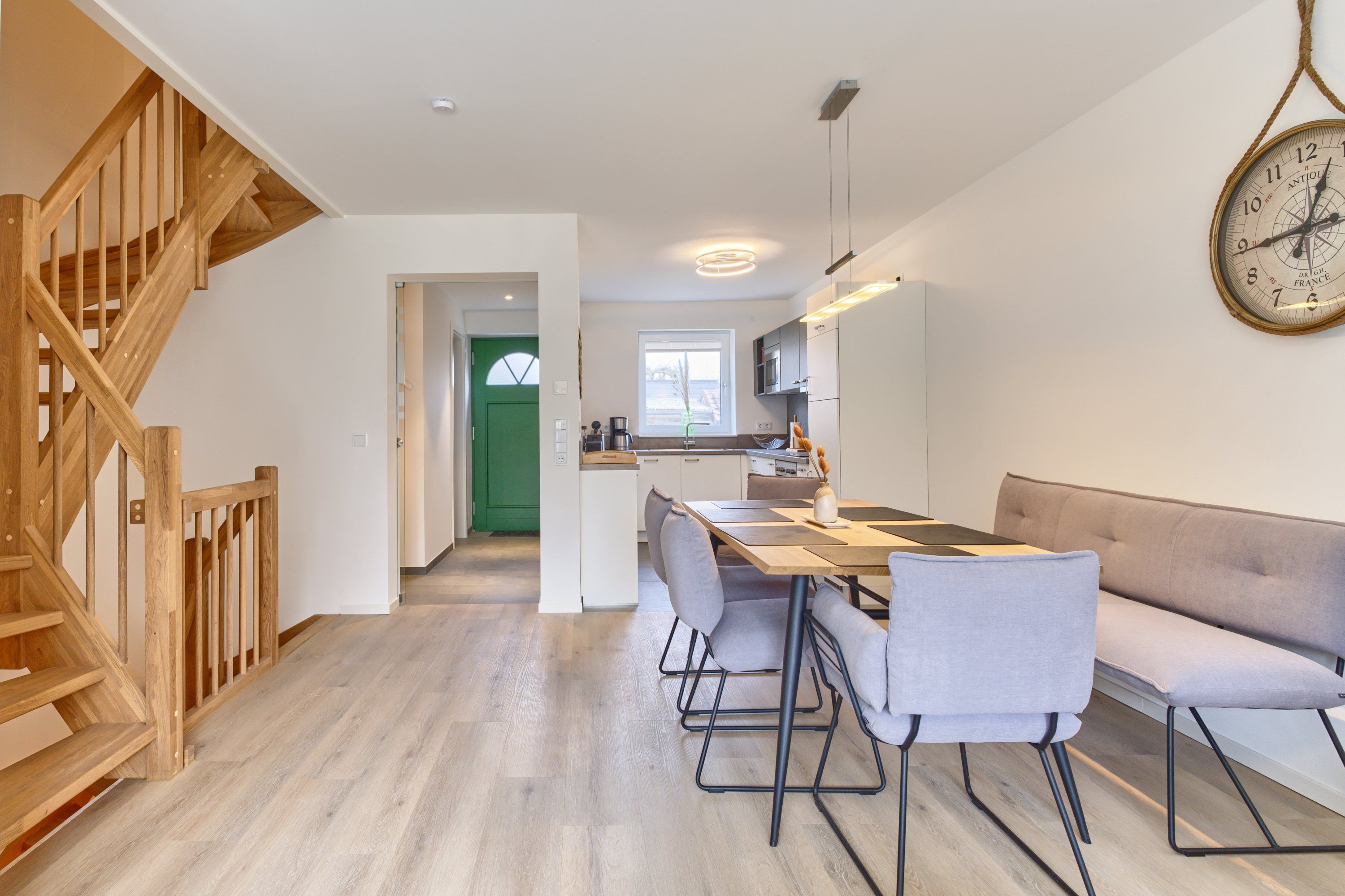 Die Wohnfläche des Ferienhauses ist auf zwei Etagen aufgeteilt. Im Erdgeschoss finden Sie das gemütliche Wohnzimmer mit 55?-Smart-TV, Sofa und Relaxsessel und einem Kamin für die kalte Jahreszeit. Die voll ausgestattete Einbauküche ebenso wie ein Gästebad mit Dusche sind auch Teil des Erdgeschosses. Vom Wohnzimmer aus haben Sie Zugang zur Terrasse mit Gartenmöbeln und Sonnenschirm. Im Obergeschoss befinden sich die Schlafzimmer und ein weiteres Tageslicht-Badezimmer, mit bodengleicher Dusche und einer Badewanne, die zum Entspannen einlädt. Zwei Schlafzimmer sind mit Boxspringbetten (1,80x2,00m) ausgestattet, im dritten Schlafzimmer steht ein Kombibett für Sie bereit, hier lässt sich aus dem Bettkasten eine weitere Schlafgelegenheit ausziehen. Das Kinderschlafzimmer sowie ein großes Schlafzimmer verfügen auch über einen TV. Alle Räume lassen sich mit elektrischen Rollläden verdunkeln.