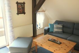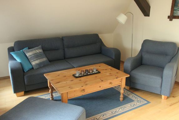 Treten Sie ein in ein gemütliches Ambiente, das durch das lichtdurchflutete Wohnzimmer geprägt ist. Hier erwartet Sie eine einladende Eckcouch, die bei Bedarf in ein zusätzliches Bett für eine Person verwandelt werden kann. Eine Aufbettung ist gegen einen kleinen Aufpreis möglich. Verbringen Sie gesellige Abende vor dem Flachbild-TV oder lassen Sie den Tag bei einem Film auf dem DVD-Player ausklingen. Das Schlafzimmer, ausgestattet mit einem komfortablen Doppelbett, verspricht erholsame Nächte und süße Träume.