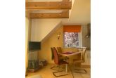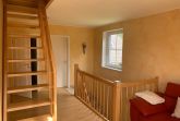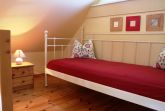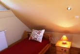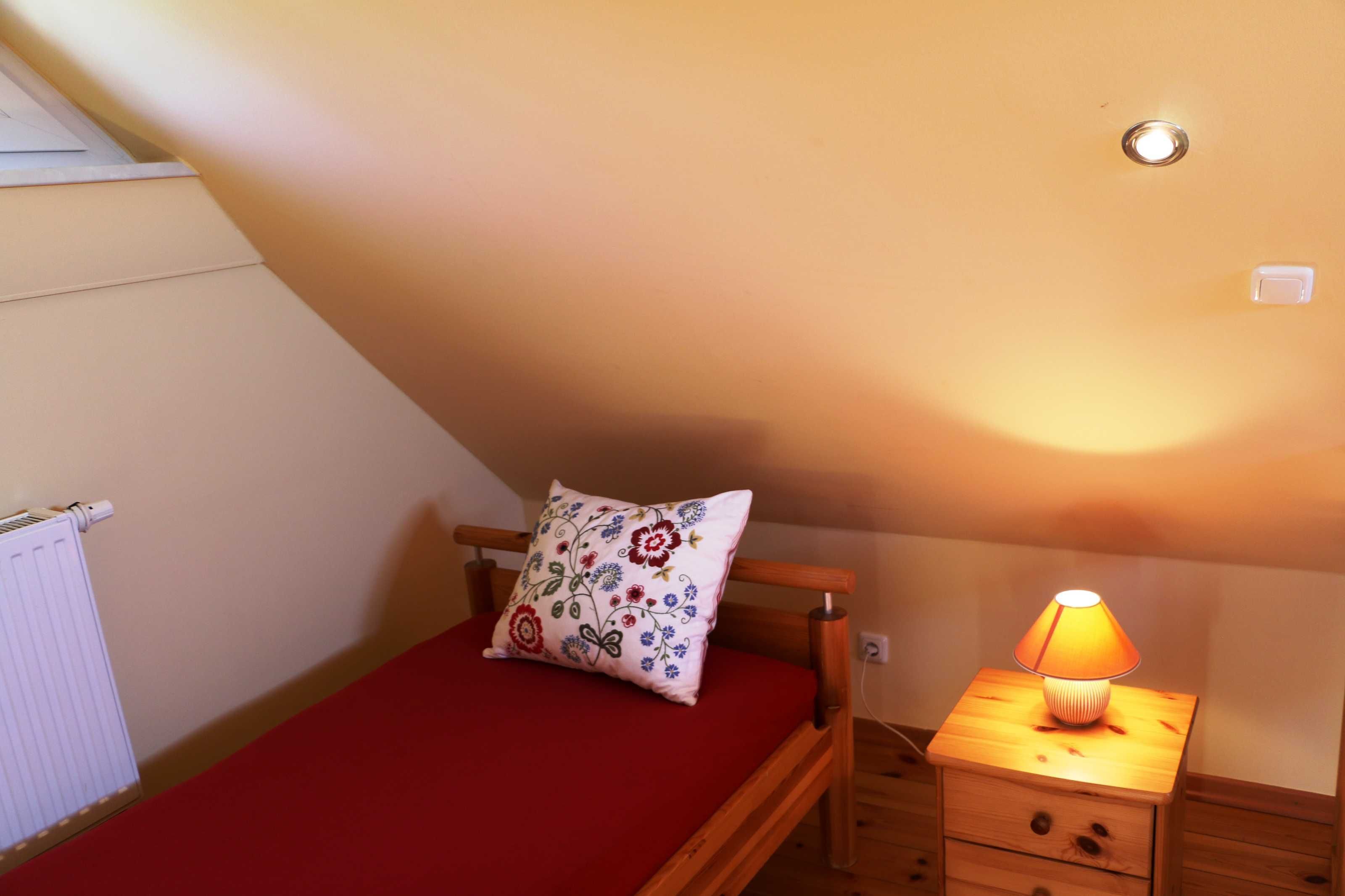 Es gibt ein Wohnzimmer mit offener Küche, ein Schlafzimmer mit Doppelbett, ein Schlafzimmer mit zwei Einzelbetten und ein Bad mit Dusche und WC. Die Küche ist mit einer Spülmaschine, Mikrowelle, Kühlschrank und Gefrierfach, Kaffeemaschine, Toaster und Wasserkocher ausgestattet. Das zweite Schlafzimmer ist für Kinder unter 3 Jahren und für ältere, gehbehinderte Personen aufgrund der steilen Treppe nicht geeignet.