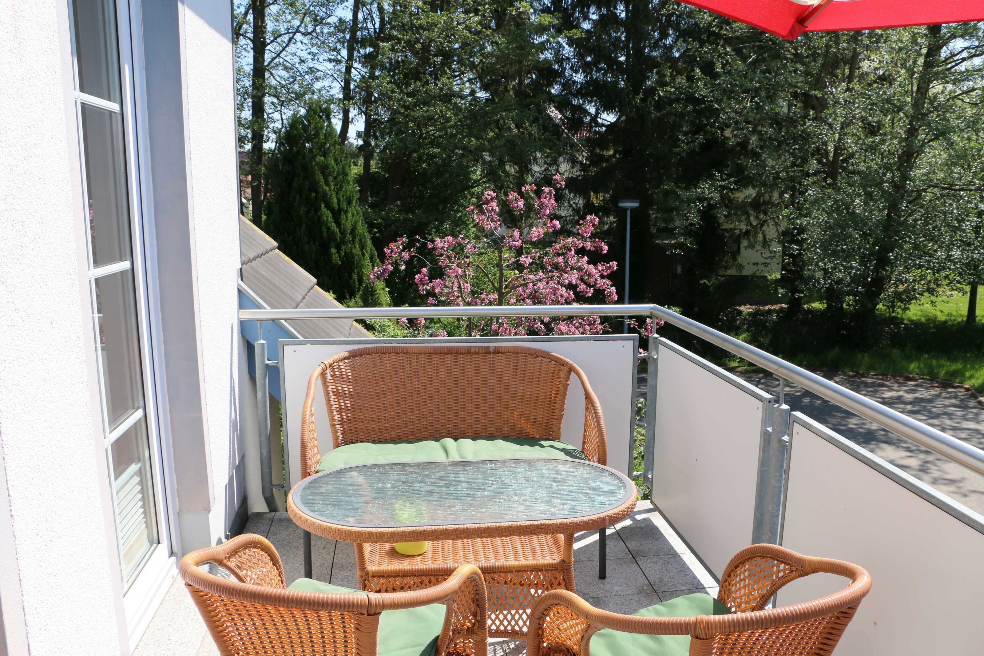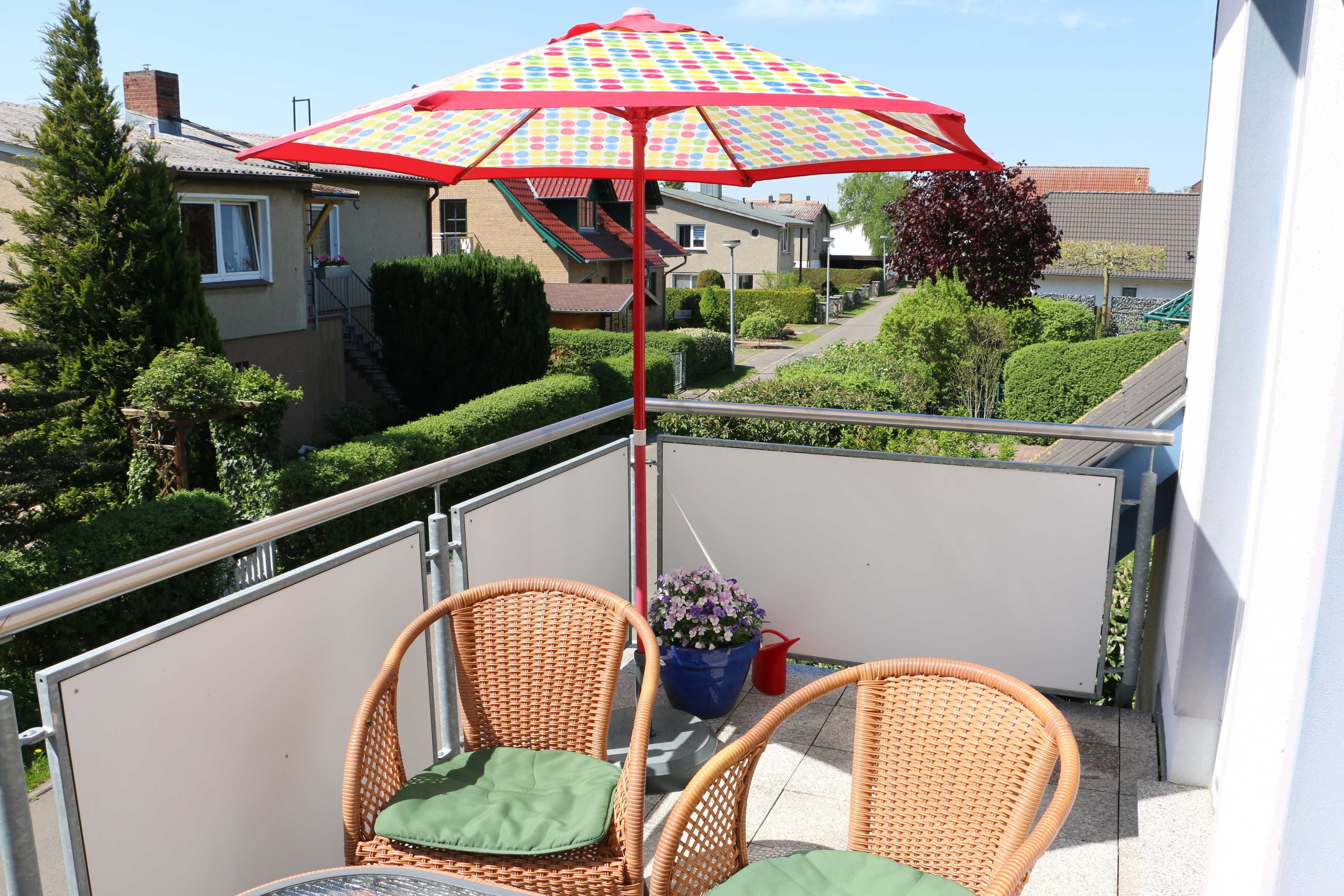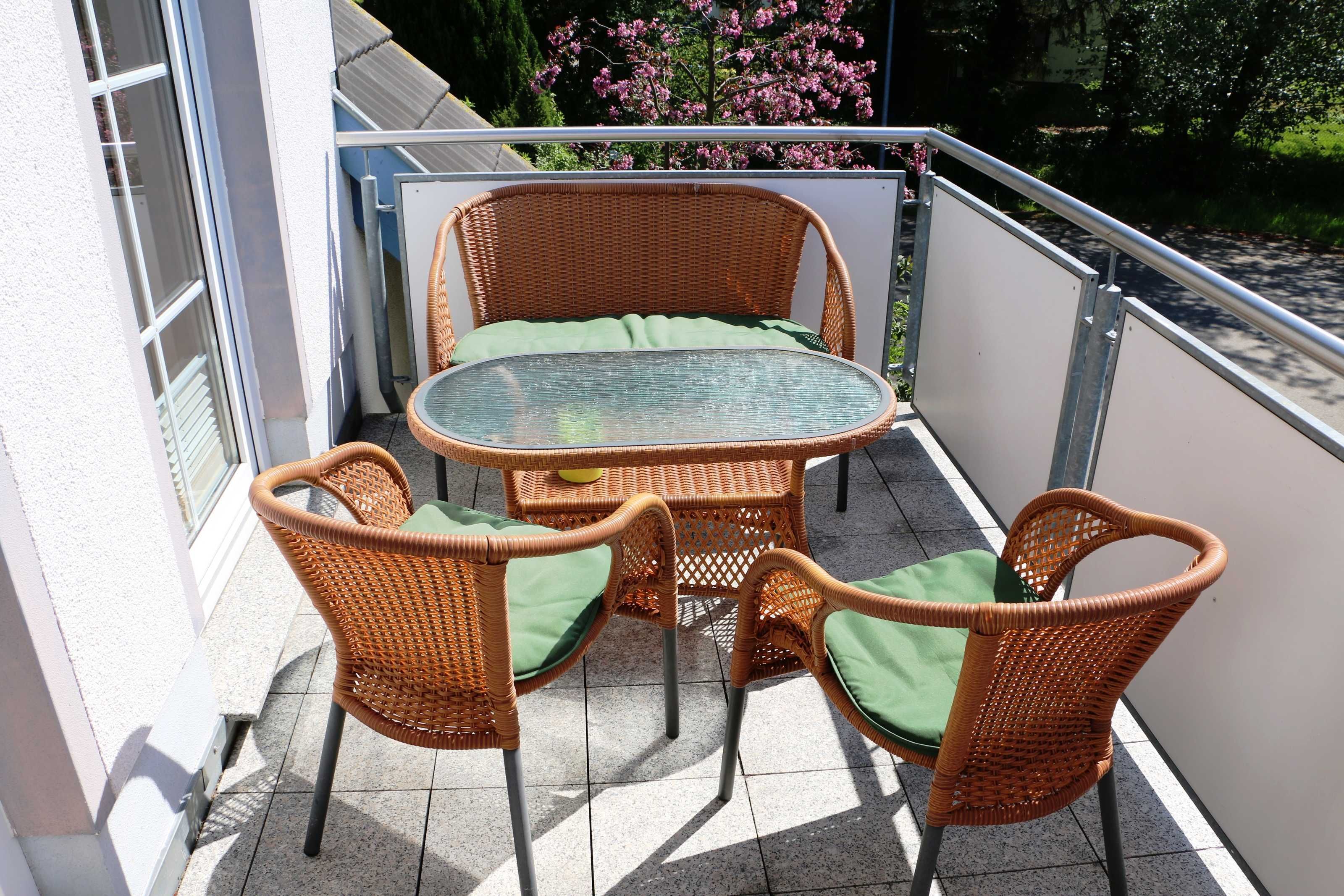 Der möblierte Balkon lädt zum Verweilen oder frühstücken ein.