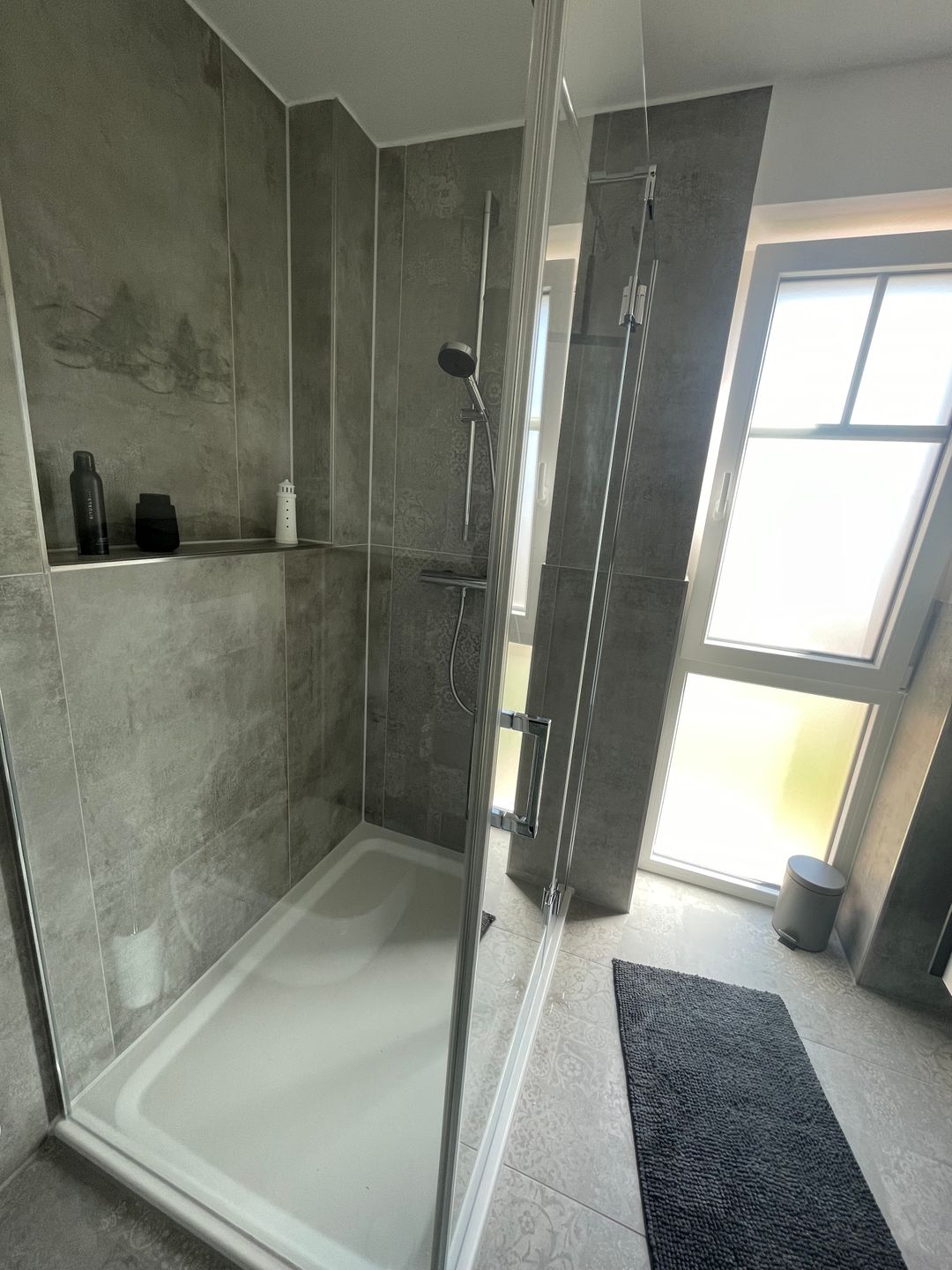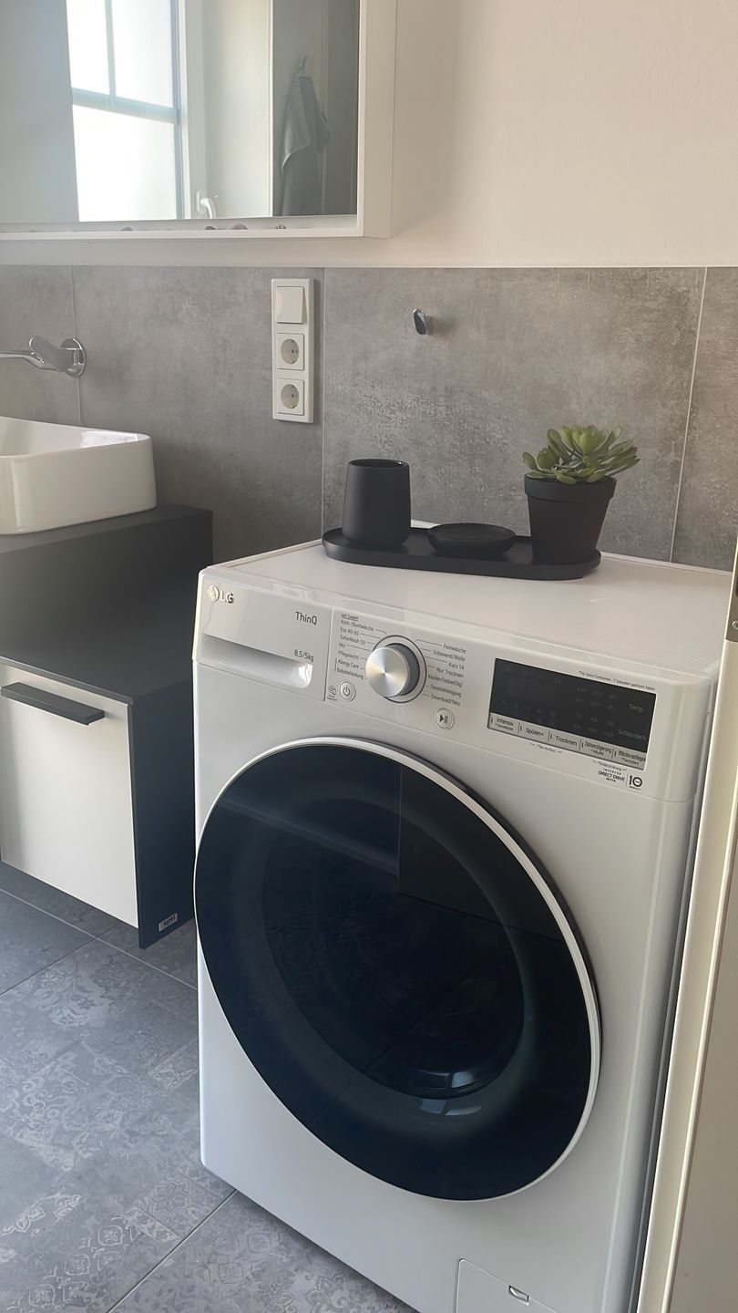Das Bad ist klein, aber fein. Es verfügt über eine großzügige bodengleiche Dusche mit Glasabtrennung und einem schönen Design Waschtischmöbel sowie einem WC. Ebenfalls dort vorhanden ist ein Waschtrockner und ein Fön.