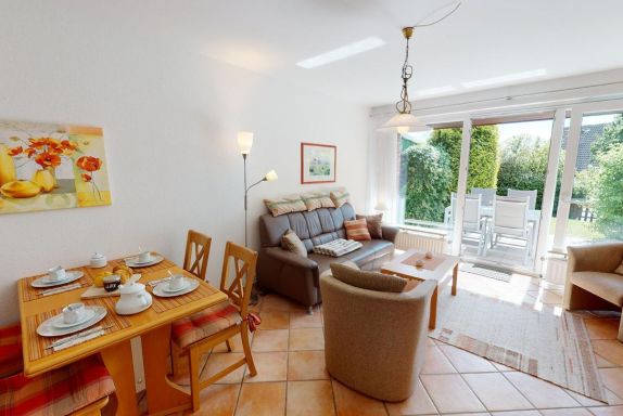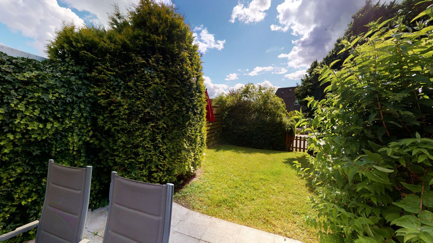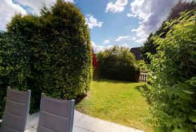 Vom Wohnzimmer aus gelangen Sie auf die schöne Sonnenterrasse mit bequemen Sitzmöbeln und zugehörigem kleinen Gartengrundstück. Der Garten ist umzäunt und somit perfekt für einen Urlaub mit Kindern und Hunden!