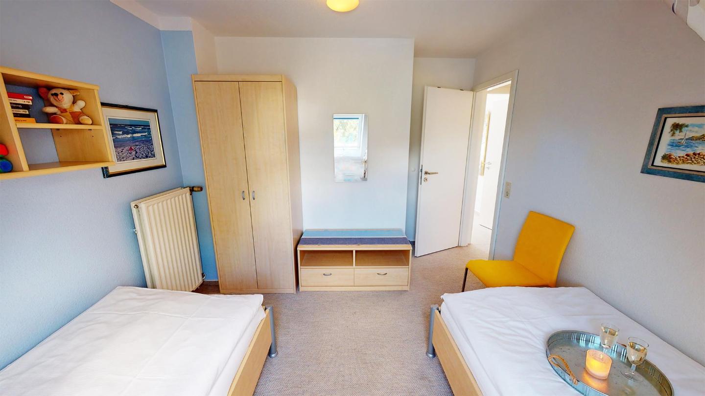 Im Erdgeschoss befinden sich das gemütliche Wohnzimmer mit einem offenen Essbereich und angrenzender Küchenzeile sowie ein Duschbad mit WC. Über die Treppe gelangt man in das Obergeschoss. Hier stehen zwei Schlafzimmer zu Ihrer Verfügung. Eines mit einem großem Doppelbett. Das Zweite mit zwei bequemen Einzelbetten.