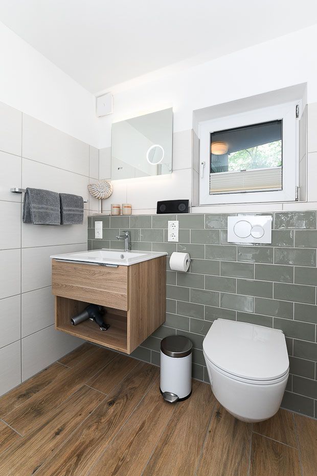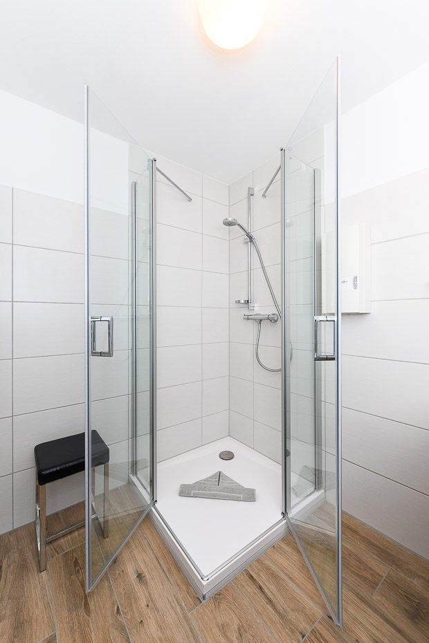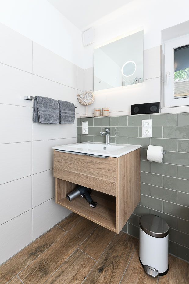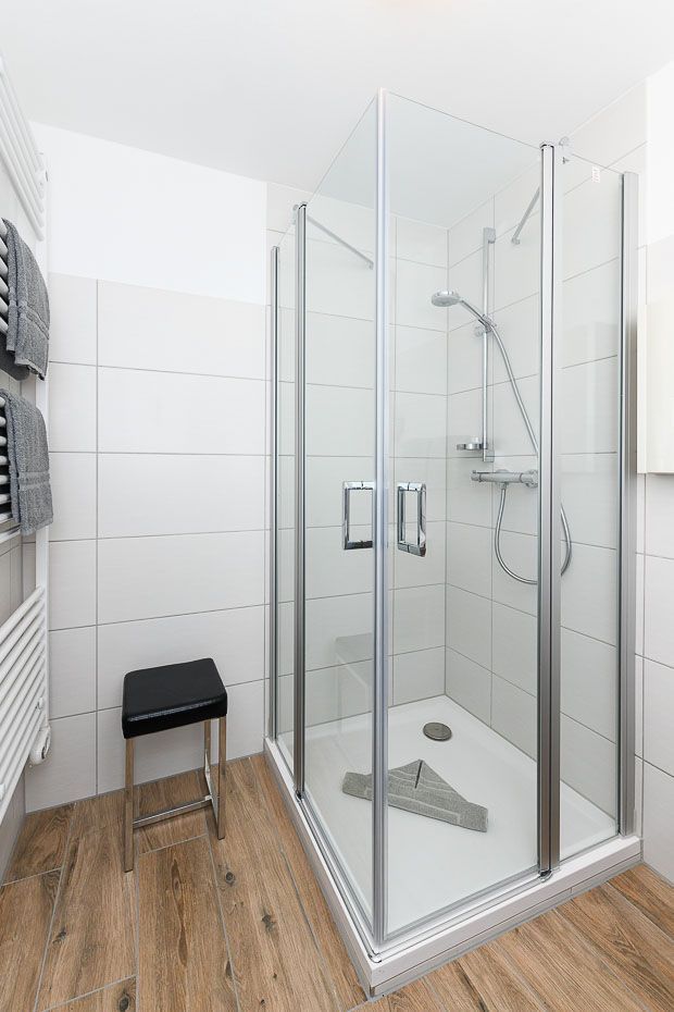 Badezimmer mit Dusche, Waschtisch und WC