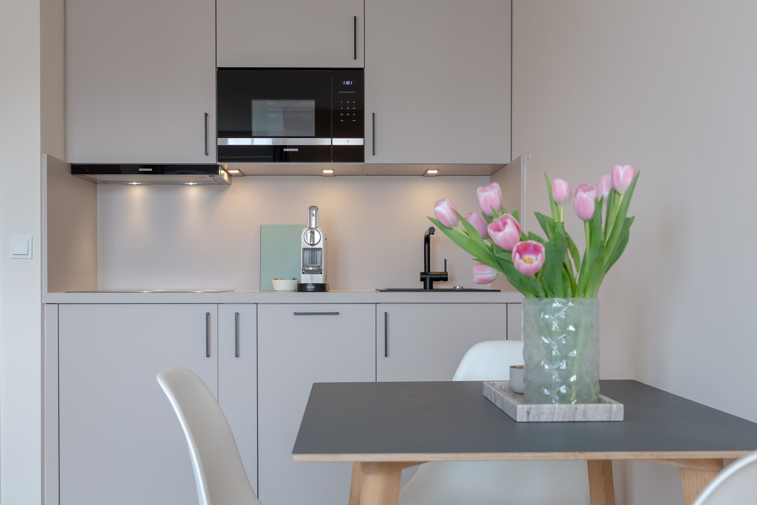 OG: Wohnbereich mit Flat-TV und WLAN, integrierte, vollausgestattete Küchenzeile mit Spülmaschine, Cerankochfeld, Mikrowelle mit Grill, Nespressomaschine, Kühlschrank mit Gefrierfach, Toaster und Wasserkocher, Schlafzimmer mit Einzelbett, Safe, Bad mit Dusche und WC, sonniger Südbalkon, eigener Strandkorb in der Sonnenkuhle