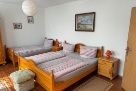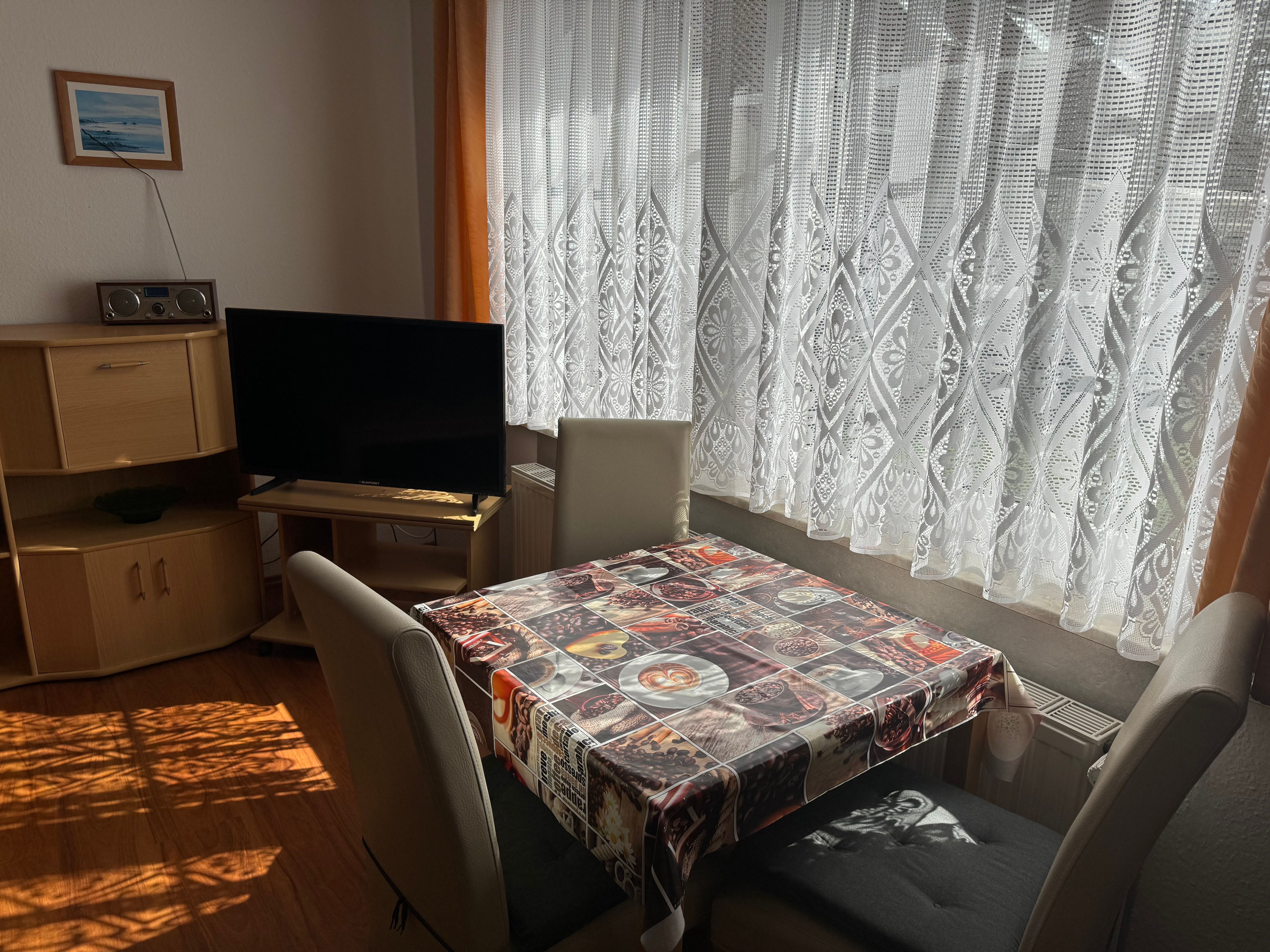 Ausstattung mit Wohnraum (Polstermöbel, Esstisch, LCD-TV, Radio), offene Küchenzeile (E-Kochfeld, Kühlschrank, Mikrowelle, div. Küchengeräte), Schlafraum (Doppelbett, Einzelbett), DU/WC, Elektroheizung.