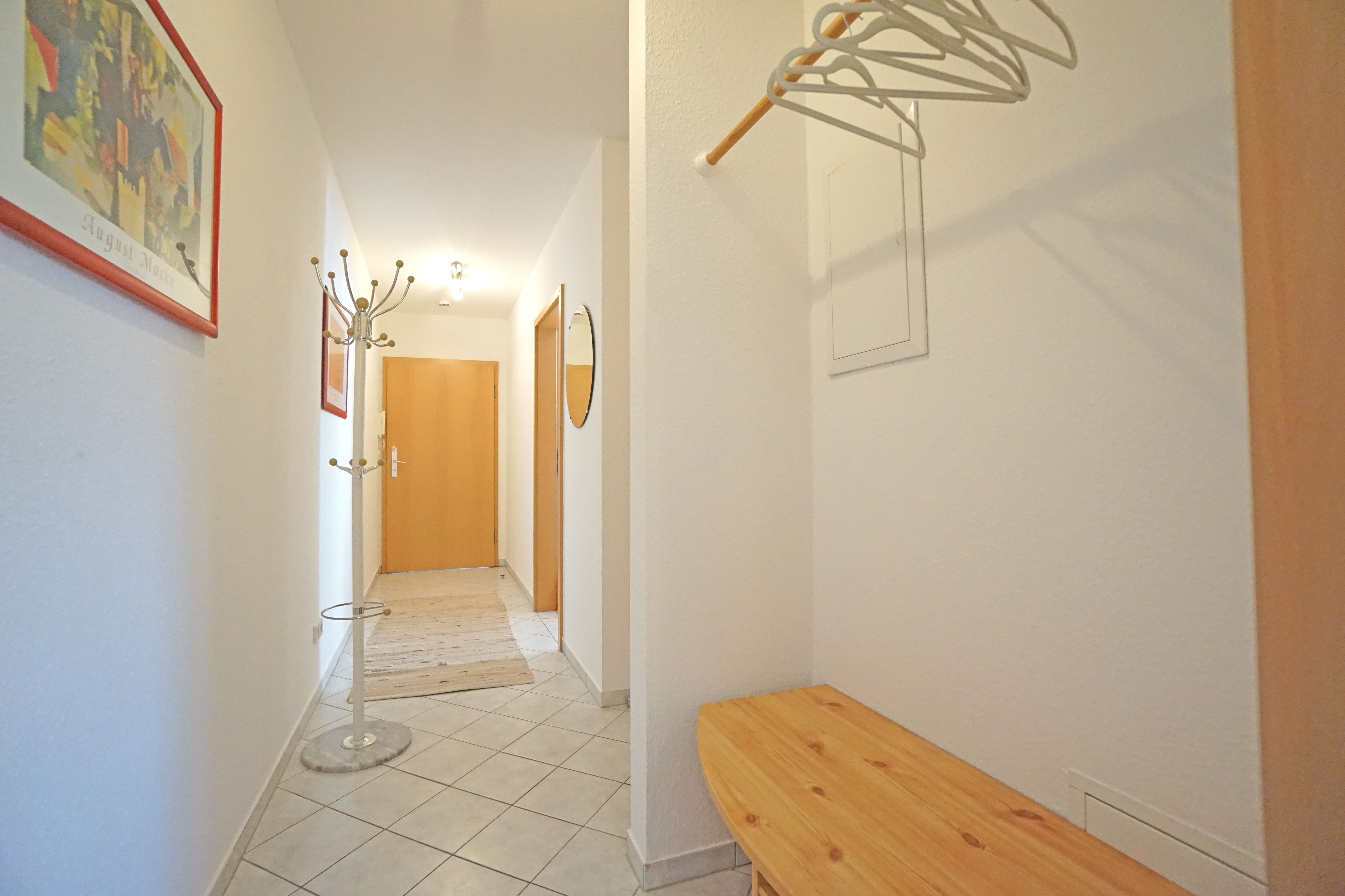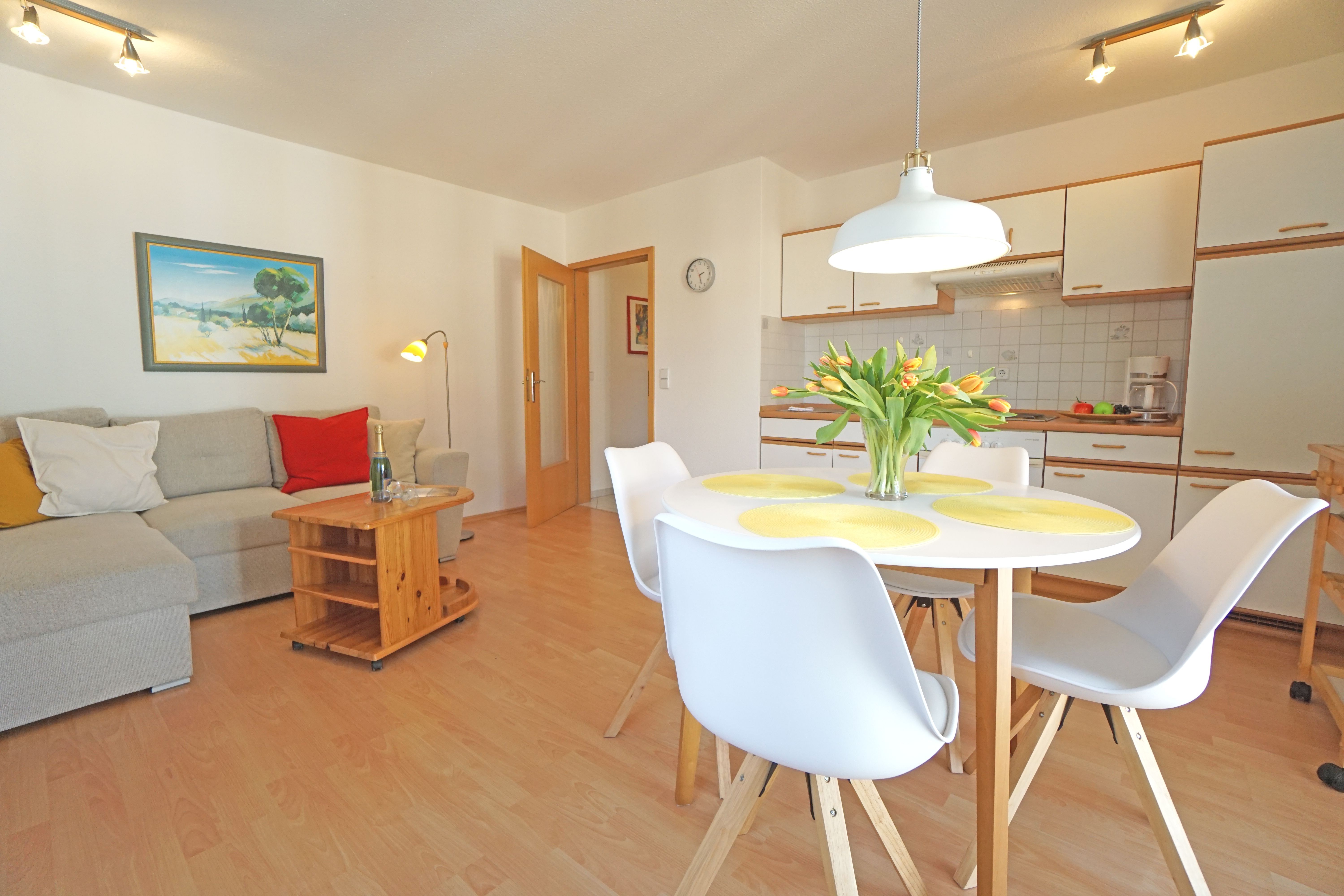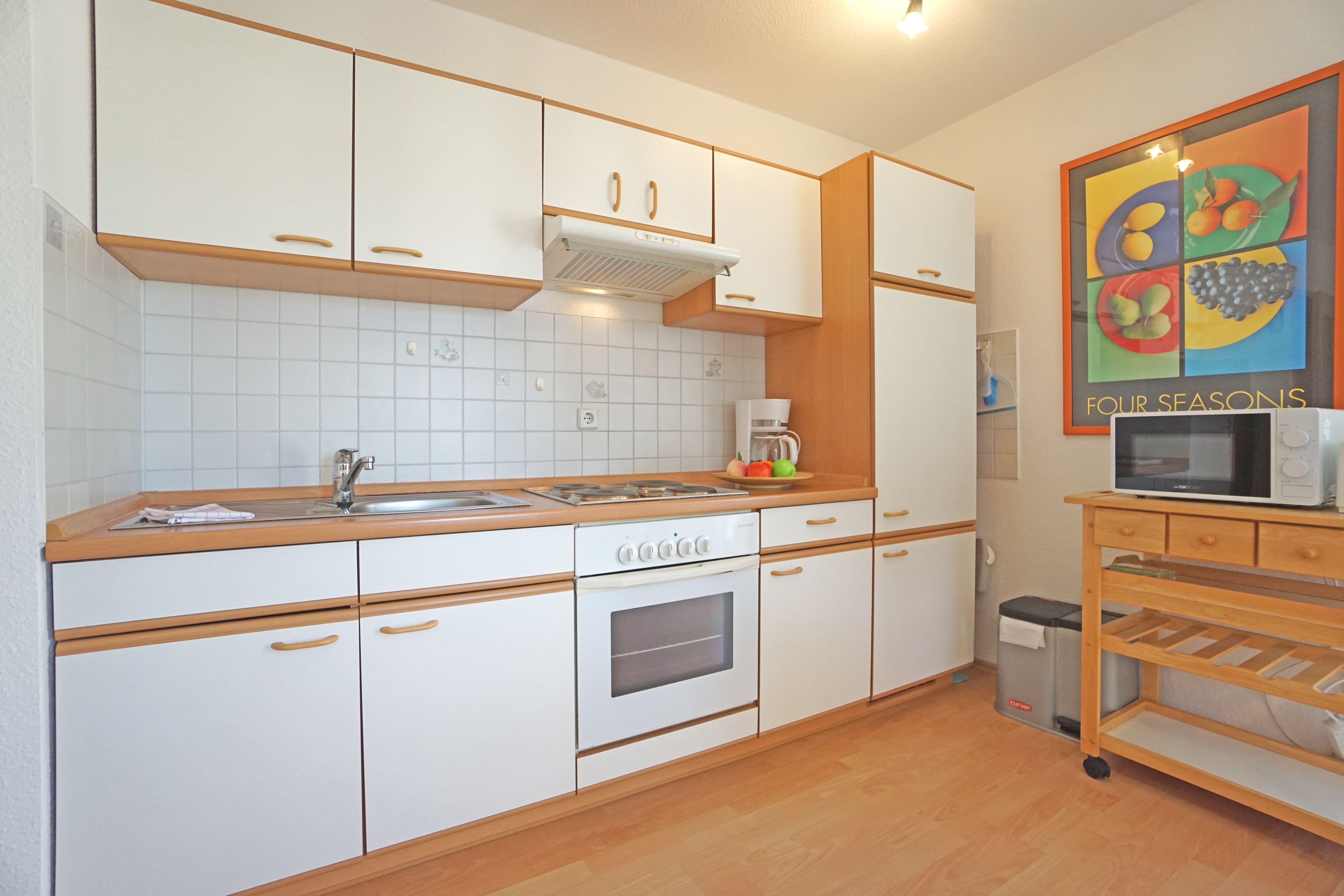 Die helle und freundliche 2-Zimmer-Ferienwohnung verfügt über ein komfortabel eingerichtetes Wohnzimmer (Flachbildfernseher, etc.) mit einer Küchenzeile (Mikrowelle, Kaffeemaschine, Wasserkocher etc.). Desweiteren befindet sich im Wohnzimmer eine gemütliche Schlafcouch und im Schlafzimmer ein großes Doppelbett (180x200 cm). Ein Duschbad ist vorhanden.