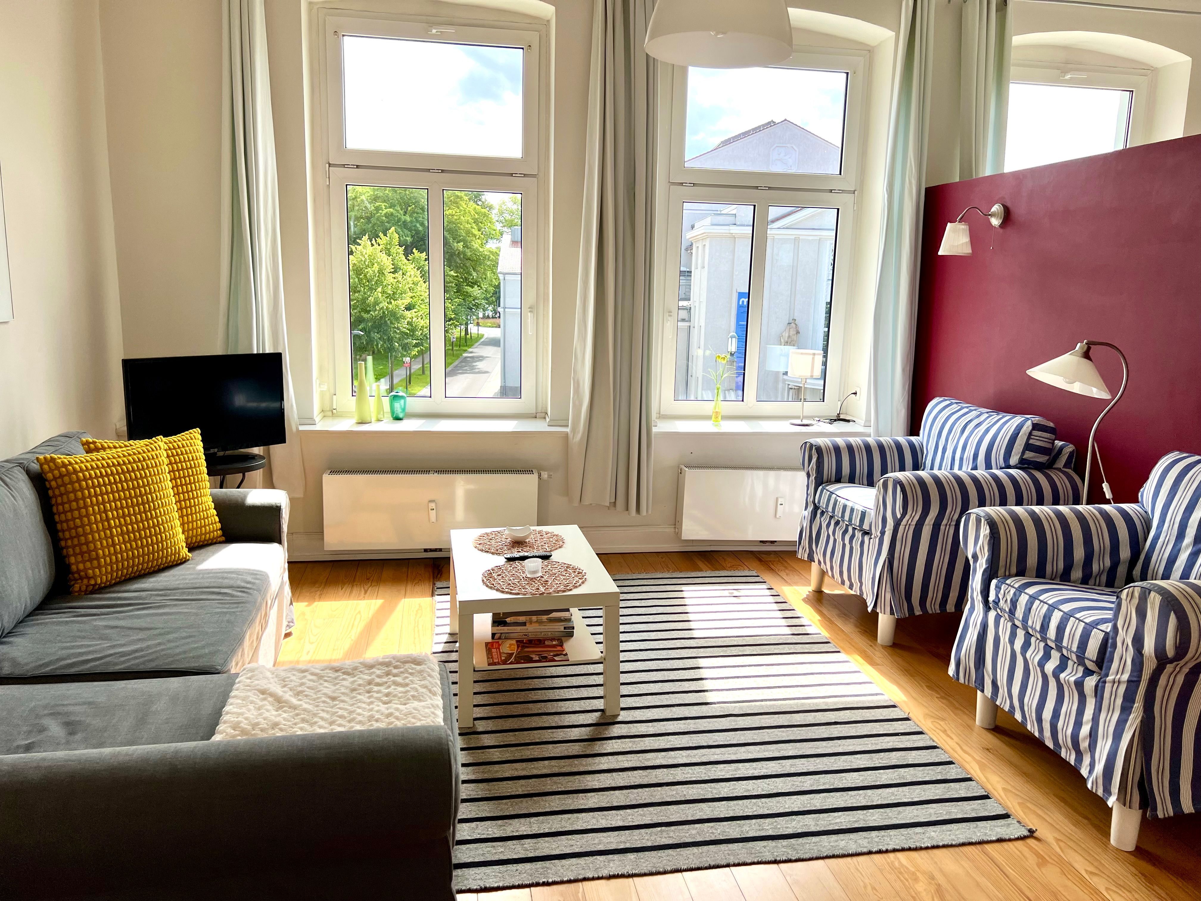 Das modern eingerichtete, markante Jugendstil-Haus liegt auf der Altstadtinsel und am Strelasund, umgeben vom frisch renovierten Theater, vom Kniepertor und von der mittelalterlichen Stadtmauer.