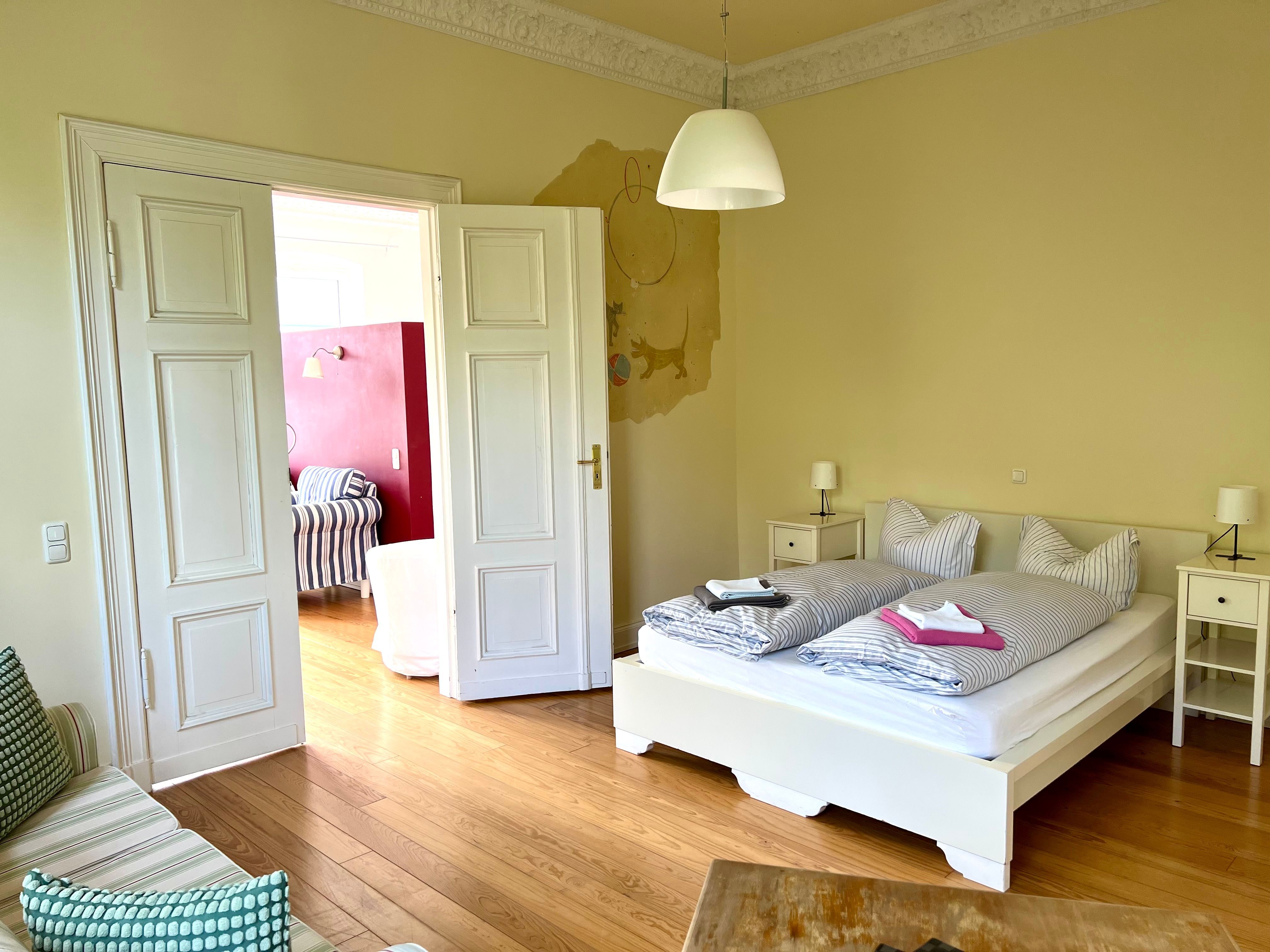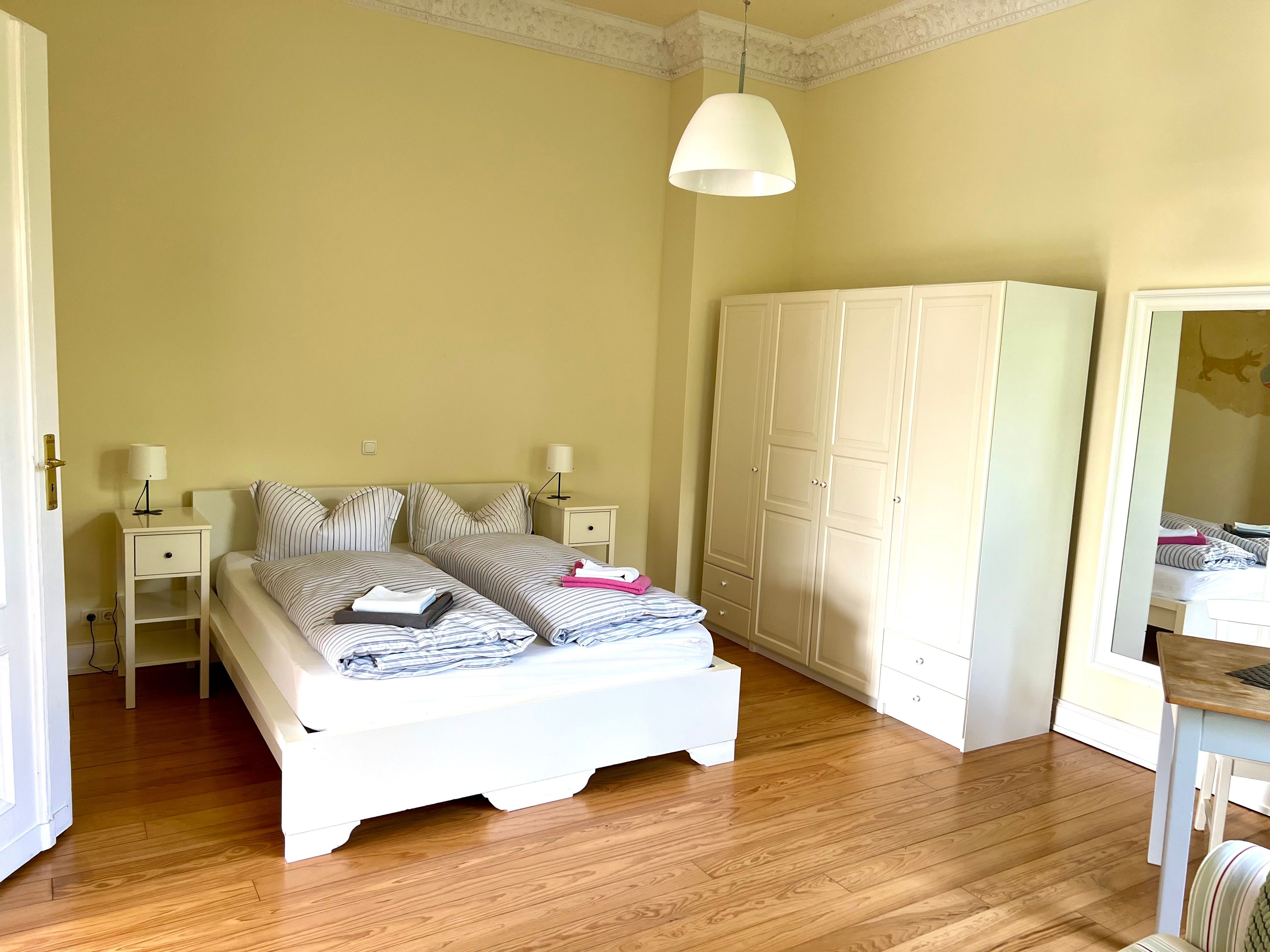 Die Wohnung ist insgesamt 76,84 qm groß und bietet zwei große, helle Wohnräume mit Deckenstuck, eine Küche mit Essplatz, ein Wohnzimmer mit Bettsofa (160 x 200 cm) und Arbeitsplatz, ein Schlafzimmer mit Doppelbett (160 x 200 cm) und Sofa und Dusche/WC mit behindertengerechten Einrichtungen. WLan kostenfrei.