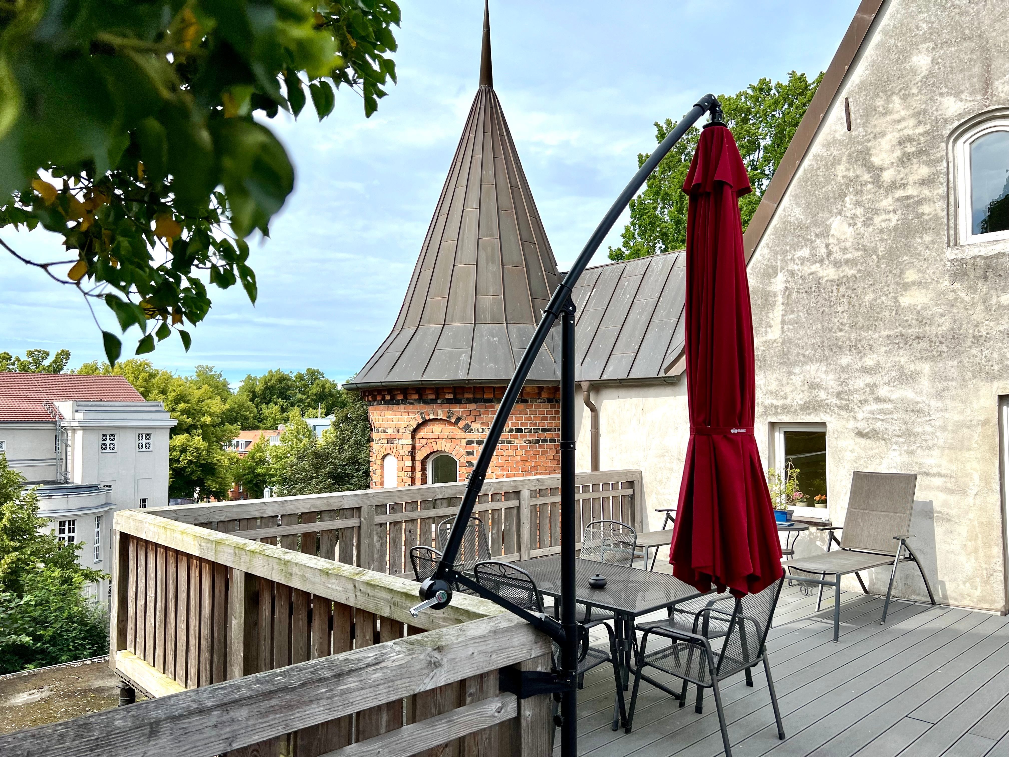 Ebenso steht eine große Gemeinschaftsdachterrasse zur Verfügung. Hier haben Sie einen fantastischen Bilck auf das Stralsunder Theater.